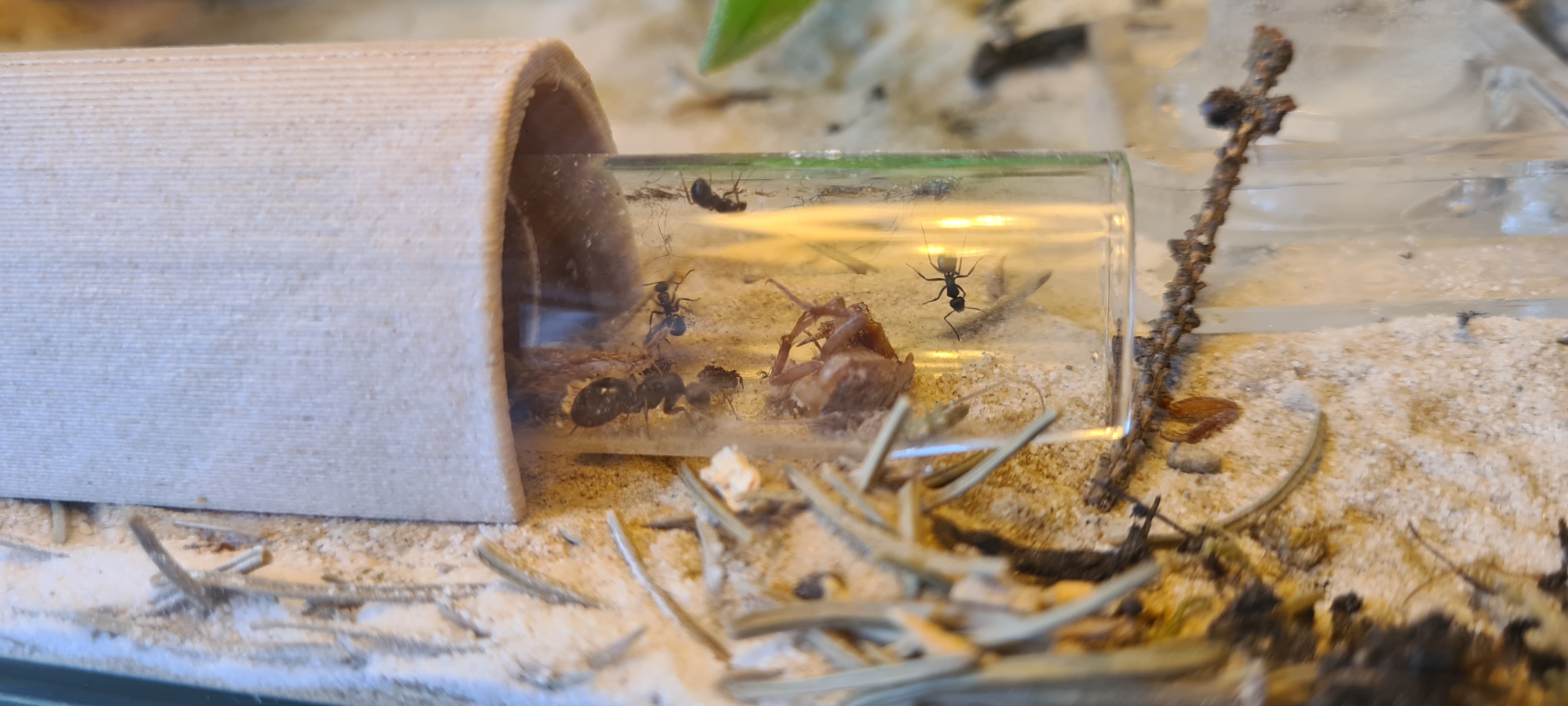 Nunja, habe sie eingefroren und hoffe sie schlafen einfach ein. Und eine Schockoschabe hab ich den Ameisen hingelegt, natĂŒrlich tot. Zappelt noch bisschen. Also die gröĂten und mutigsten JĂ€ger sind meine MĂ€dels noch nicht. Sind sehr sehr zurĂŒckhaltend. Aber wenn man bedenkt das die Kolonie so klein und verletztlich ist dann ist das am Ende verstĂ€ndlich das sie vorsichtig sind