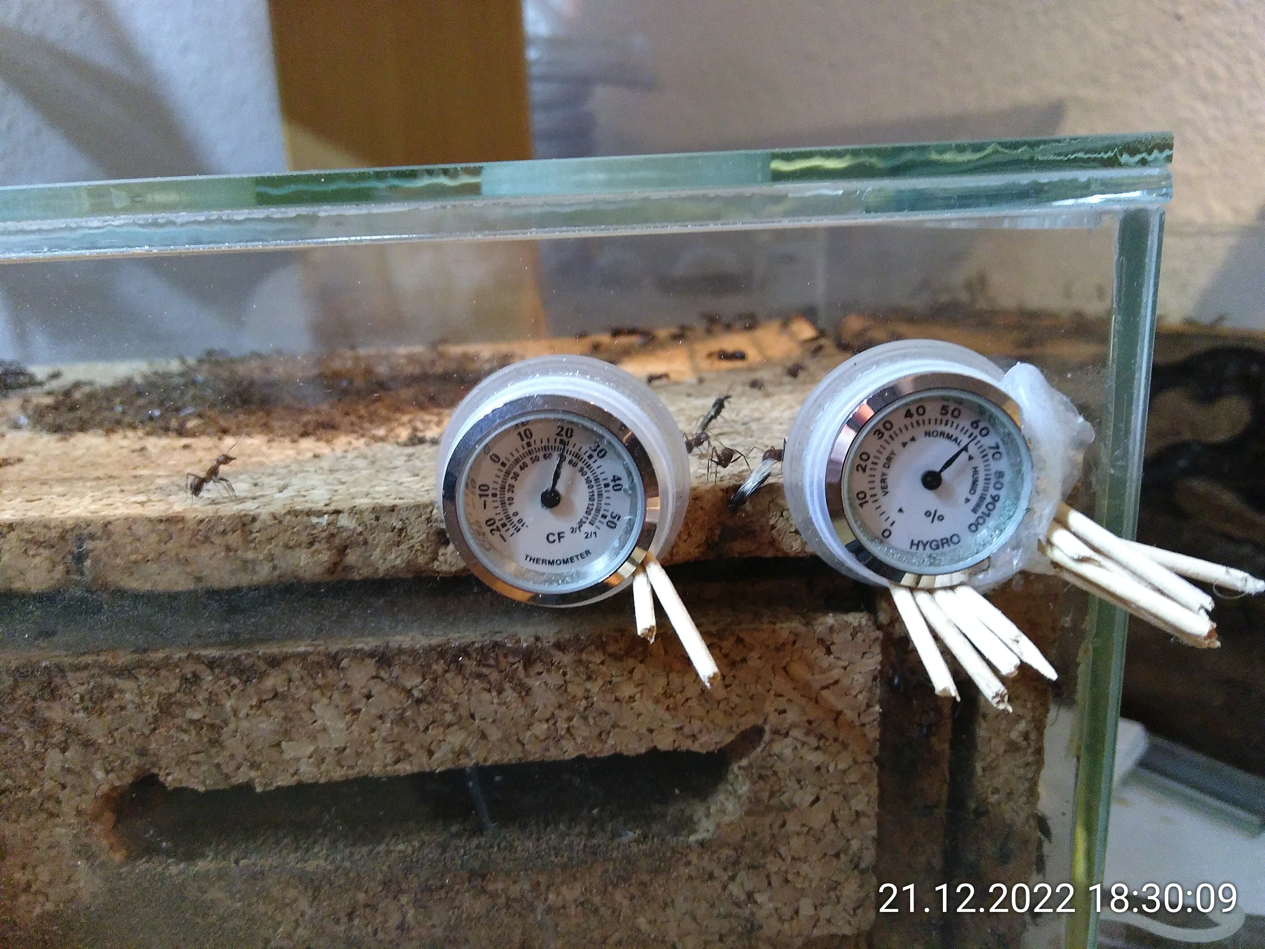 An der Stelle muss ich mir echt was überlegen. Ich fürchte, ich komme nicht drum rum, die beiden Instrumente samt Halterung entfernen zu müssen. Ich benötige sie sowieso nicht mehr. Das Thermometer funktioniert nicht zuverlässig und die Feuchte regeln sie eh, wie sie es mögen. Ich weiß auch schon, wie das Endergebnis aussehen soll. Der Plan sind dünne Plexiglasscheiben, die ich mal für eine passende Gelegenheit aufbewahrt habe. Die ist jetzt gekommen.