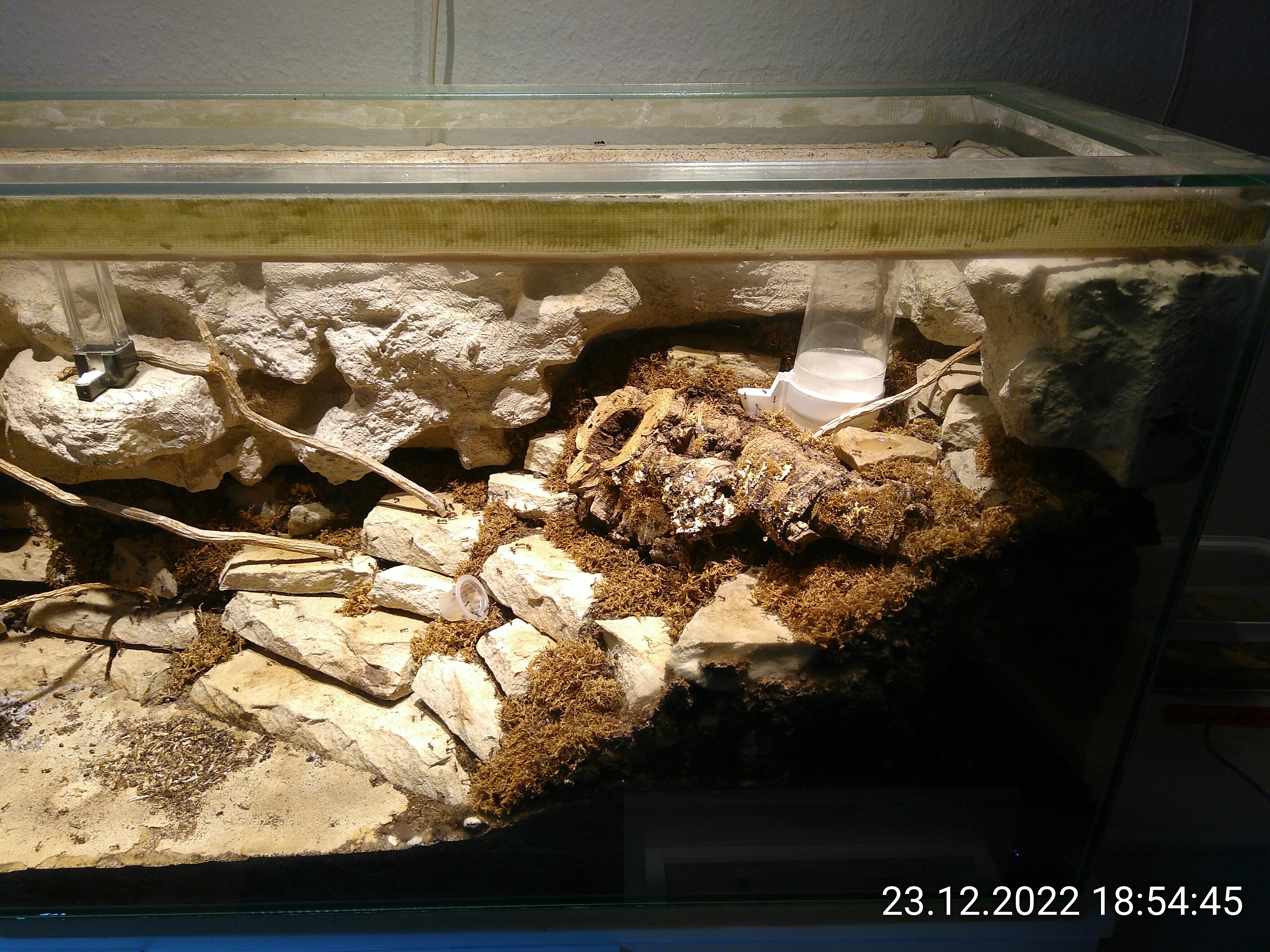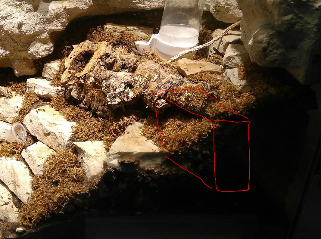 Hinter den Steinen ist nicht nur Erde. Ich habe auch einige Dinge eingegraben, die ihnen beim Nisten helfen sollten. Das waren 2 oder 3 Stücke teils morsches Holz, so was wie ein kleines Regal (mehrere Ebenen aus kleinen Holzbrettchen) und ein größerer Block DigFix. Wahrscheinlich habe ich noch irgendwas vergessen.