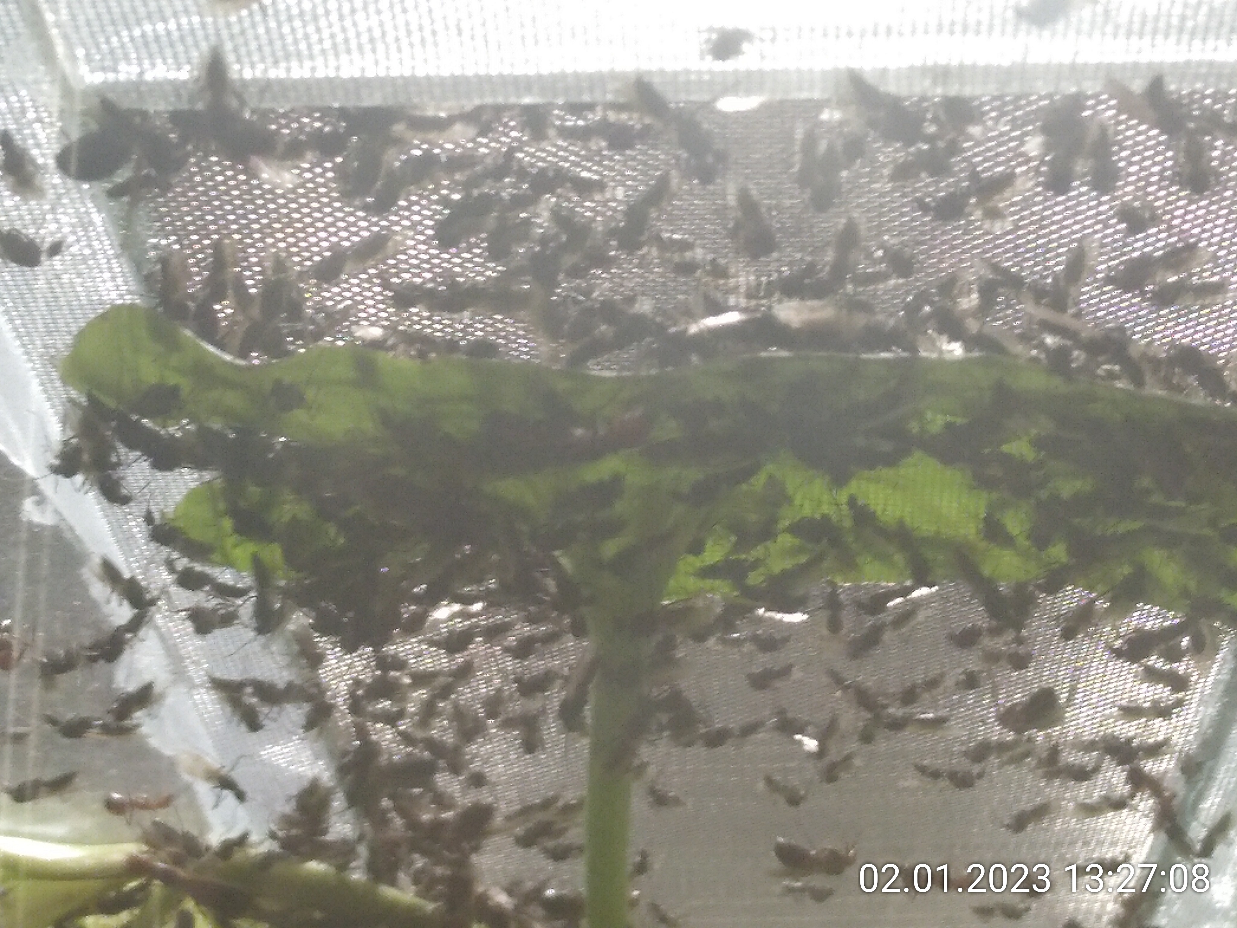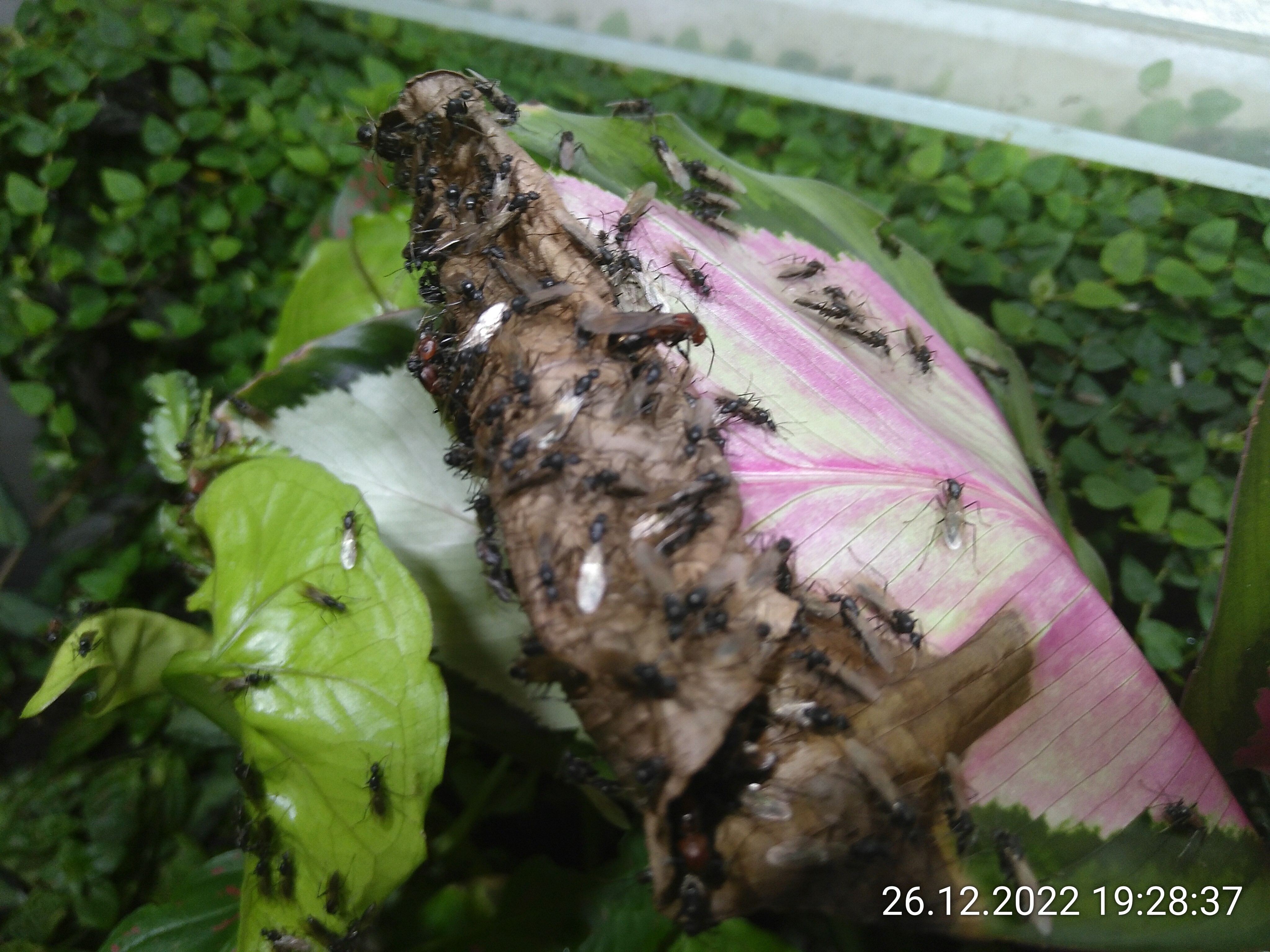 Heute Nachmittag habe ich kurz hintereinander vier Ameisen außen am Steinbruch gesehen. Um den Ausbruchschutz habe ich mich wohl offensichtlich zu lange nicht mehr gekümmert. Irgendwo muss es eine Stelle geben, wo die Ölbarriere versagt. Ich habe beide Sperren wieder erneuert und damit ein paar Monate Ruhe. Im Dschungel ist Ausbruchschutz im Moment kein Thema. Sobald ich den Deckel öffne, gibt es mehrere Stellen, an denen sie von Pflanzen auf den Rahmen laufen können. So lange ich das nicht ändere, brauche ich auch keinen Ausbruchschutz.