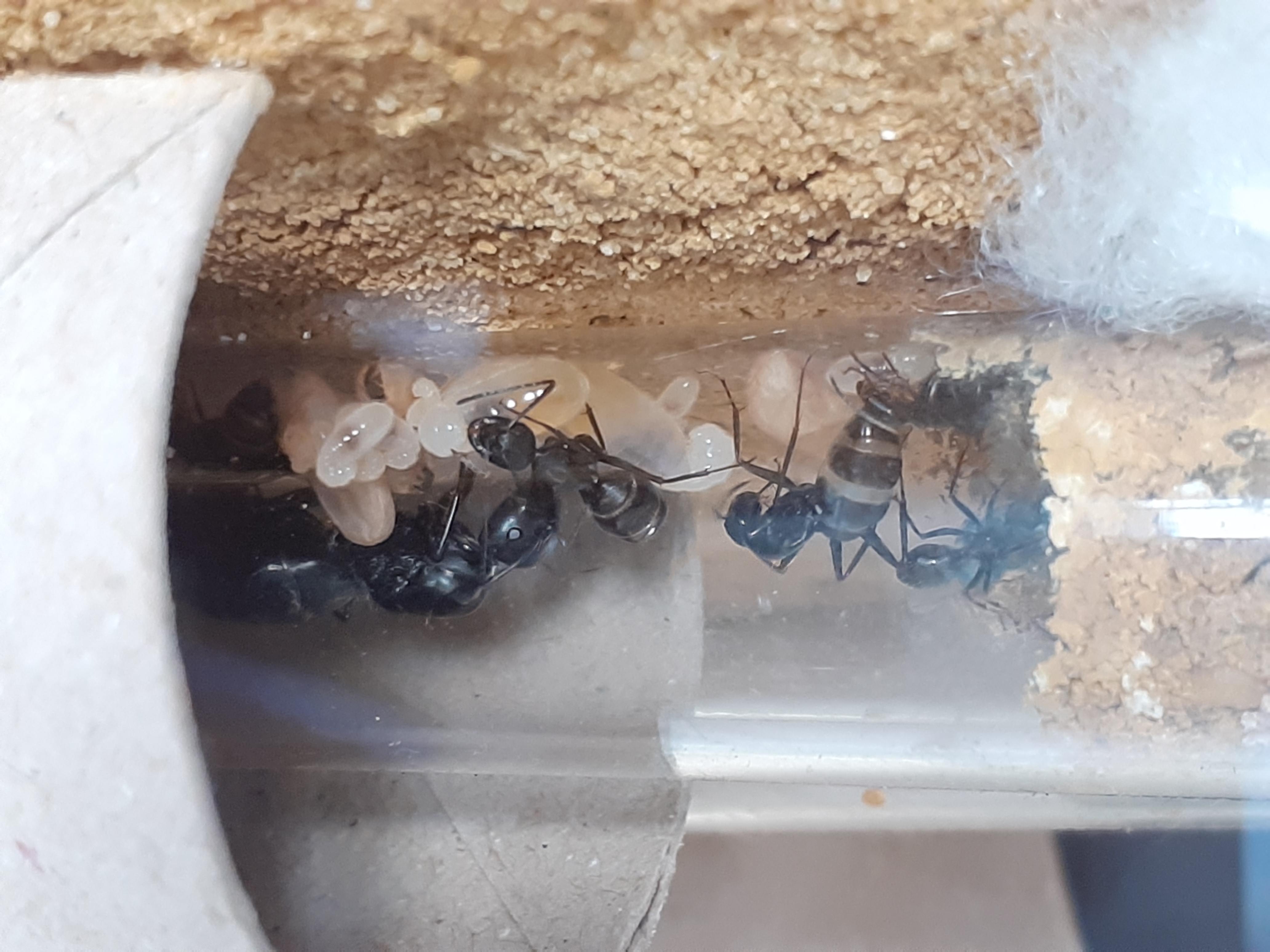 aktuell genieße ich es, regelmäßig ins Formicarium meiner Camponotus japonicus zu schauen. Regelmäßig lassen sich 1-4 Arbeiterinnen dabei beobachten, wie sie furagieren oder sonstigem Tagwerk nachgehen. Ich habe schon überlegt, sie wieder an einen Ort zu stellen, an dem man sie besser beobachten kann. Eine neue Arbeiterin ist geschlüpft, jetzt sind es wieder einmal 10, und ich bin sicher, wir können den Fluch brechen und der Kolonie weiter beim Wachsen zusehen.