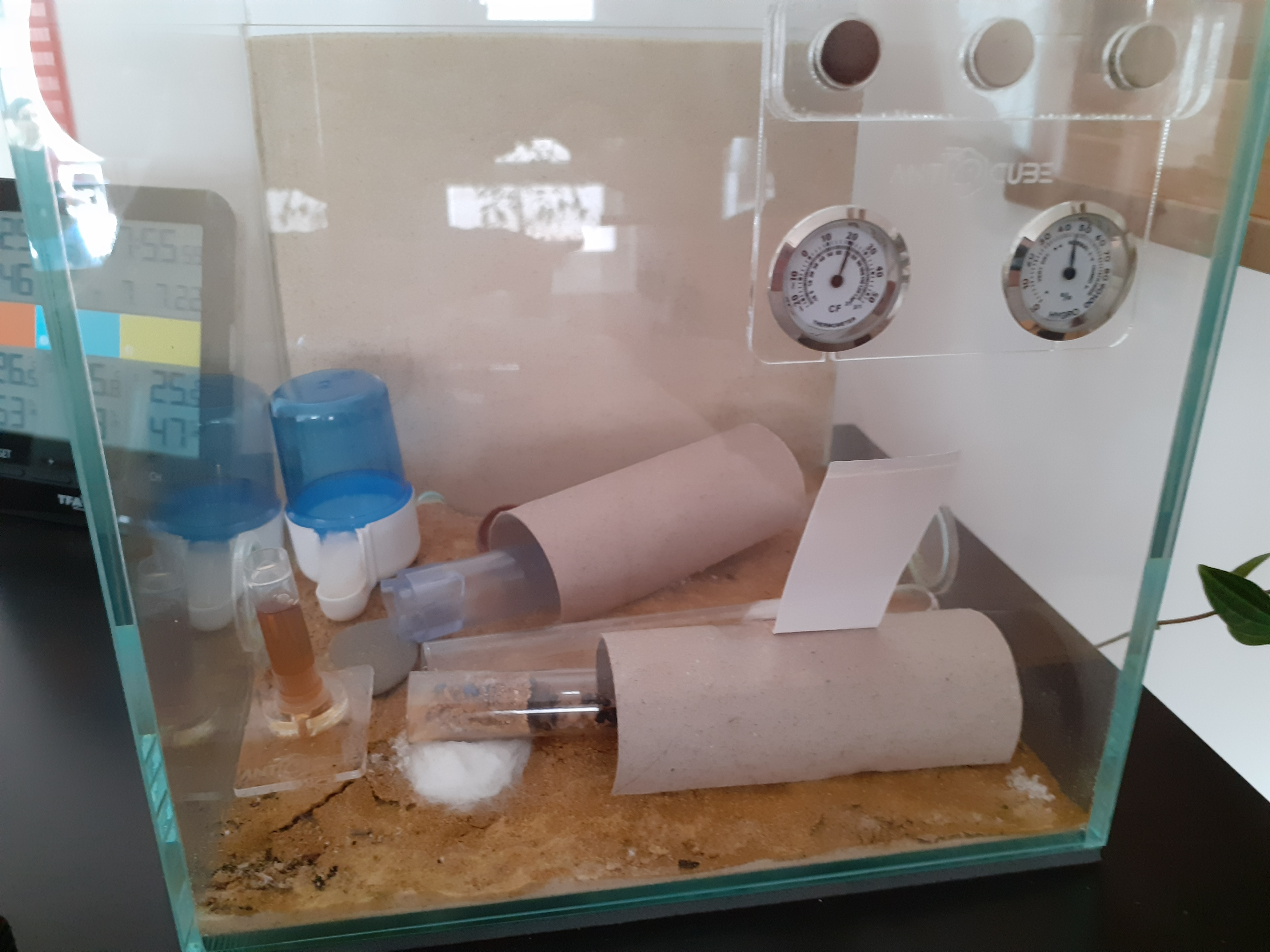 Es sind jetzt erstmals 11 Arbeiterinnen. Allerdings bleiben sie ihrem Röhrchen auch nach über 9 Monaten treu, obwohl sie schon über eine mehrlagige Schicht aus Brut laufen müssen, zum sich darin zu bewegen. Die nächste Ameise ist auch schon auf dem Weg. Ich habe gestern Abend eine Ameise vor dem Eingang sitzen sehen. Ich spekuliere Mal, dass sie nicht rein durfte - weil voll. Den oberen Eingang des Korknestes habe ich mit Korkmehl verschlossen, damit Madame 5,5 nicht auf die Idee kommt, die Scheibe hochzuklettern. Vor die unteren Eingänge habe ich Steine als Stufen, für den leichten Zugang, gelegt. Das zweite Neströhrchen, ursprünglich als Umzugsoption gedacht und später von den Ameisen als Futterkammer genutzt, konnte ich schon entfernen. Das Platzproblem wird aber stetig zunehmen, da jede Menge Brut vorhanden ist, die noch wachsen wird.
