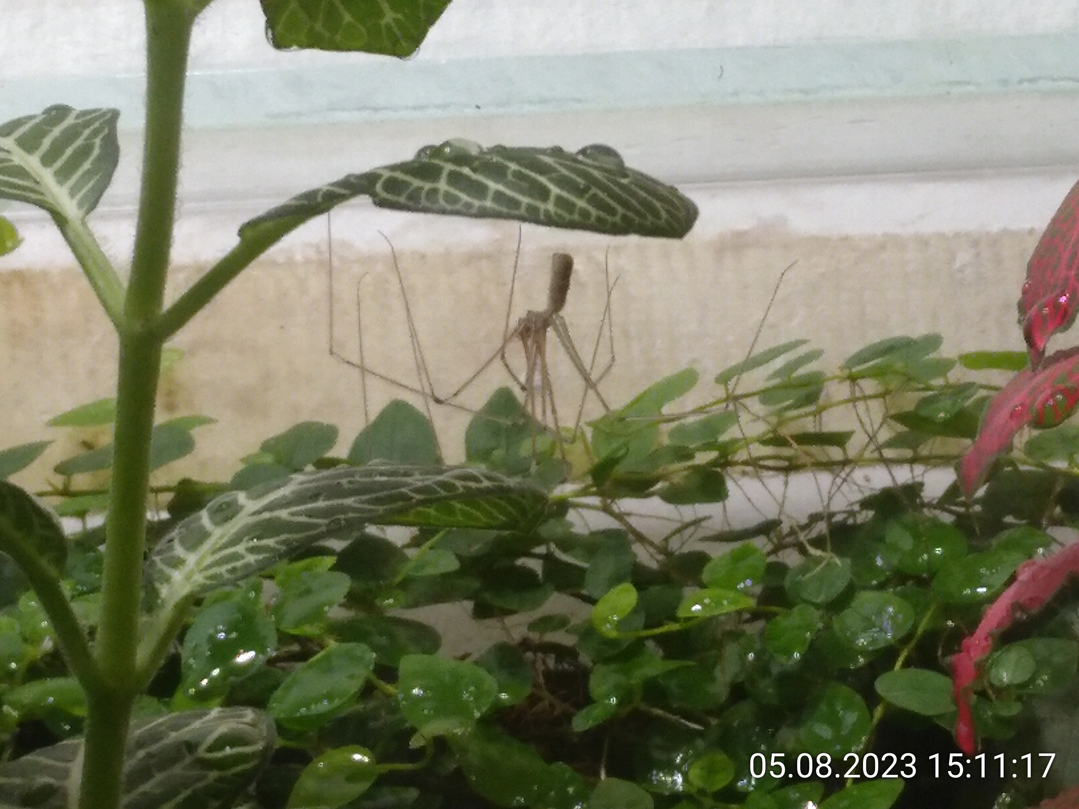 fangen wir mal mit den Spinnen an. Die zwei, die sich als Jäger sehen, waren bis gestern noch beide da. Gerade kann ich nur eine sehen. Sie haben aber beide die selbe Taktik genutzt, um nicht in Kontakt mit den NIcos zu kommen. Und zwar haben sie sich in einem der wenigen offenen Räume im Dickicht von oben abgeseilt. Clever!