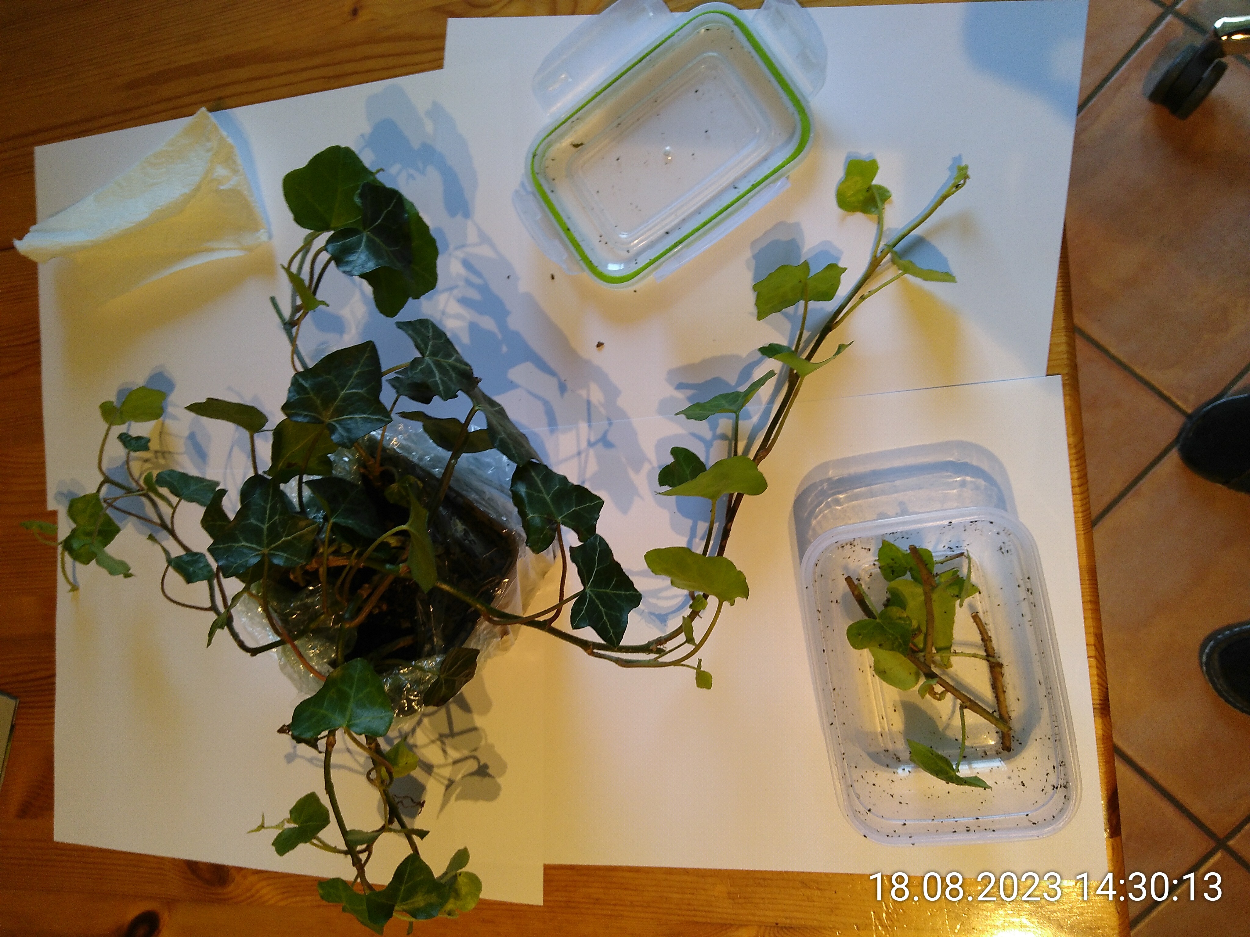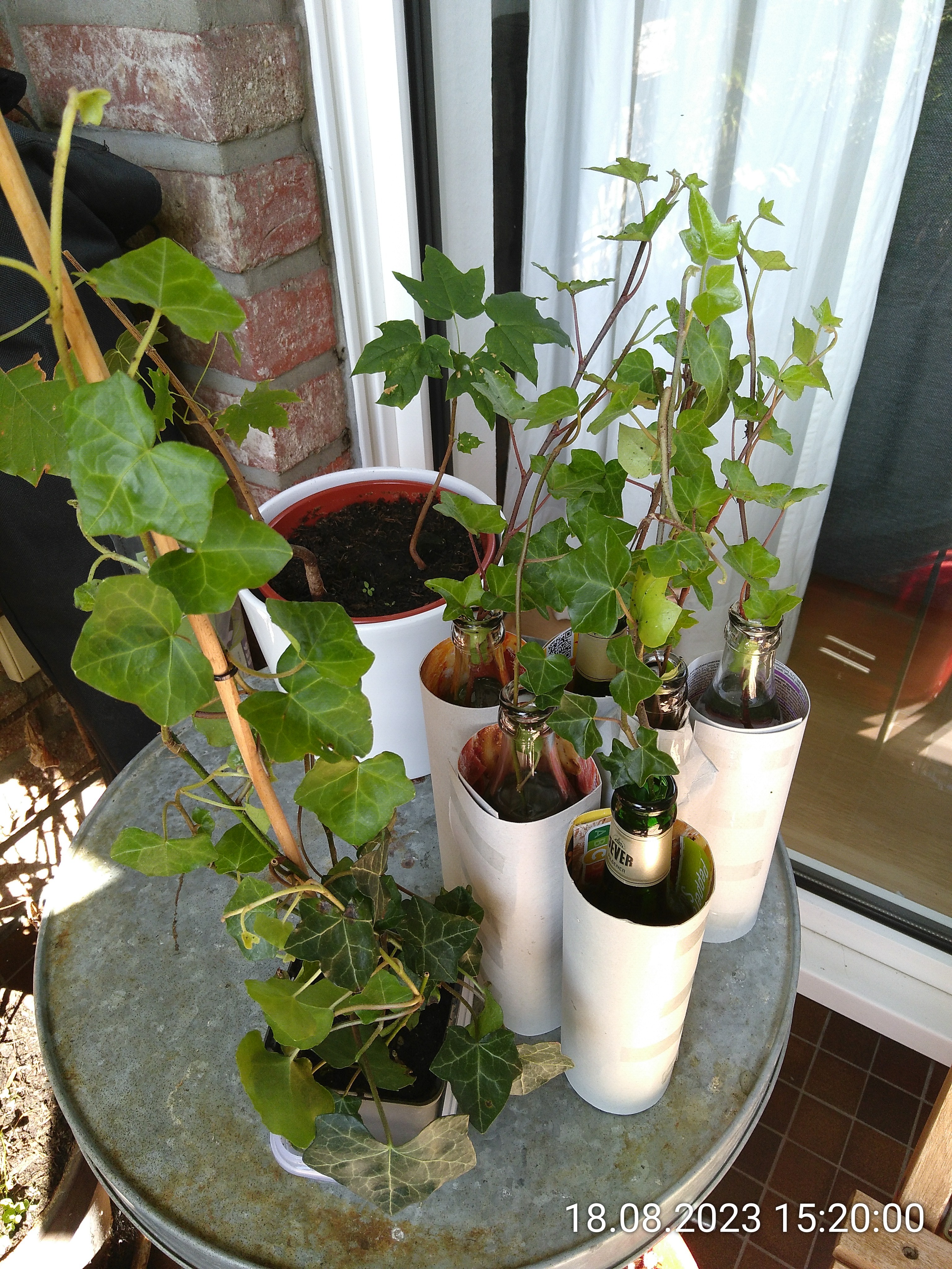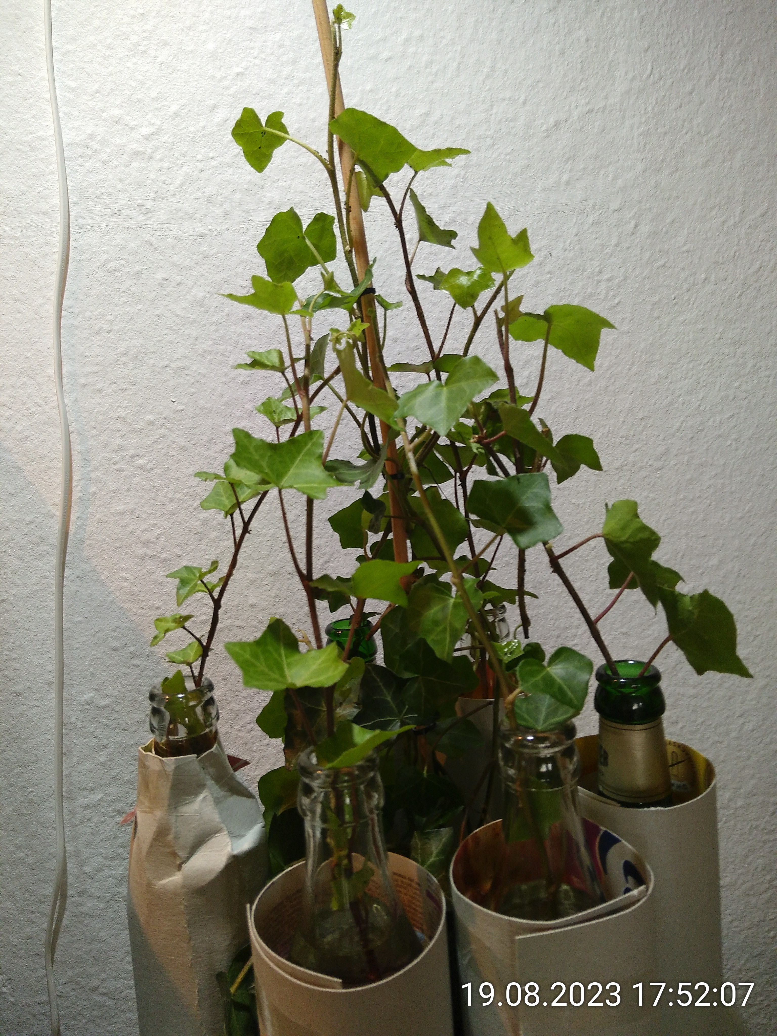 Nachdem ich mir am Donnerstag in der Nachbarschaft ein paar Efeutriebe besorgt habe, kamen diese in agedunkelte Flschen mit Waser zum wurzeln.