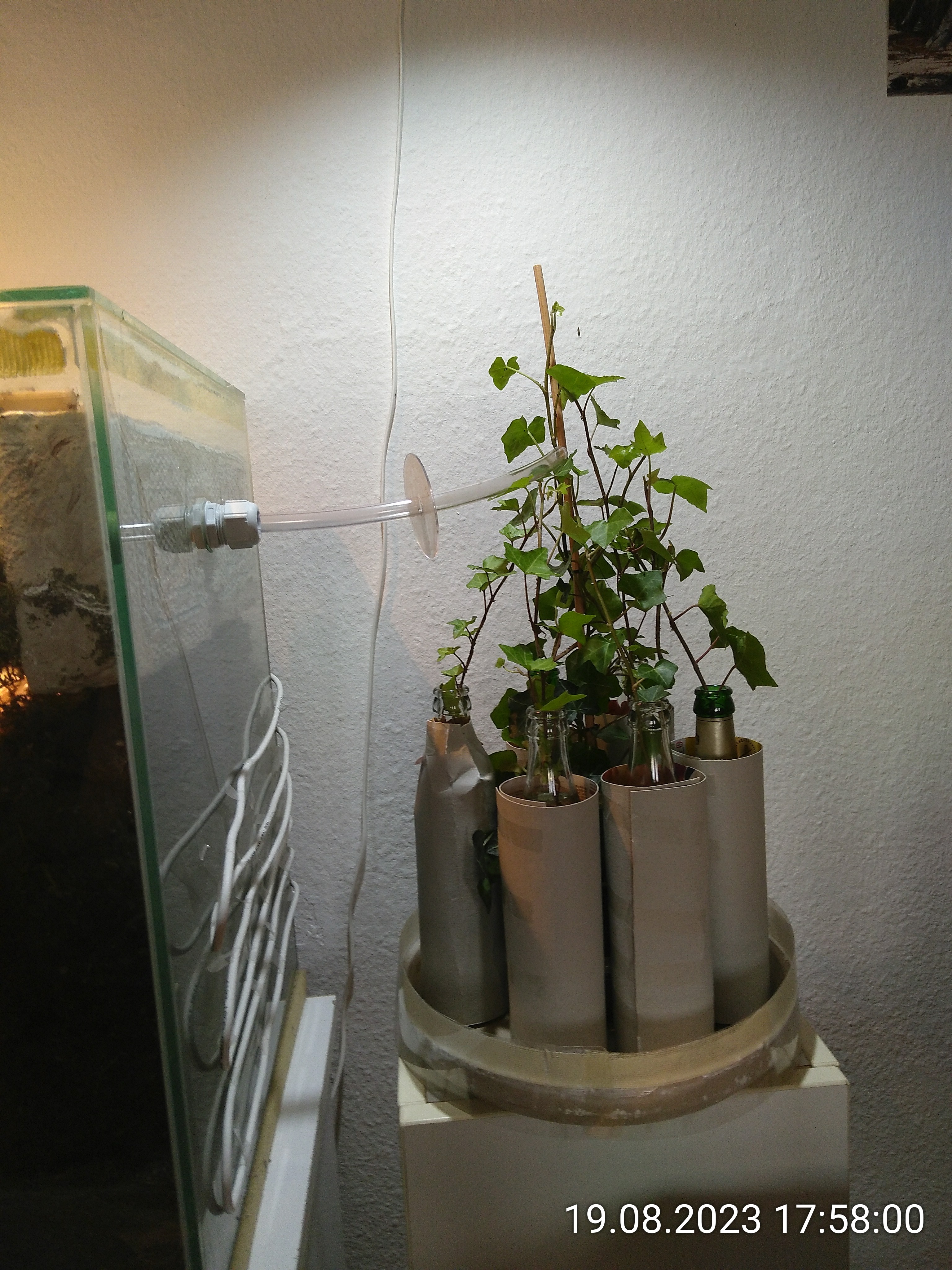 Auf Joschis Rat hin sind die Pflanzen aber nach wenigen Stunden ins Wohnzimmer gewandert. Ohne Ameisenschutz werden die Läuse wohl schnell Opfer von Schlupfwespen. Heute Nachmittag habe ich dann eine provisorische Lösung im Nicoversum aufgebaut.