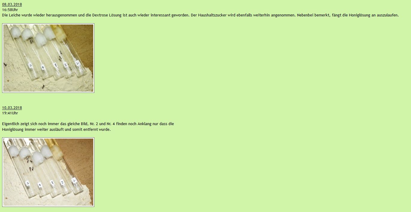 Bei ihm war es ein Futterversuch. Aber er hat die selben Ergebnisse bekommen wie ich. Nach ein paar Tagen lief seine Honiglösung aus. Die anderen Zuckerlösungen waren stabil.