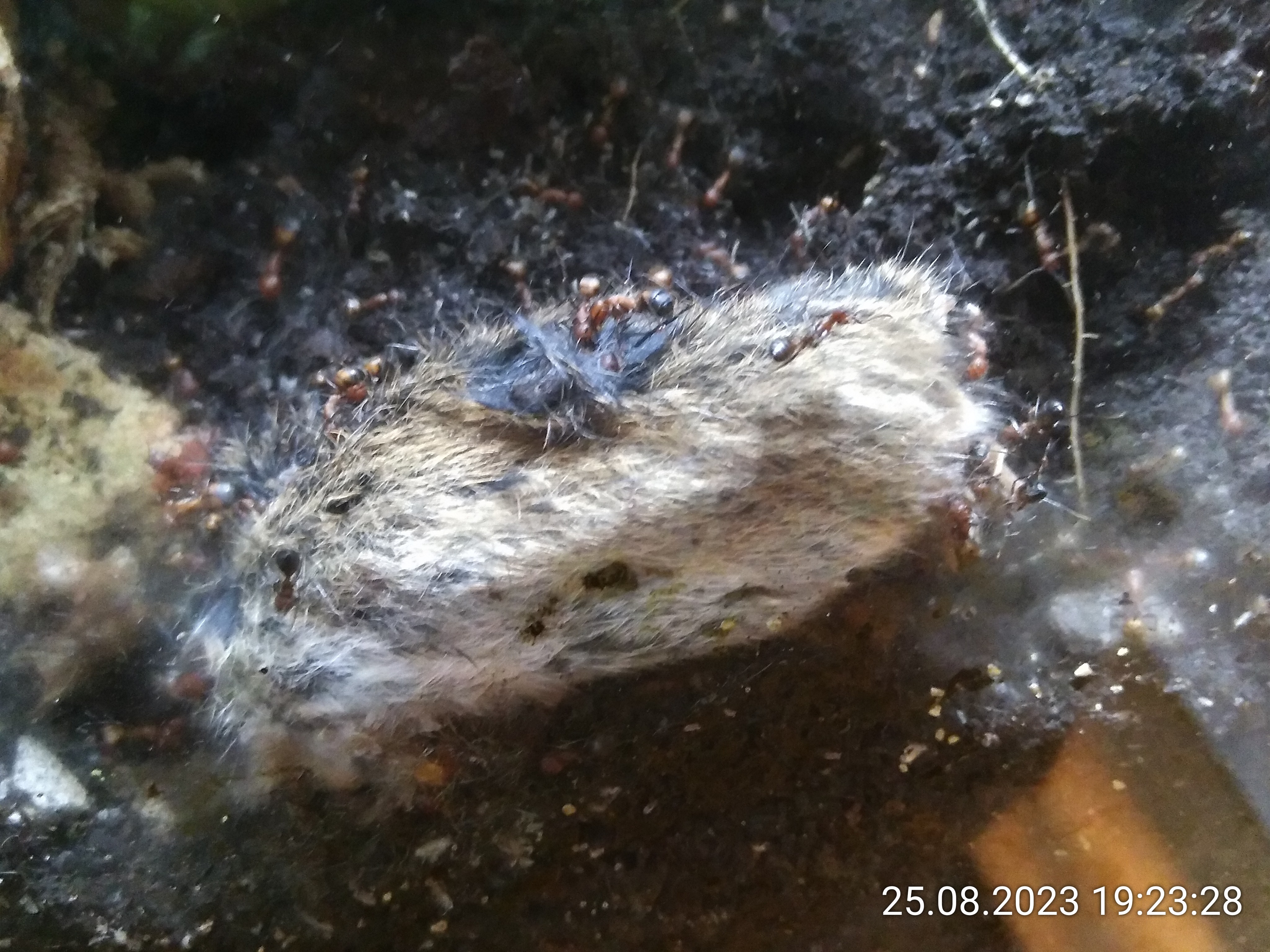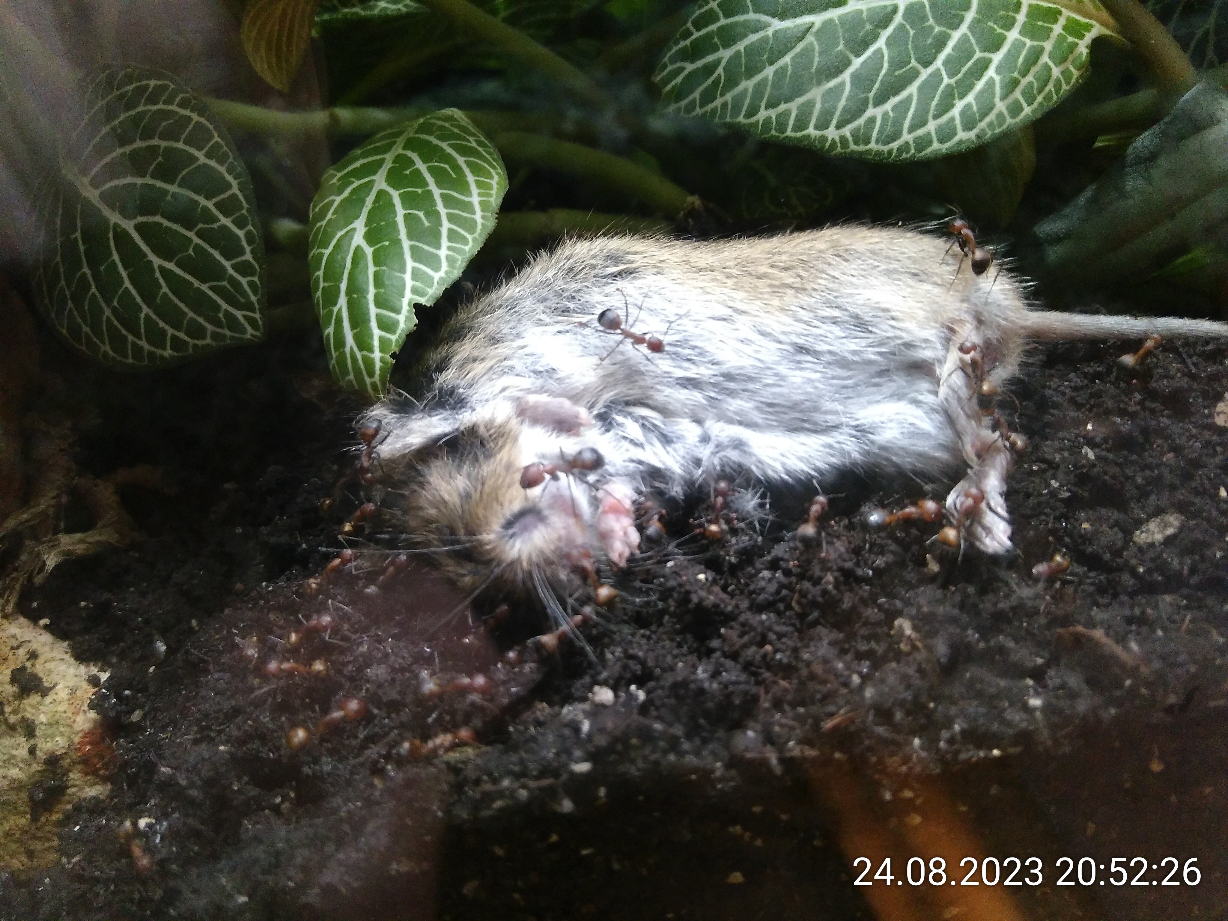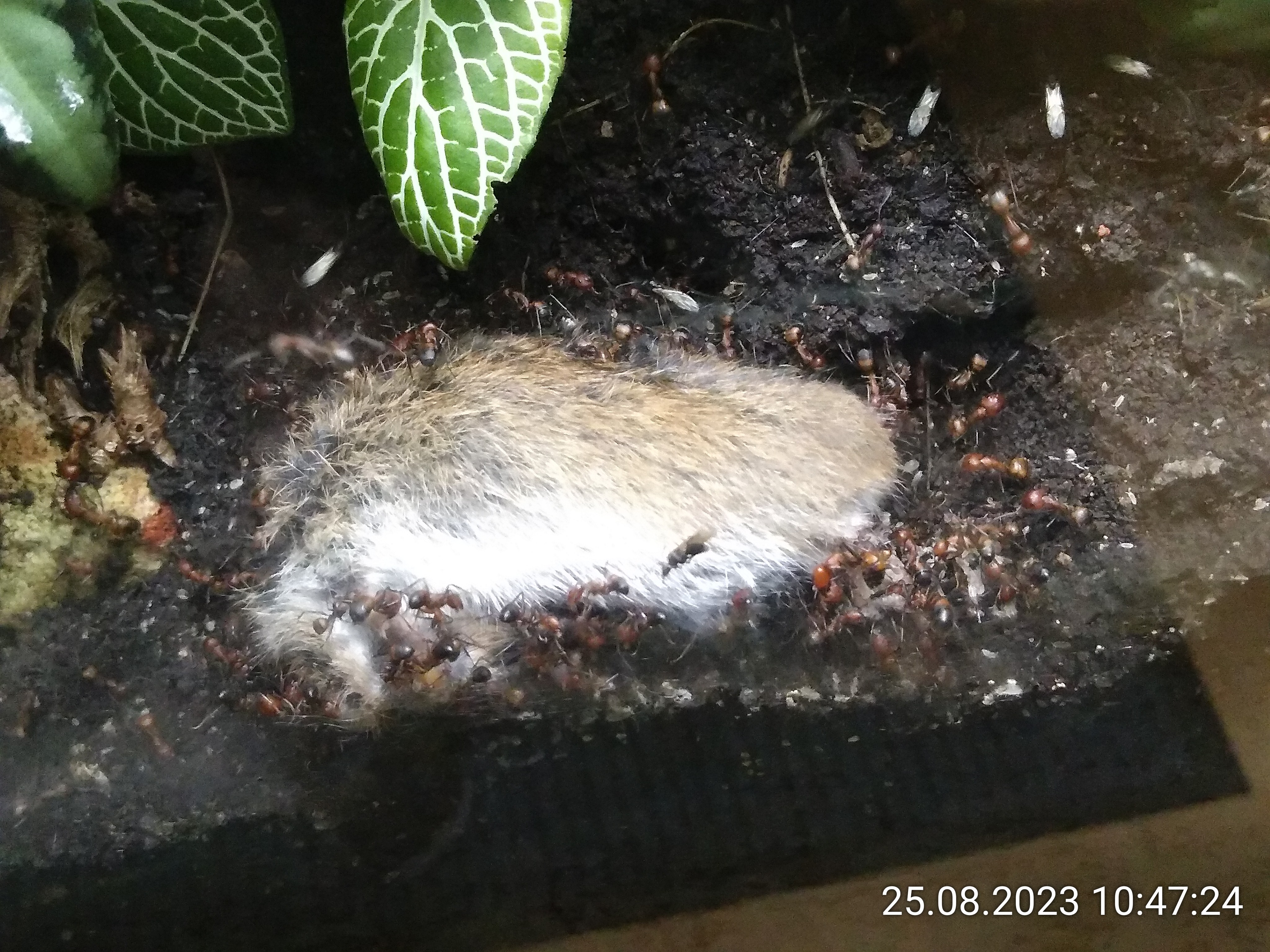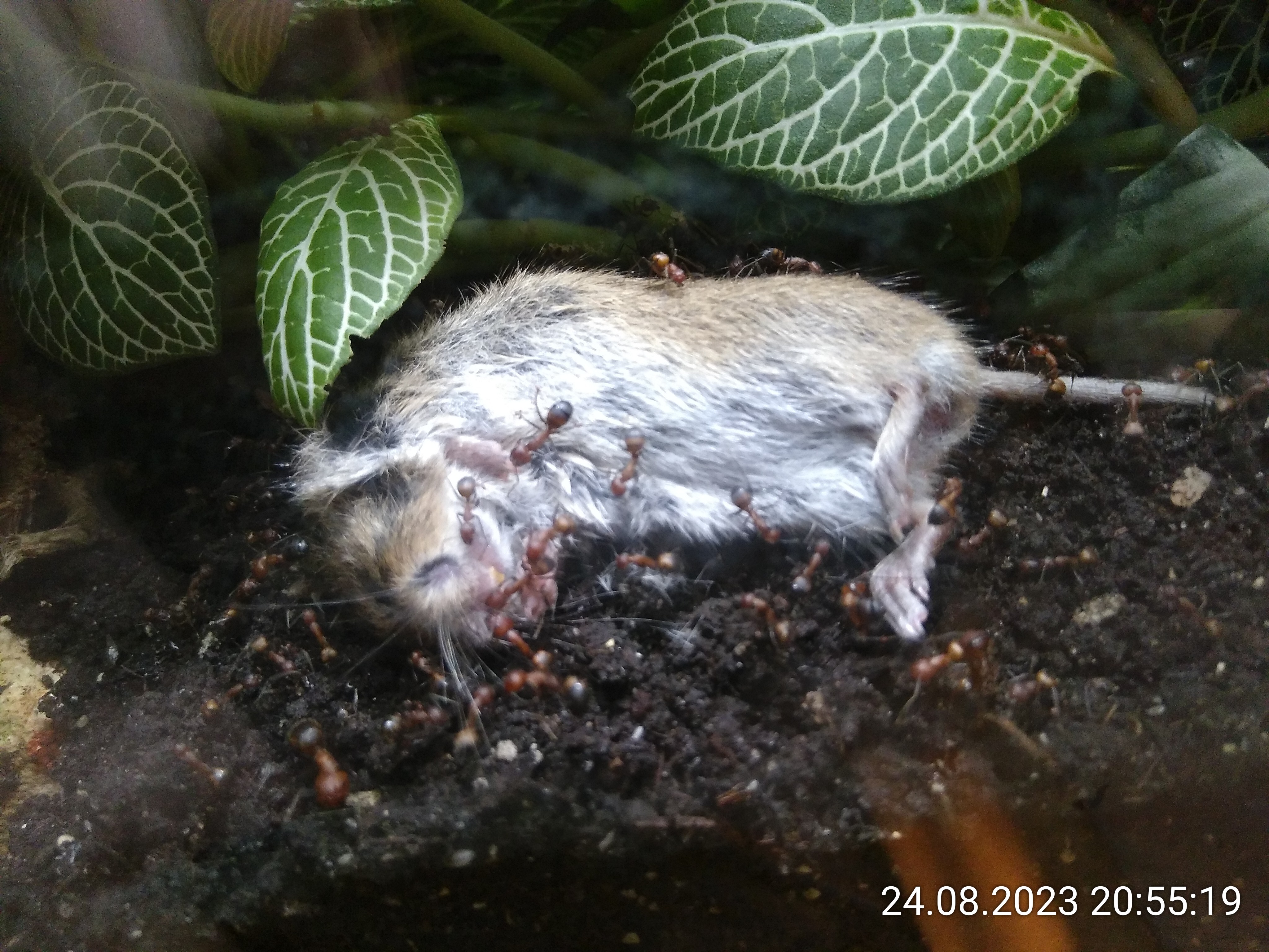Ah ok ich kenn sonst nur die frei rumliegenden Mäuse meiner Katzen welche Sie mir ab und zu in der Wohnung verstecken - das ist so ein süss-ekliger Leichengeruch der sich dann bemerkbar macht. Aber kann natürlich gut sein, dass die Ameisen den Geruch bei der Verarbeitung unterdrücken.