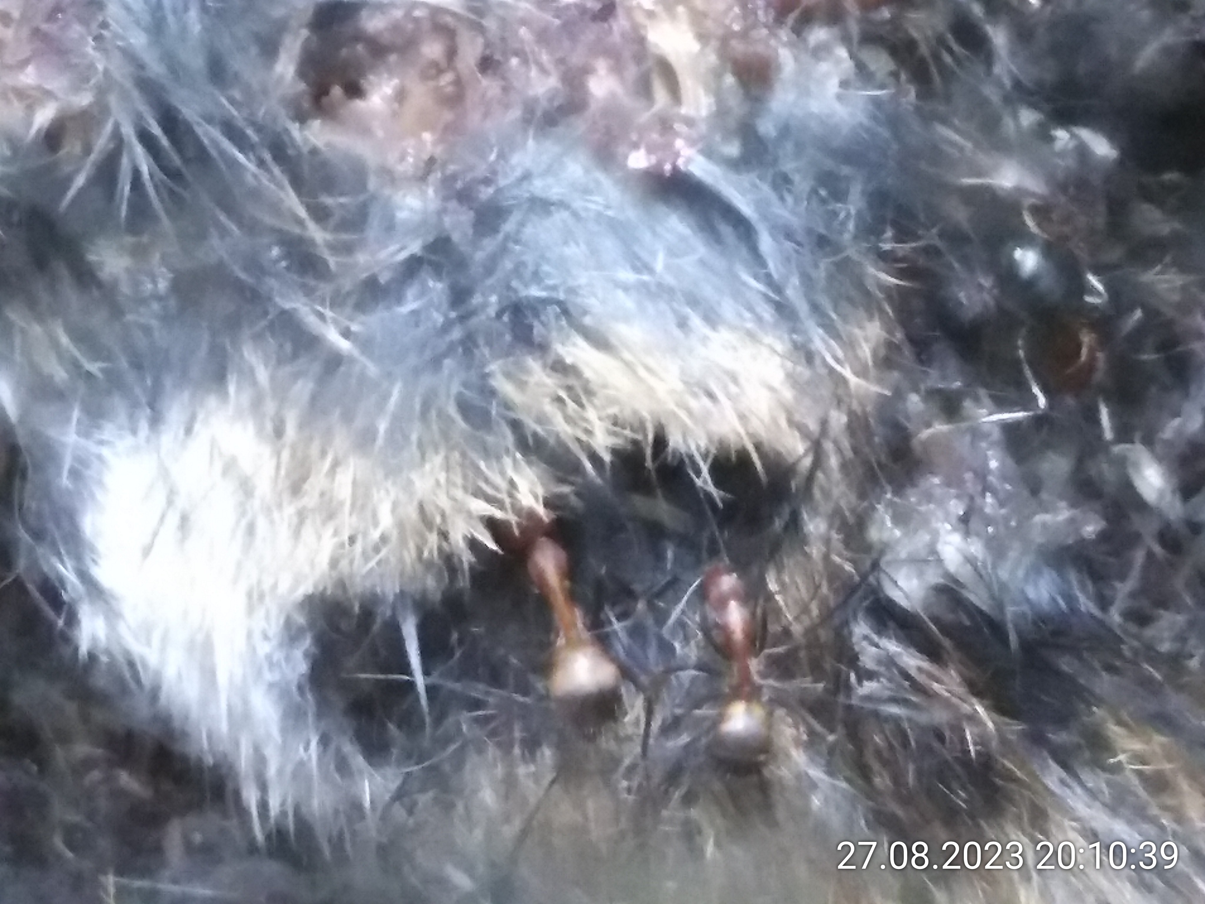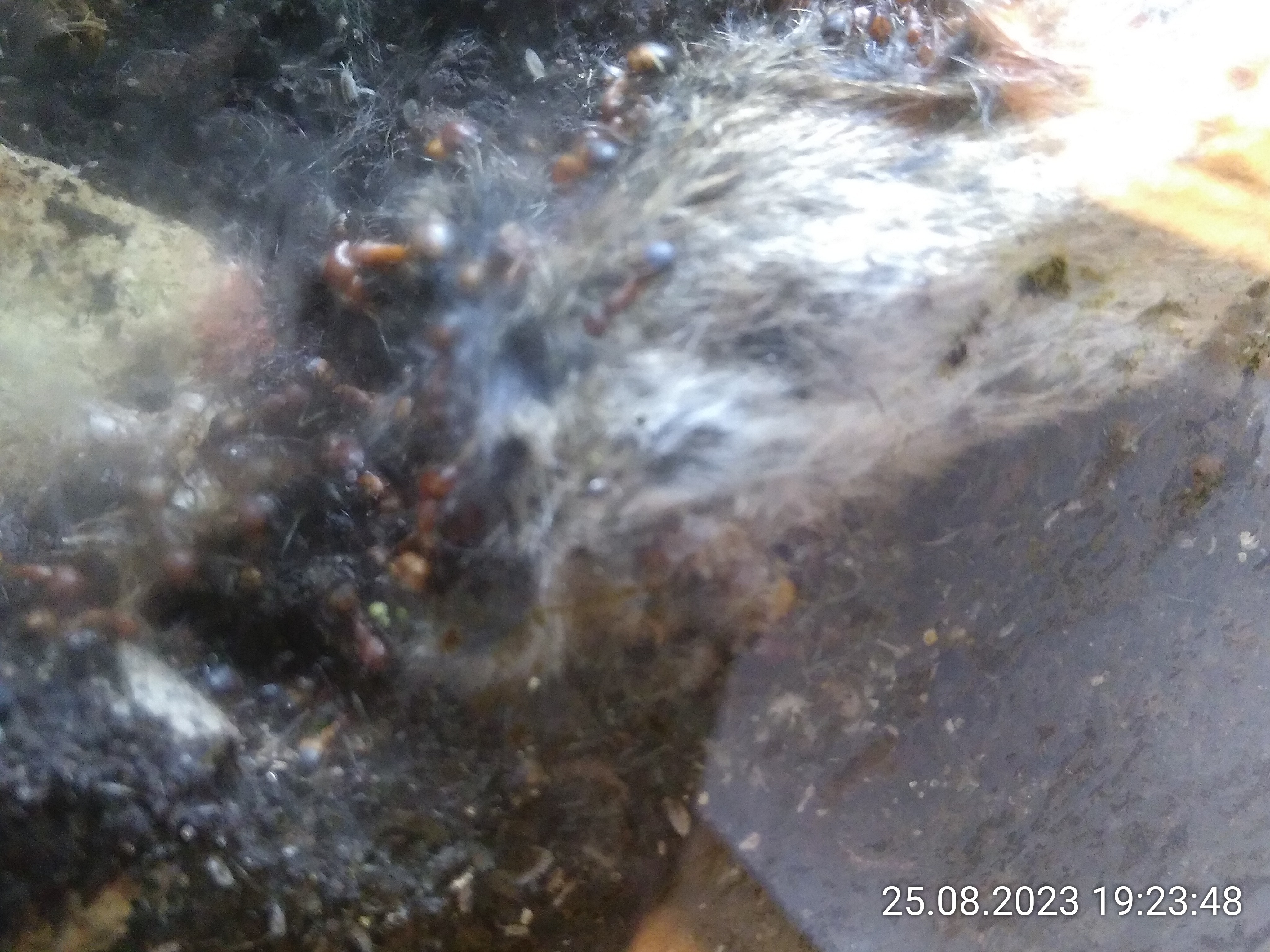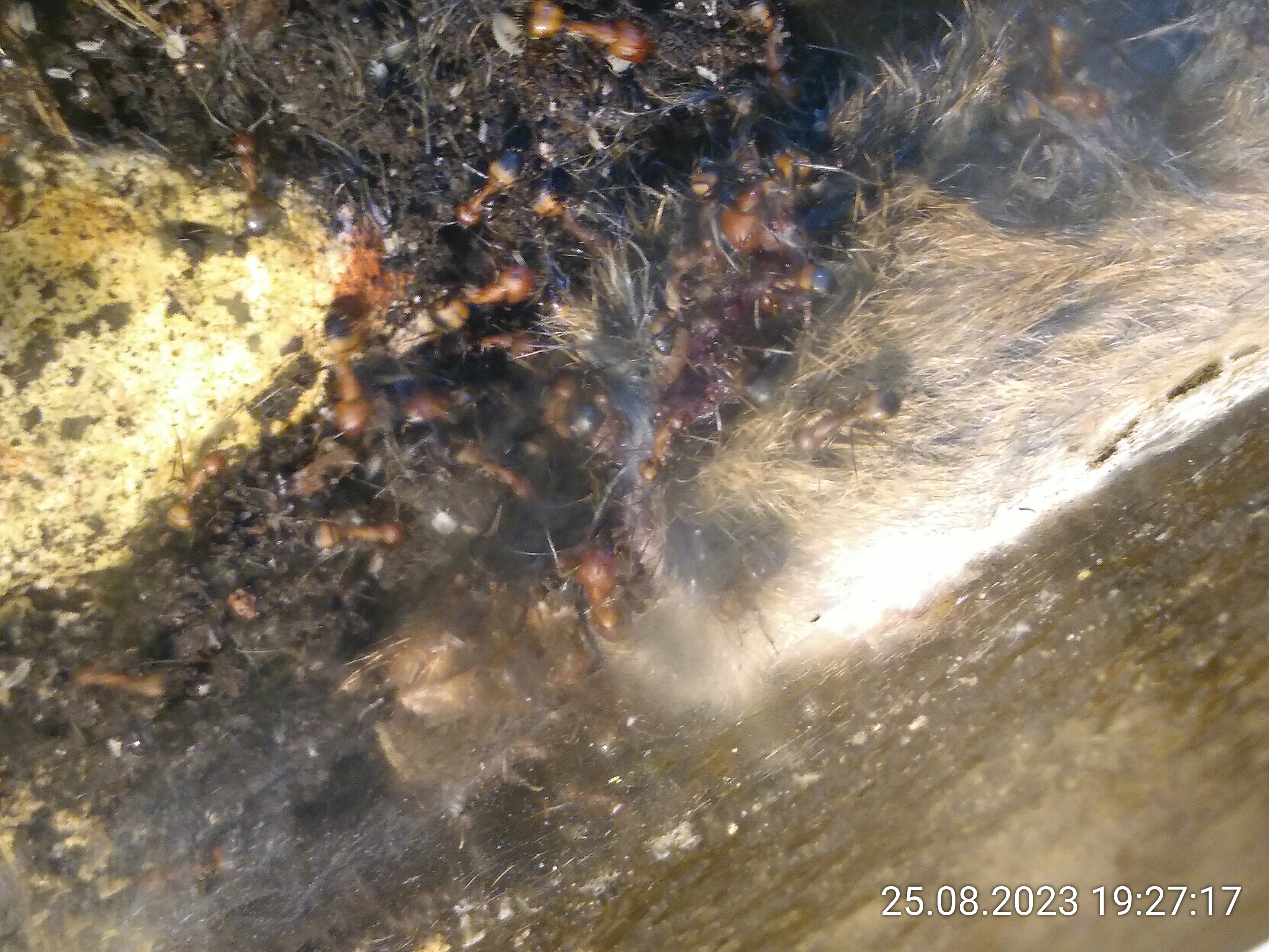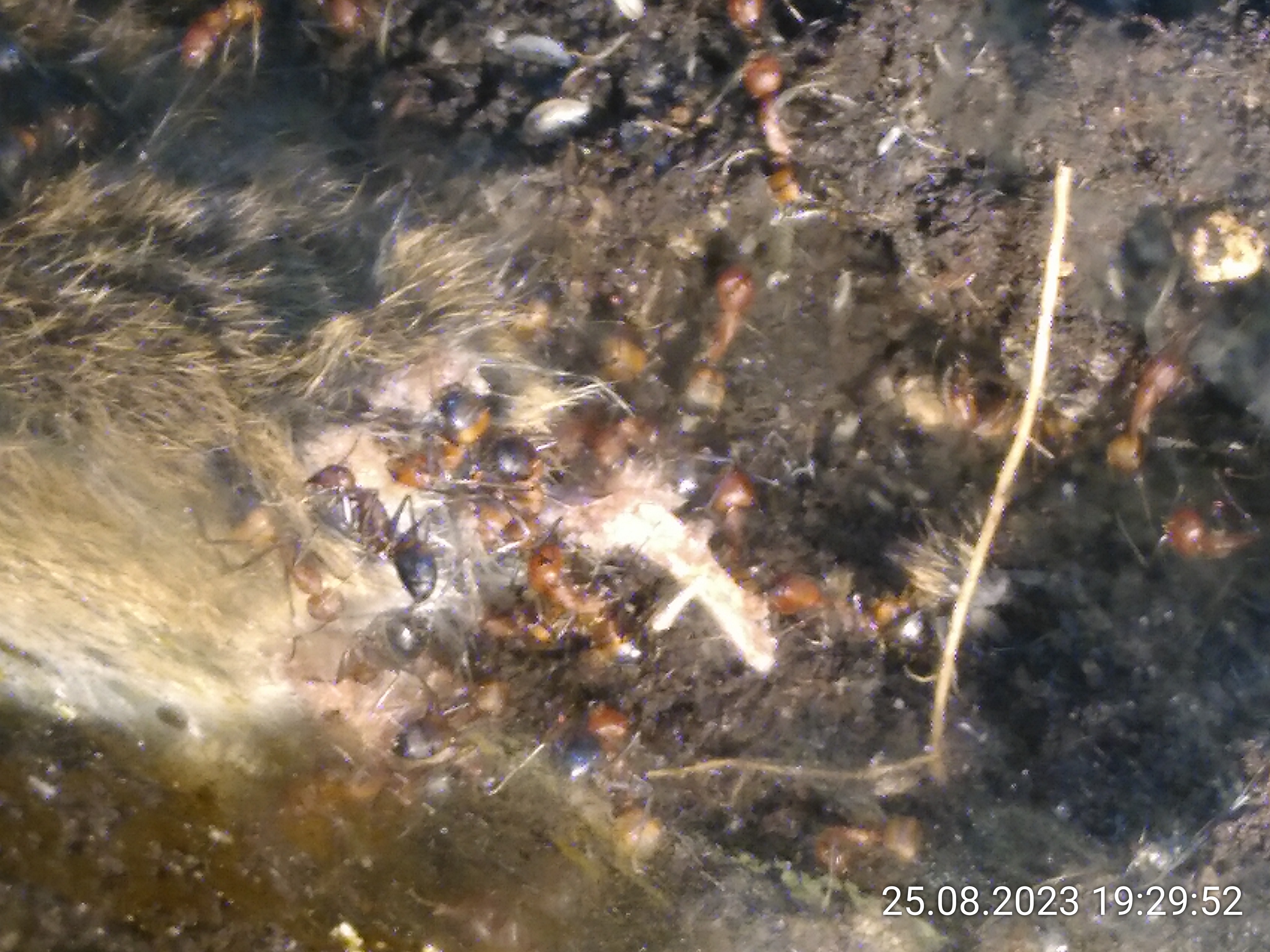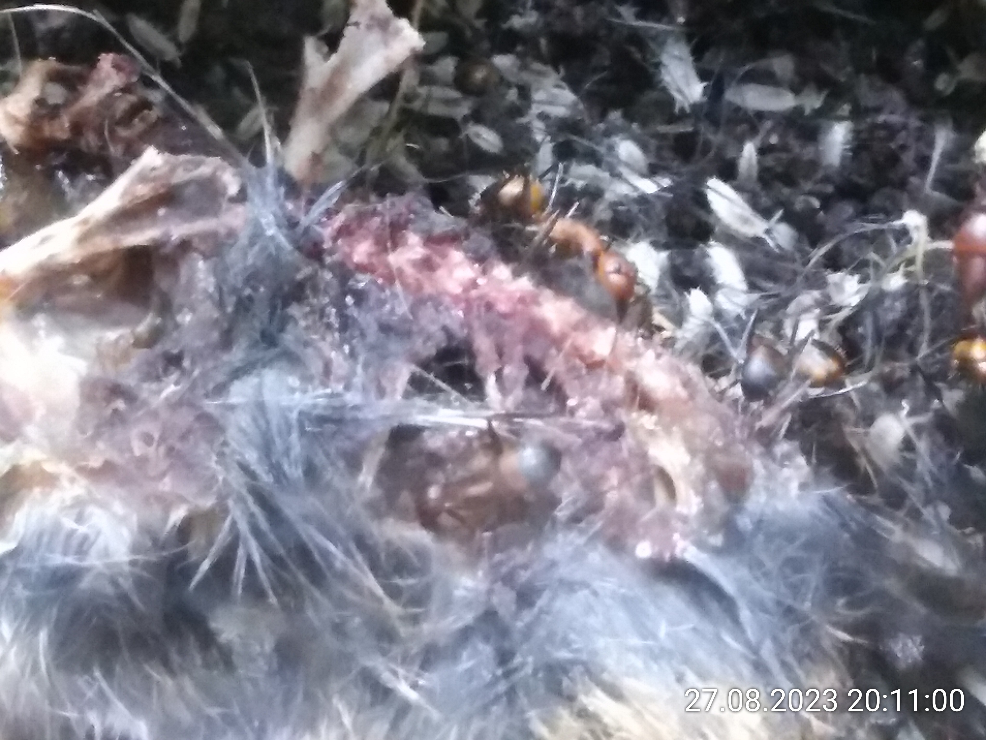 Ah ok ich kenn sonst nur die frei rumliegenden Mäuse meiner Katzen welche Sie mir ab und zu in der Wohnung verstecken - das ist so ein süss-ekliger Leichengeruch der sich dann bemerkbar macht. Aber kann natürlich gut sein, dass die Ameisen den Geruch bei der Verarbeitung unterdrücken.