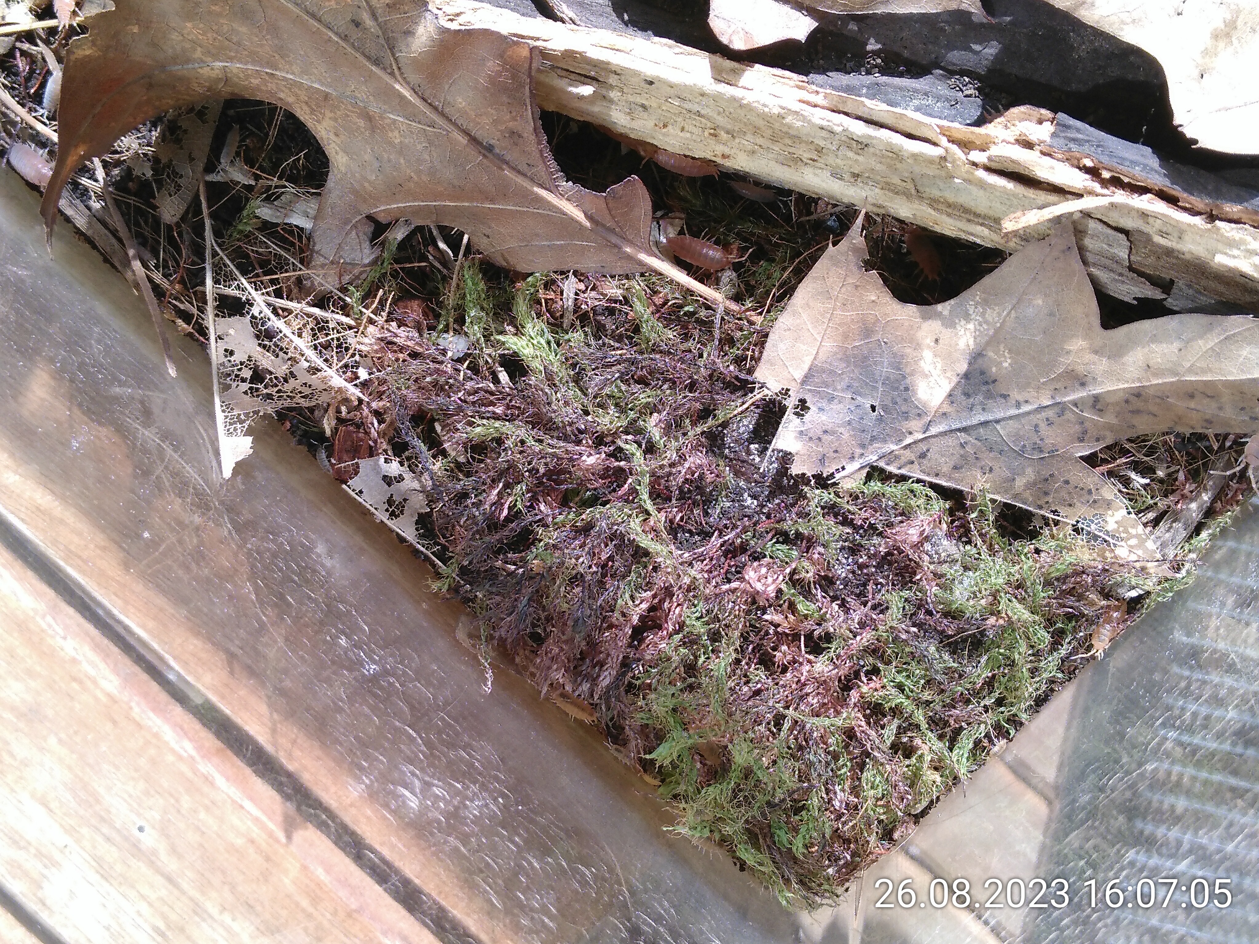 Die drei Moospolster sehen zerrupft aus und sind es auch. Die waren anfangs viel dichter und buschiger. Das vierte (war auf dem Bild unten rechts) wurde komplett gefressen. Blätter musste ich schon zweimal nachlegen. Die mögen sie anscheinend gerne.