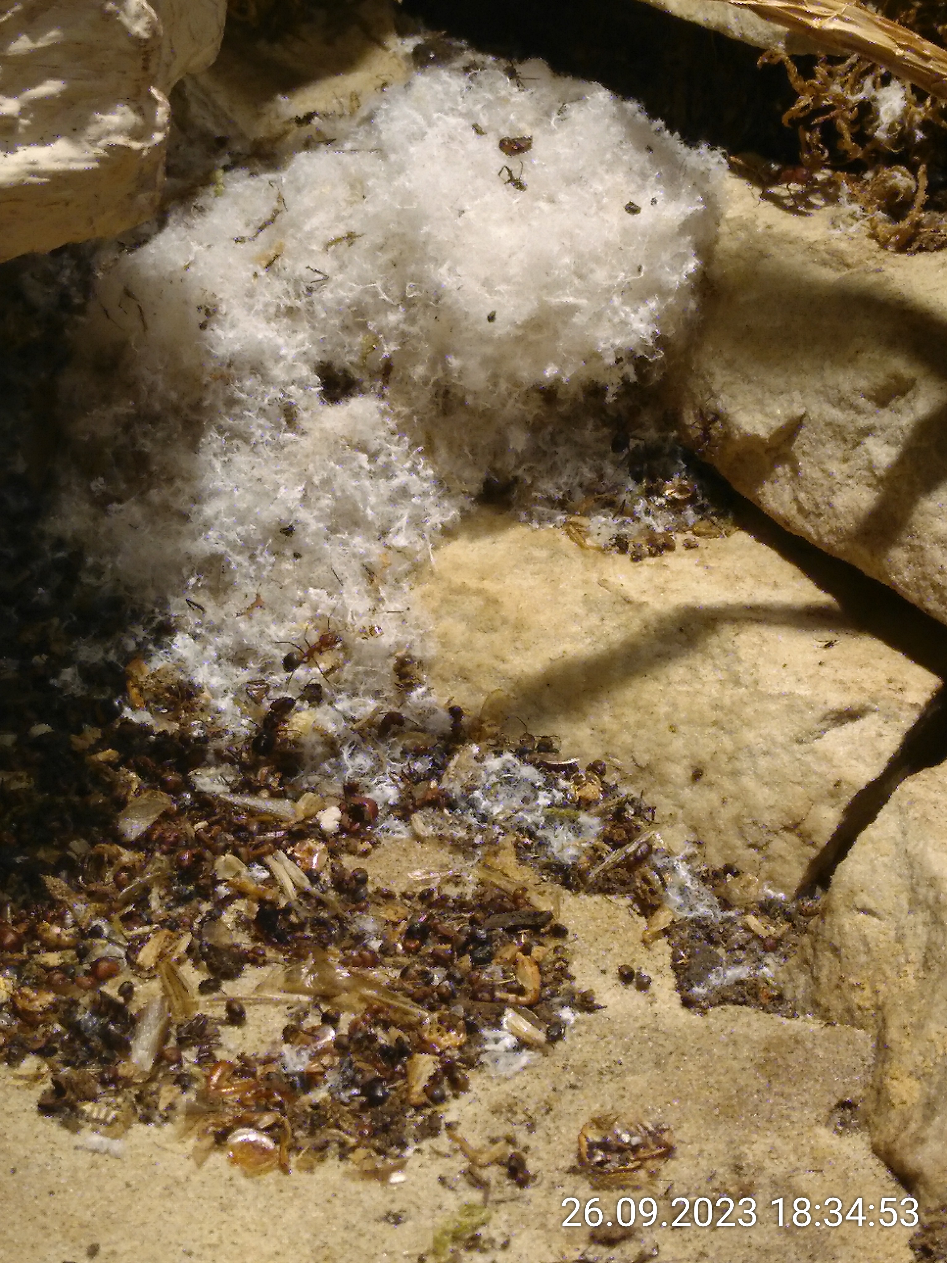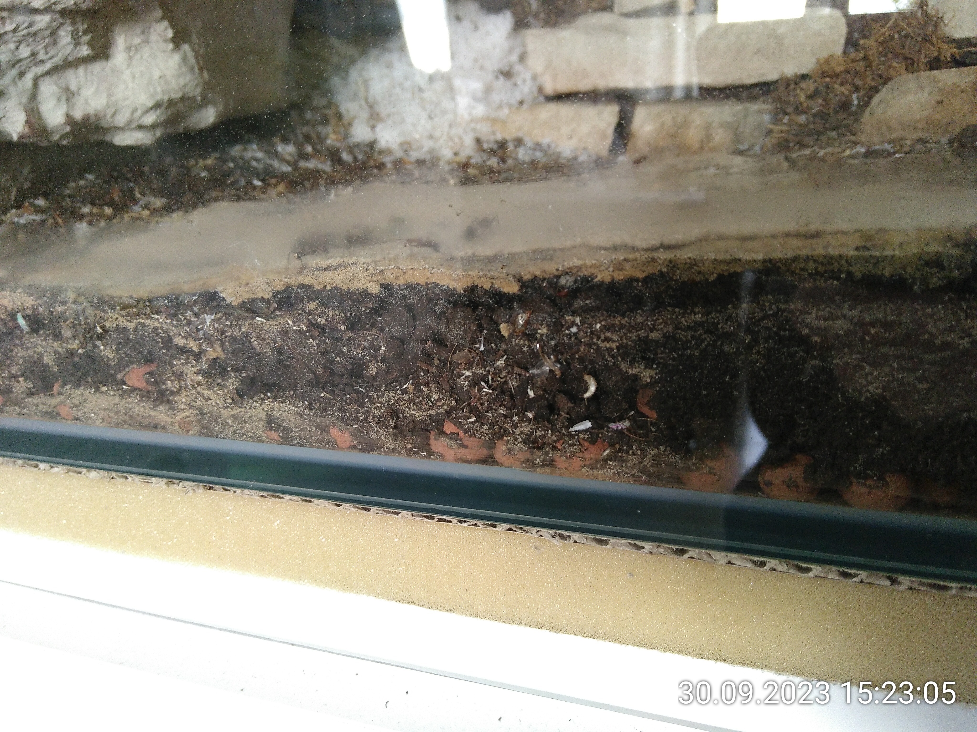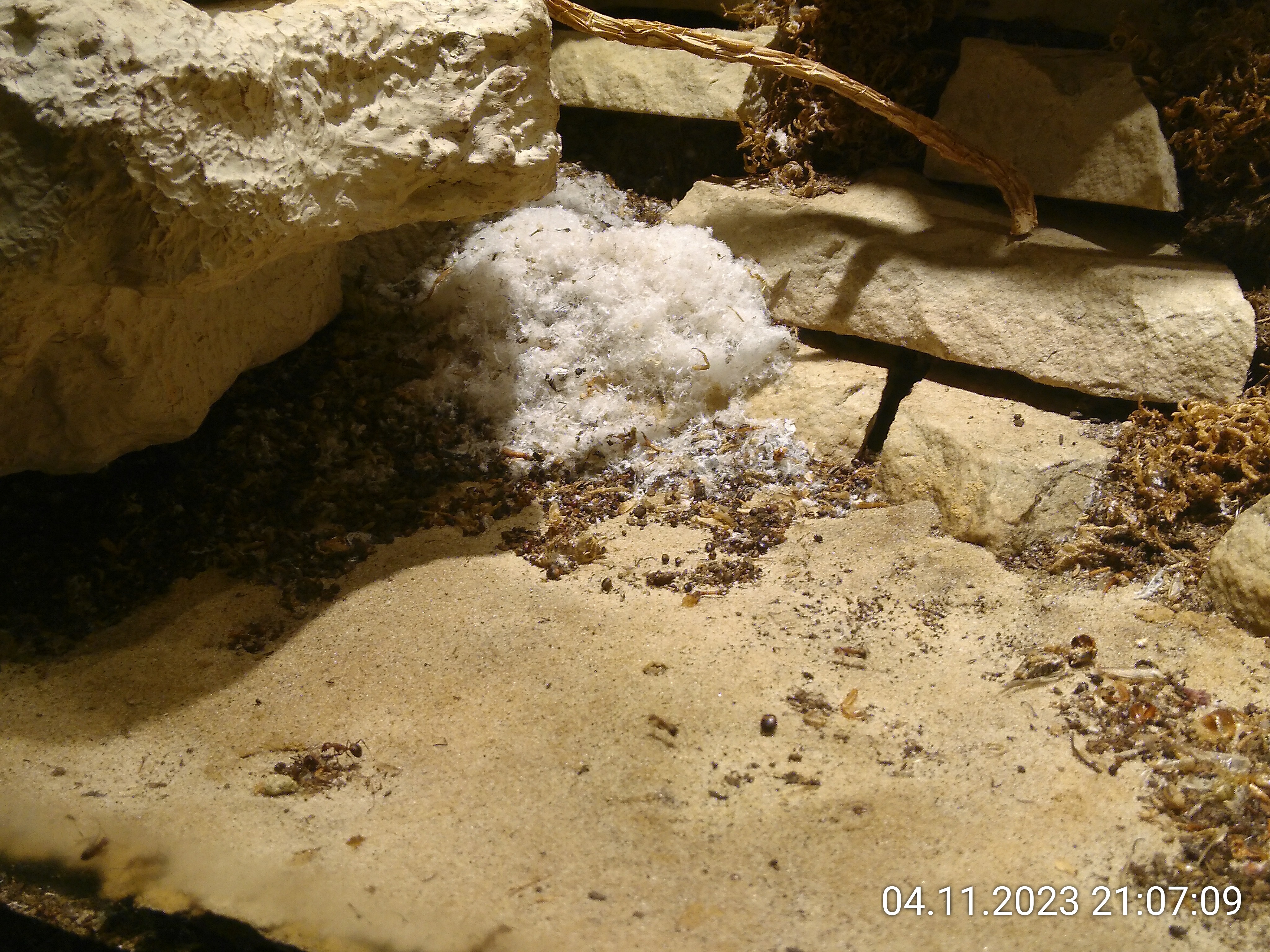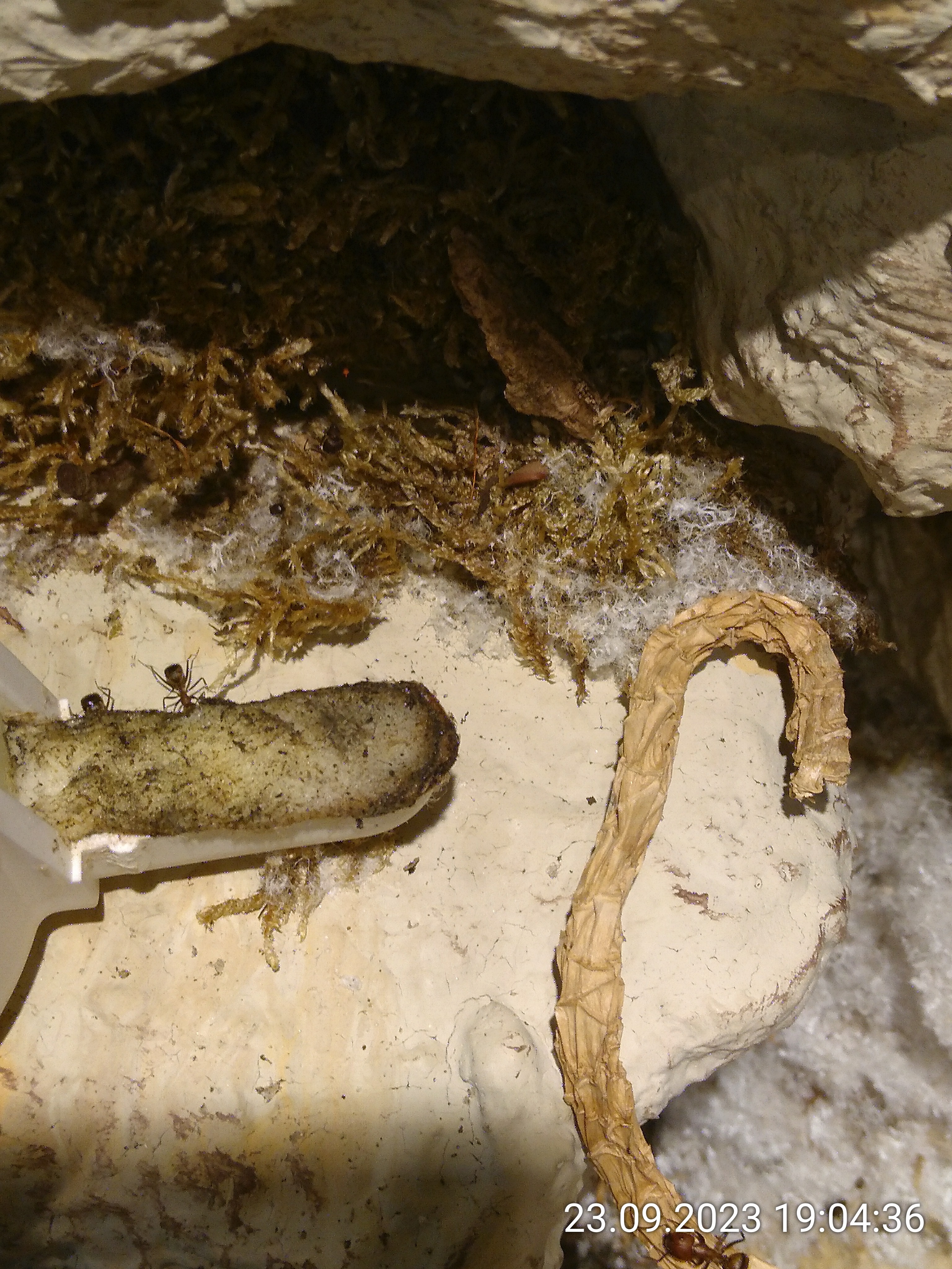 Das kleine Nest, also Camp Nico, ihr allererstes ĂŒbrigens, das sie nie aufgegeben haben, auch wenn sie es kaum noch aktiv nutzen, hat sich ziemlich verĂ€ndert. Das untere Drittel ist komplett angefĂŒllt mit MĂŒll, vermutlich gröĂtenteils Kork. Da werde ich bei Gelegenheit mal einen Löffel mit weiĂen Asseln reinsetzen. Hoffentlich erwische ich dabei keine Babys von den gröĂeren Arten. Das mittlere Drittel ist fast immer leer und im oberen sitzen viele MĂ€nnchen. Ist das ihre Man Cave? Im "oberirdischen" Bereich sieht sie AktivitĂ€t immer mal wieder anders aus. Im Sommer wurde dort sogar mal wiederBrut gelagert.