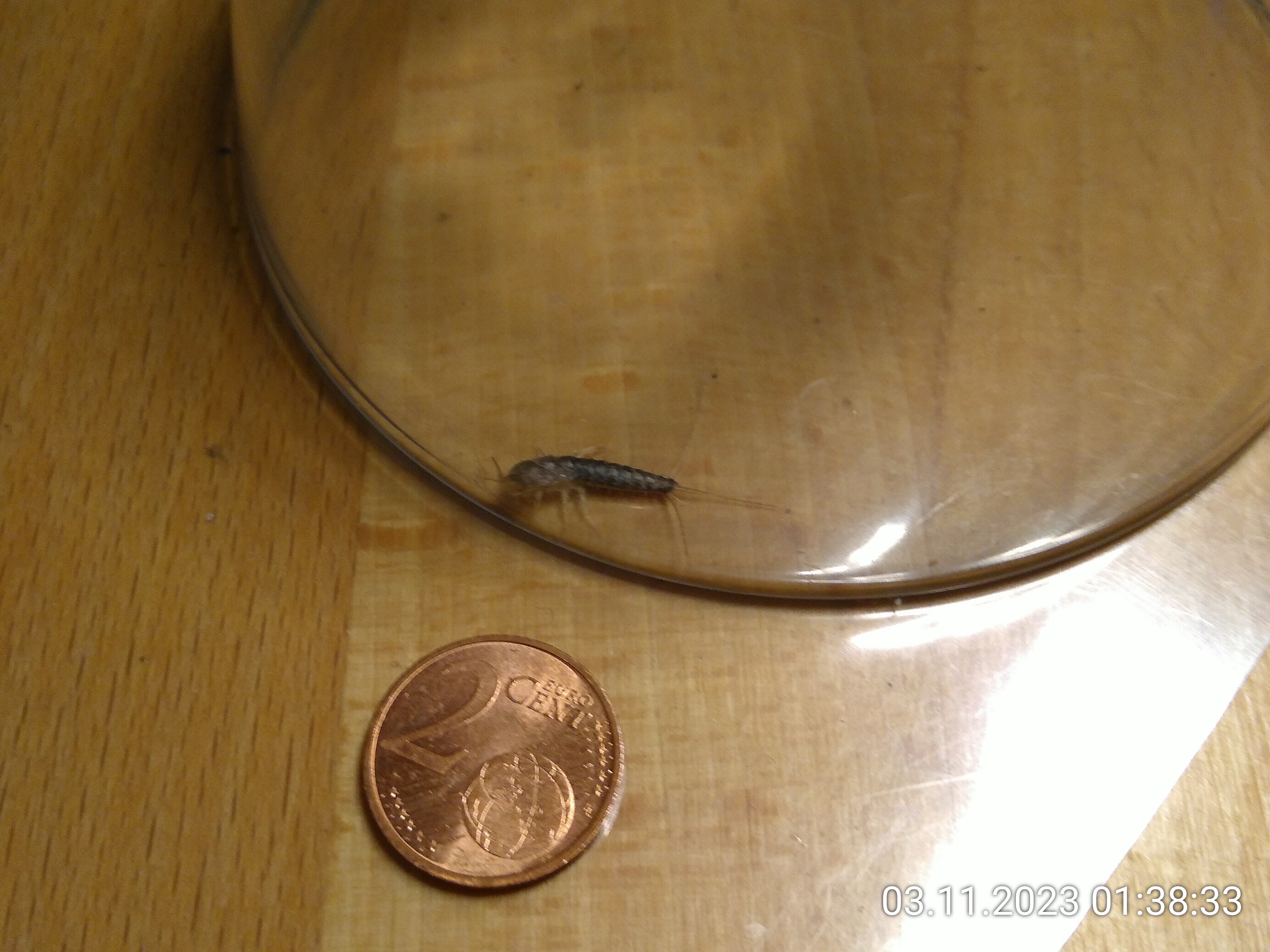 Ich wusste nicht, dass Silberfischchen so groà werden können. Habe dieses Prachtexemplar abends im Bad gesehen und dachte erst, es wÀre Dreck, eine Fluse oder so was ... bis es sich bewegt hat.