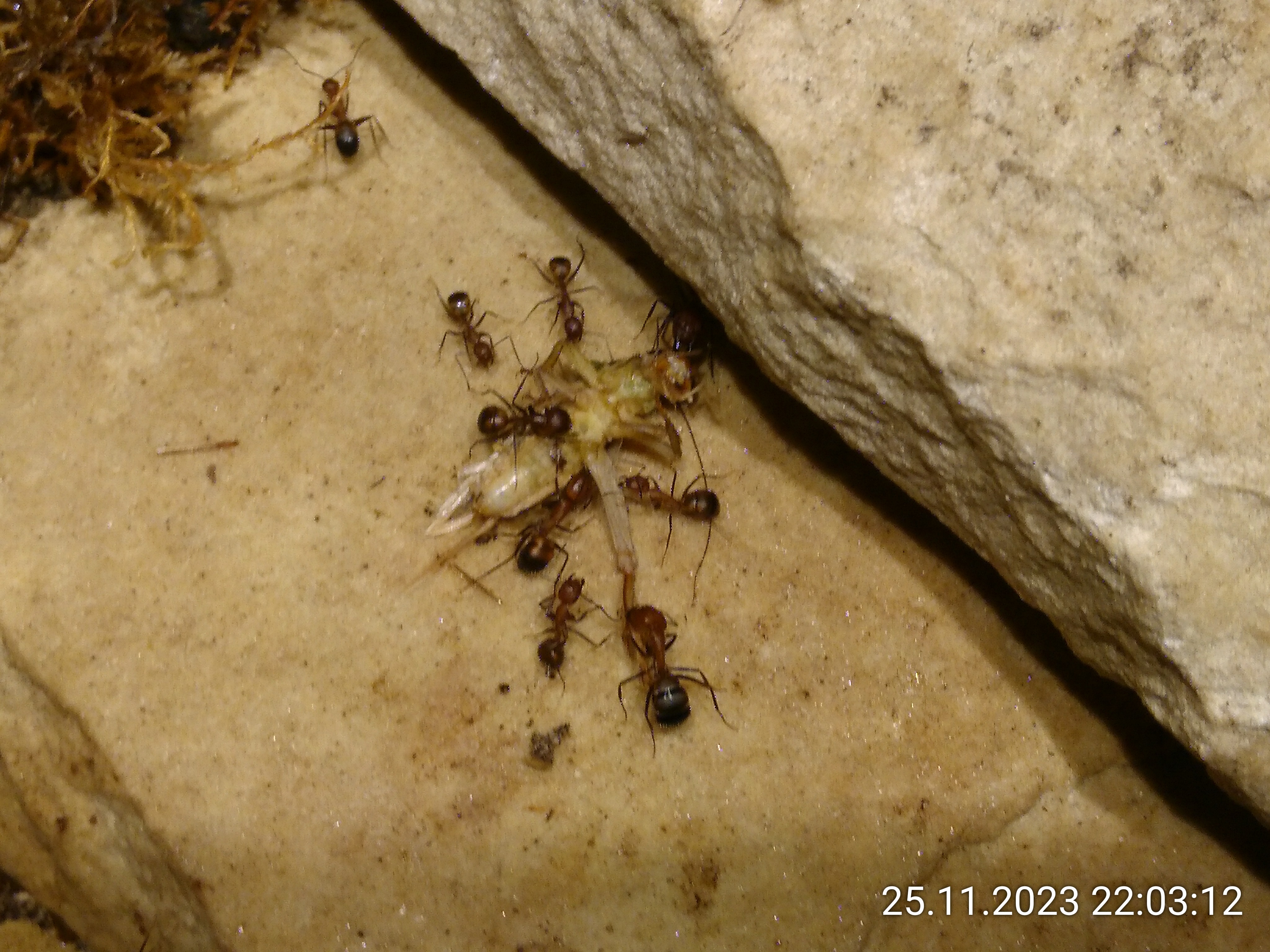 ich habe ja keinen wirklichen Nesteinblick, daher kann ich nur aus Beobachtungen schließen. Und ich würde sagen, im Moment gibt es kaum Brut. Insekten nehmen sie nämlich zur Zeit kaum an und gezeigt bekomme ich auch keine. Da kann nicht vel sein. Um ehrlich zu sein, haben sie, seitdem die Kolonie erwachsen ist, noch nie so wenig Proteine bekommen und angenommen. Aber warum soll ich ihnen heute mehrere Heimchen geben, wenn sie gestern drei einfach komplett ignoriert haben? Solche Zeichen kann ich mittlerweile hoffentlich erkennen. Dann müssen sie halt fasten. Nächste Woche habe ich wahrscheinlich wieder erntefähige, frische Heimchen. Bis dahin teste ich nur ab und zu ihren Appetit. Süßes haben sie ja immer zur Verfügung.