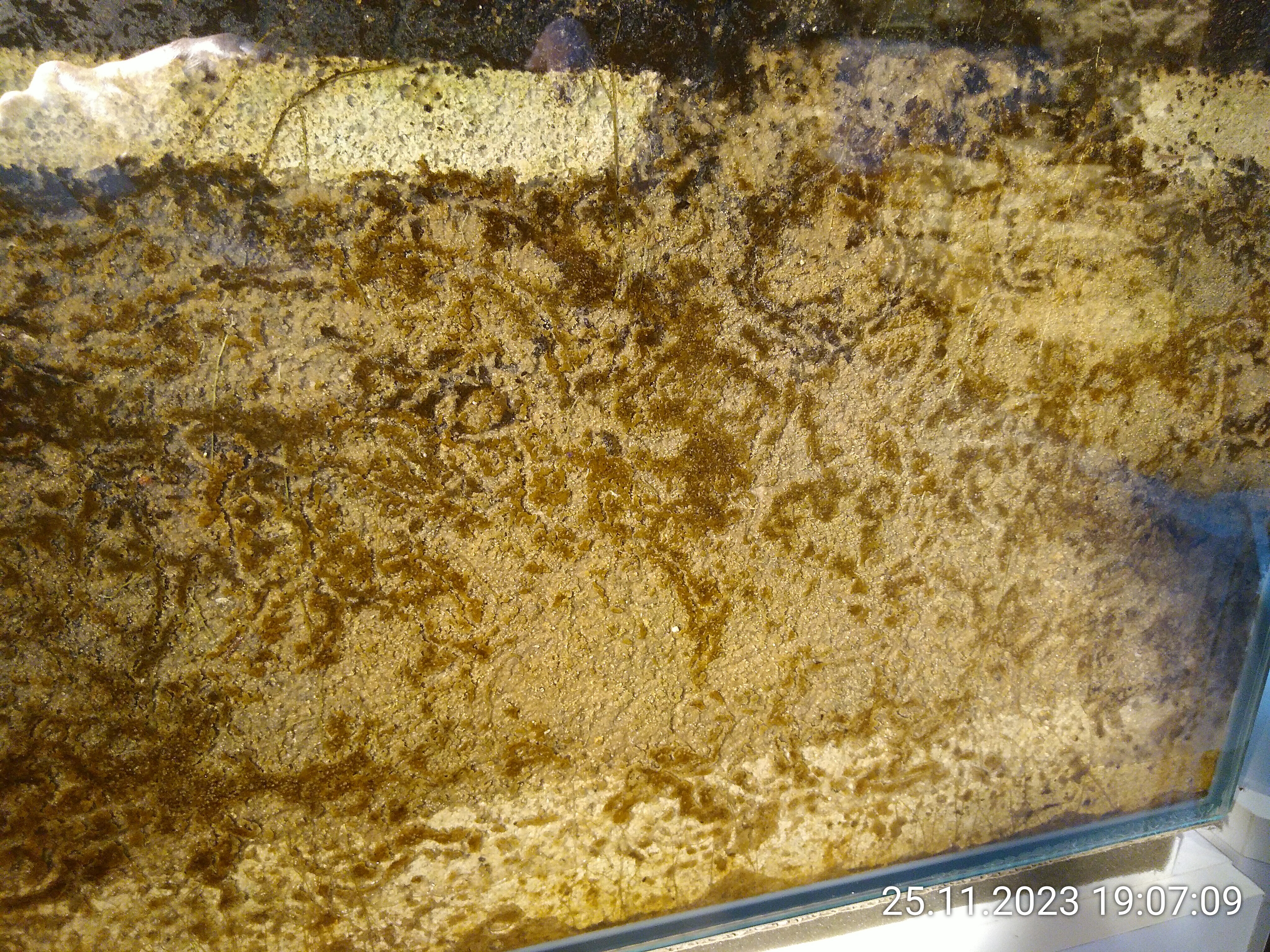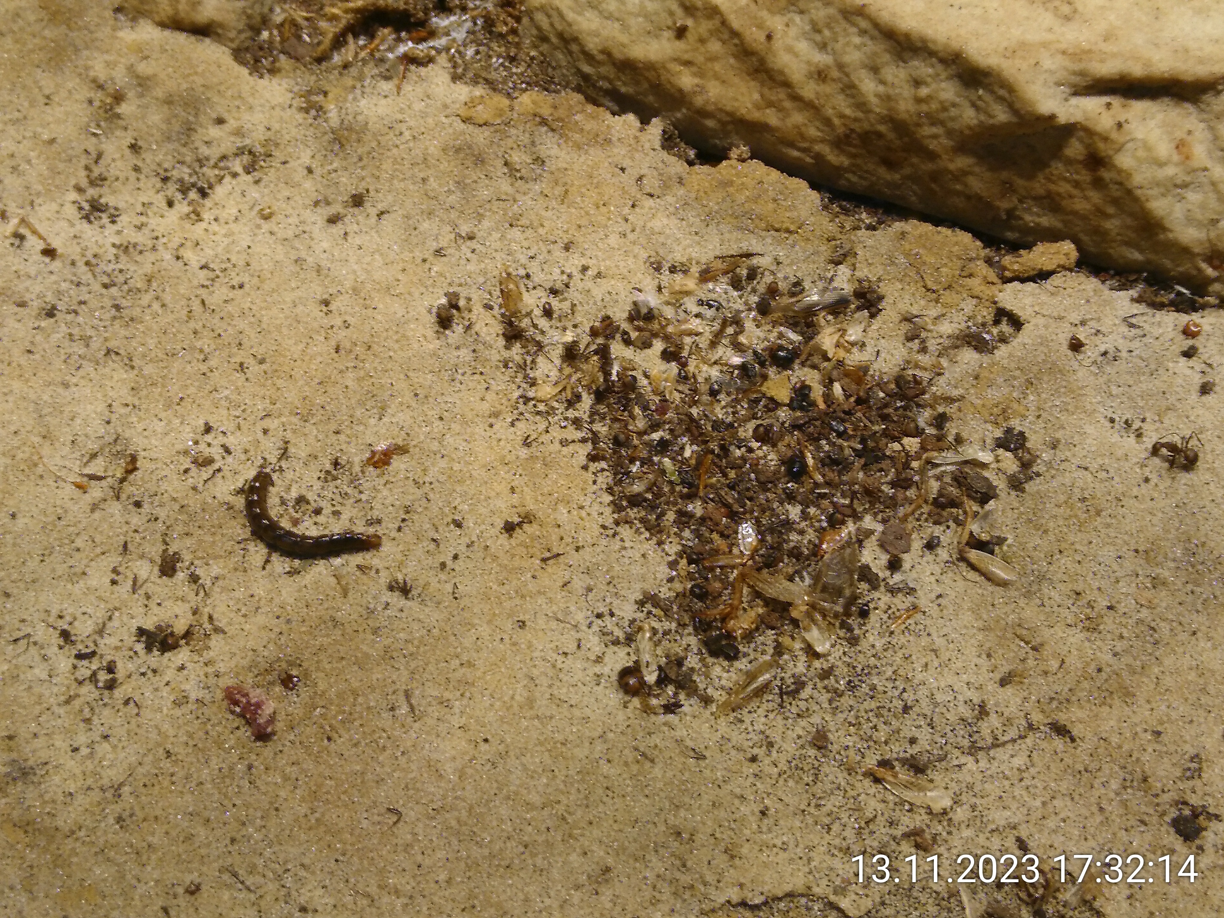 Nach den Diapause-Meldungen der anderen muss ich für meine Nicos wohl auch eine vermelden. Dafür spricht, wie gesagt, ihr proteinablehnendes Verhalten der letzten Zeit. Ob dieser Mehlwurm auch dazu gehört, ist fraglich. Darauf standen sie noch nie wirklich. Aber dieser war ihnen sogar nicht mal gut genug für die Müllhalde.