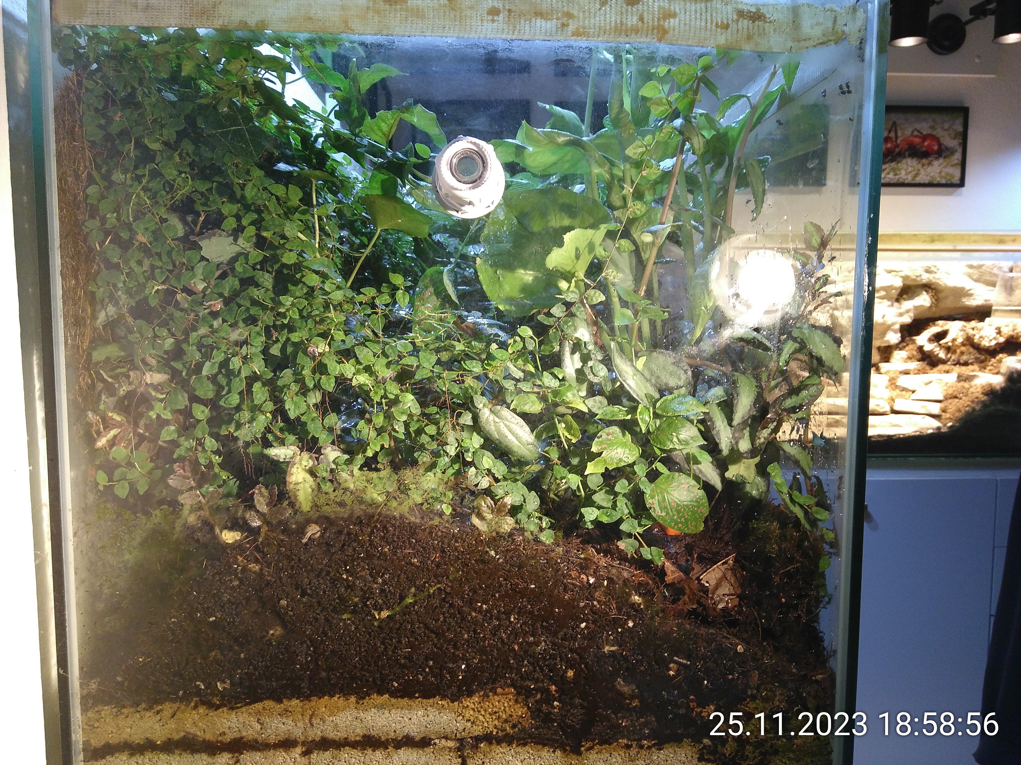 Die großen Pandaasseln scheinen sich mit den Nicos arrangiert zu haben. Ich sehe manchmal viele von ihnen gleichzeitig. Und die Nicos sind höchstens neugierig, manchmal gleichgültig, aber nicht aggressiv. Nur die rötlich-braunen kubanischen Asseln habe ich schon lange nicht mehr gesehen. Entweder verstecken sie sich gut, haben sich komplett in den Untergrund verzogen oder waren doch beliebte Beute. Letzteres glaube ich aber nicht. Die Schnecken sehe ich übrigens auch immer mal wieder. Die scheinen als Beute auch nicht interessant zu sein.