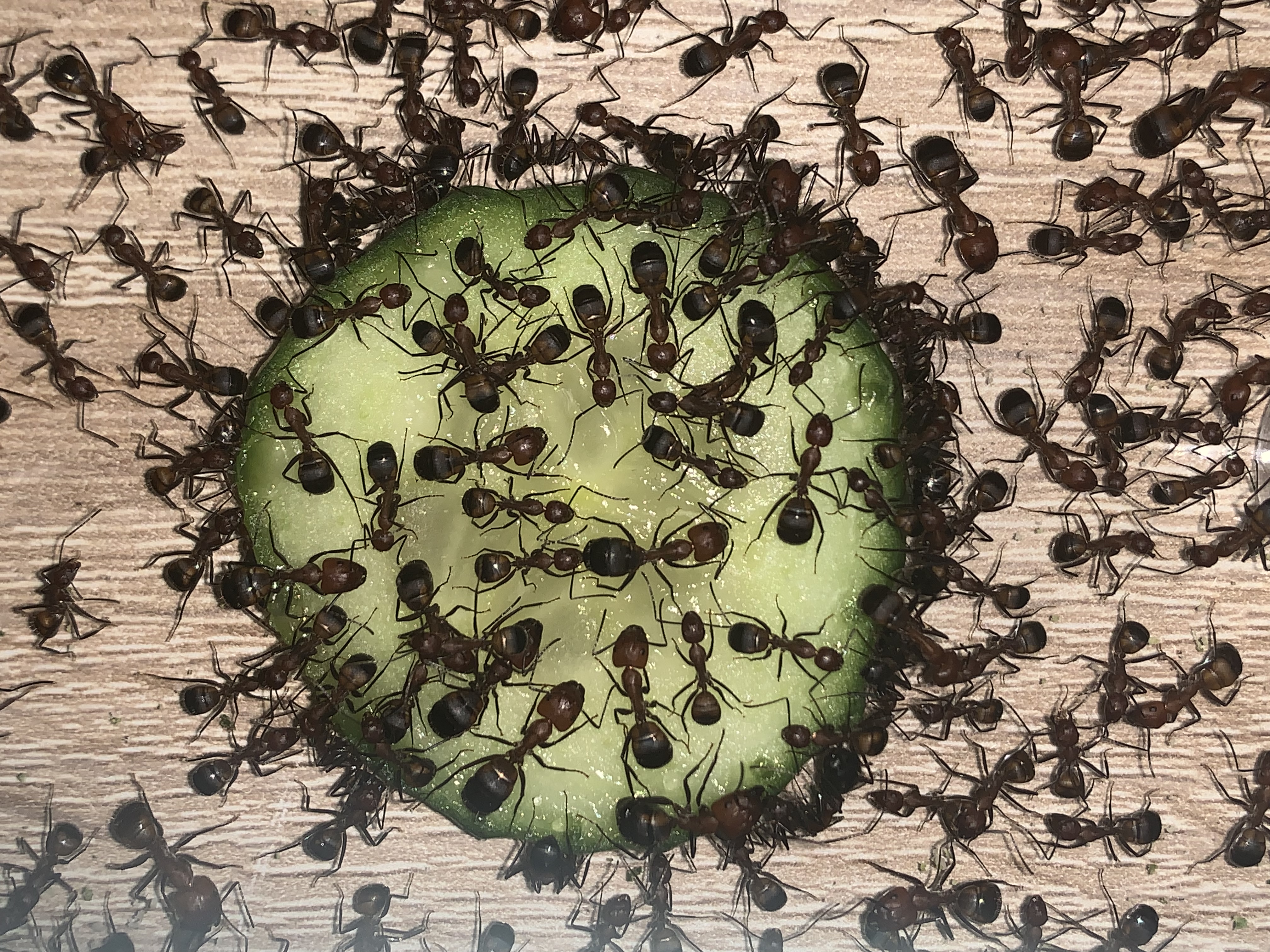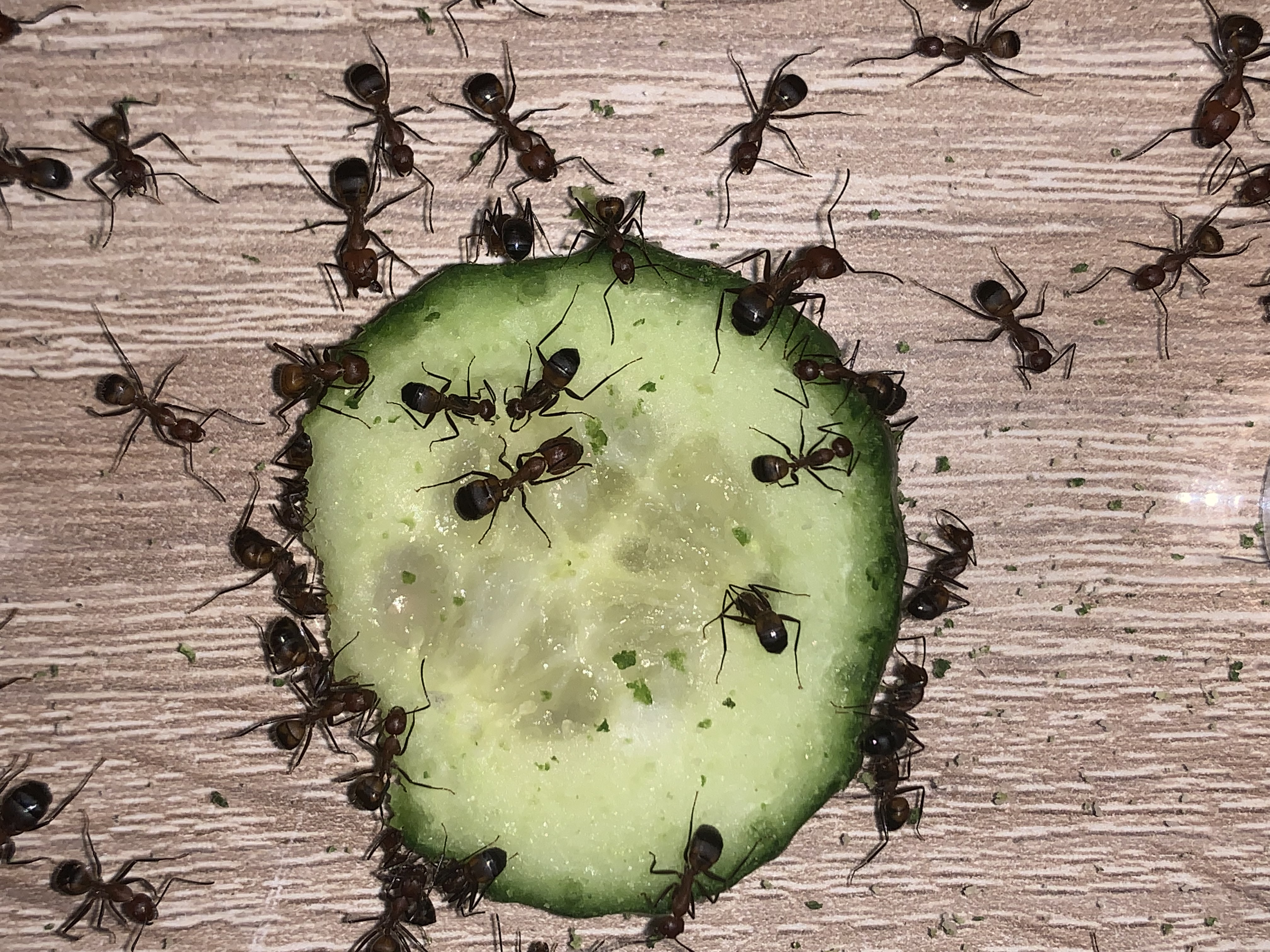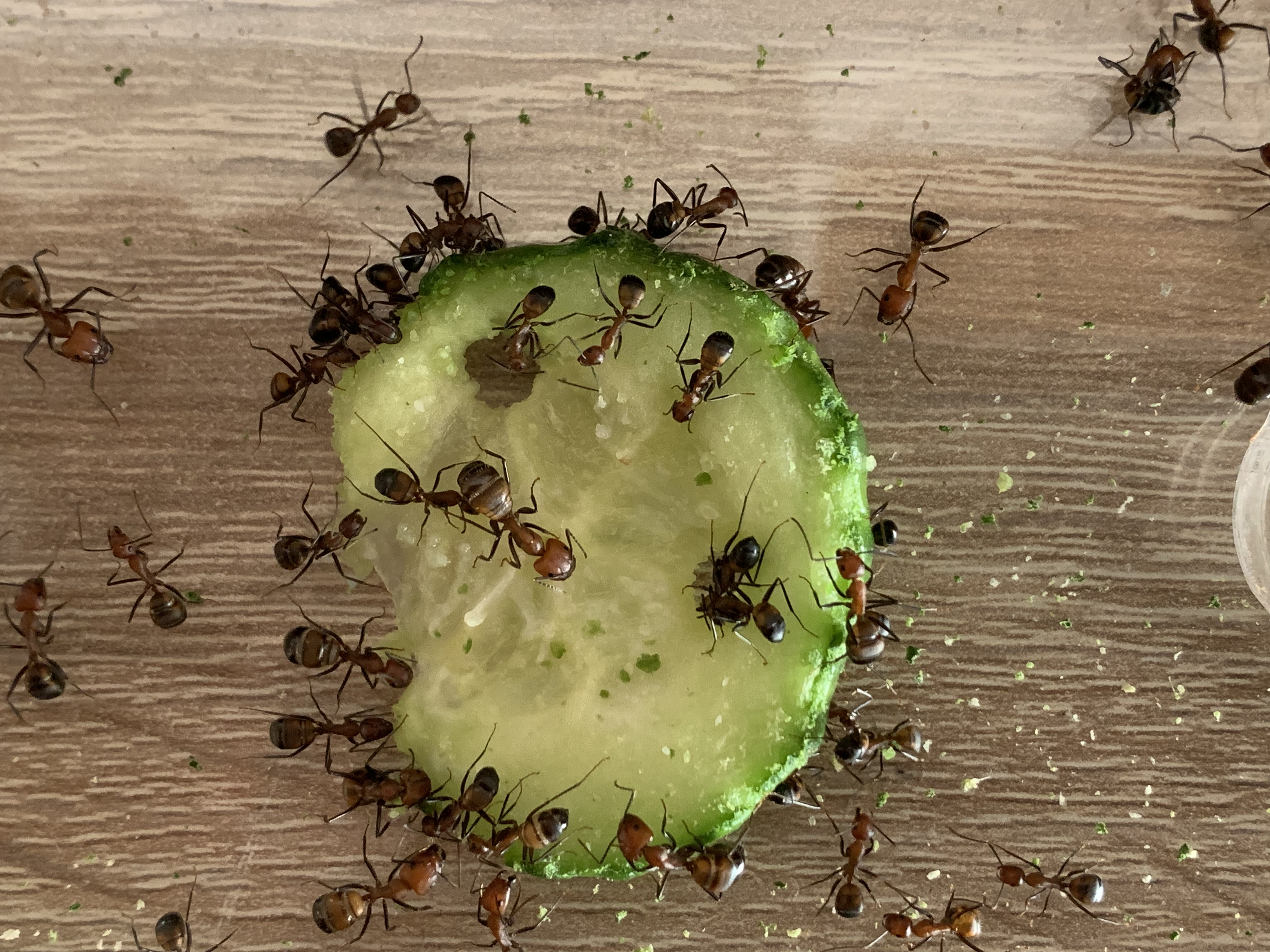 Im Gegensatz zu den Camponotus nicobarensis von PincoPallino Lieben meine Camponotus nicobarensis Gurke, sie wird komplett zerlegt, es dauert zwar ein paar Tage, aber sie machen alles weg! Dass was sie nicht fressen erkenne ich wegen der grĂĽnen Farbe auf ihrem MĂĽllhaufen. Probiere nun mit dieser Gurkenscheibe (die ich eben reingelegt habe) zu dokumentieren wie schnell sie diese zu vertilgen.