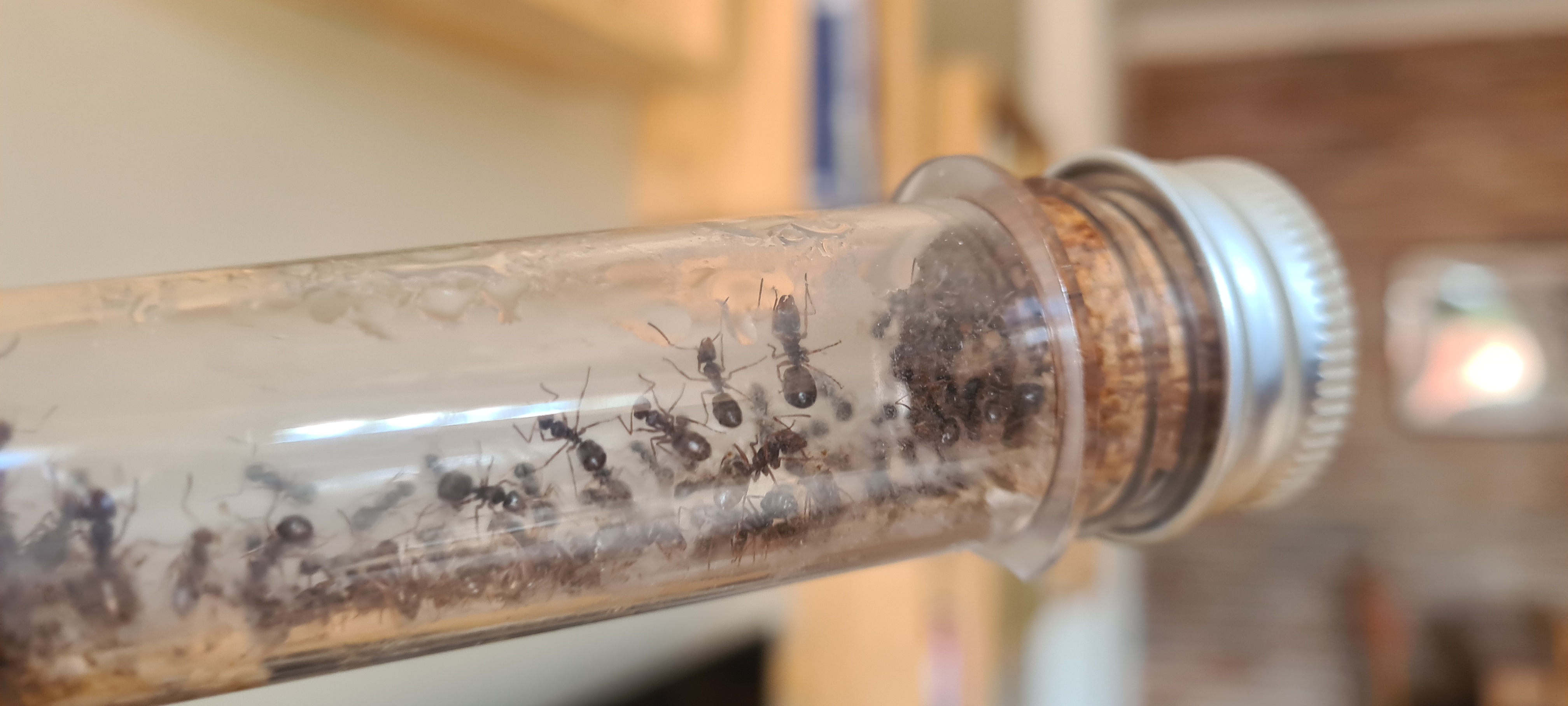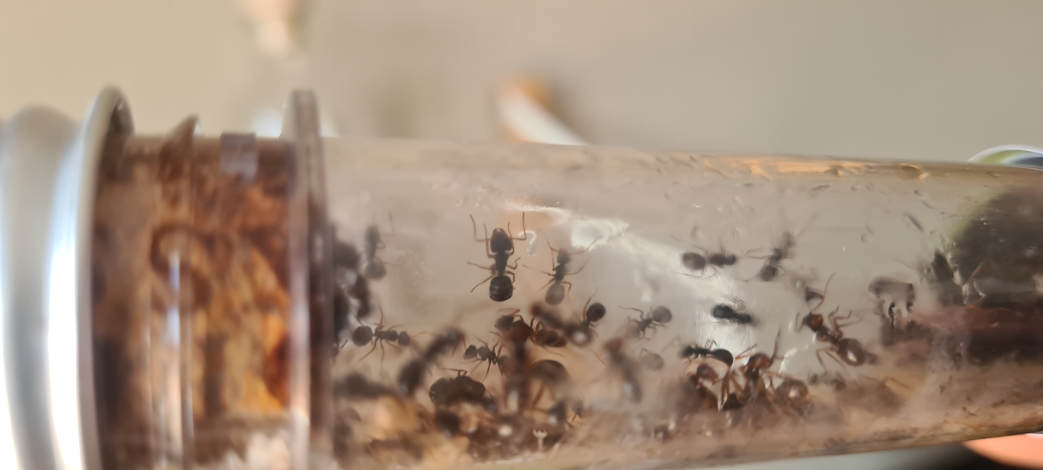 Hab vor 2 Tagen mal ein 2. RG reingelegt. Seit gestern sind da dauerhaft ein paar Arbeiterinnen drin, aber haben noch keine Brut rĂŒbergetragen. Heute gab's eine Schokoschabe und 3 kleine Fliegen. 2 Fliegen wurden in das neue RG verbracht, eine Fliege ins Nest.