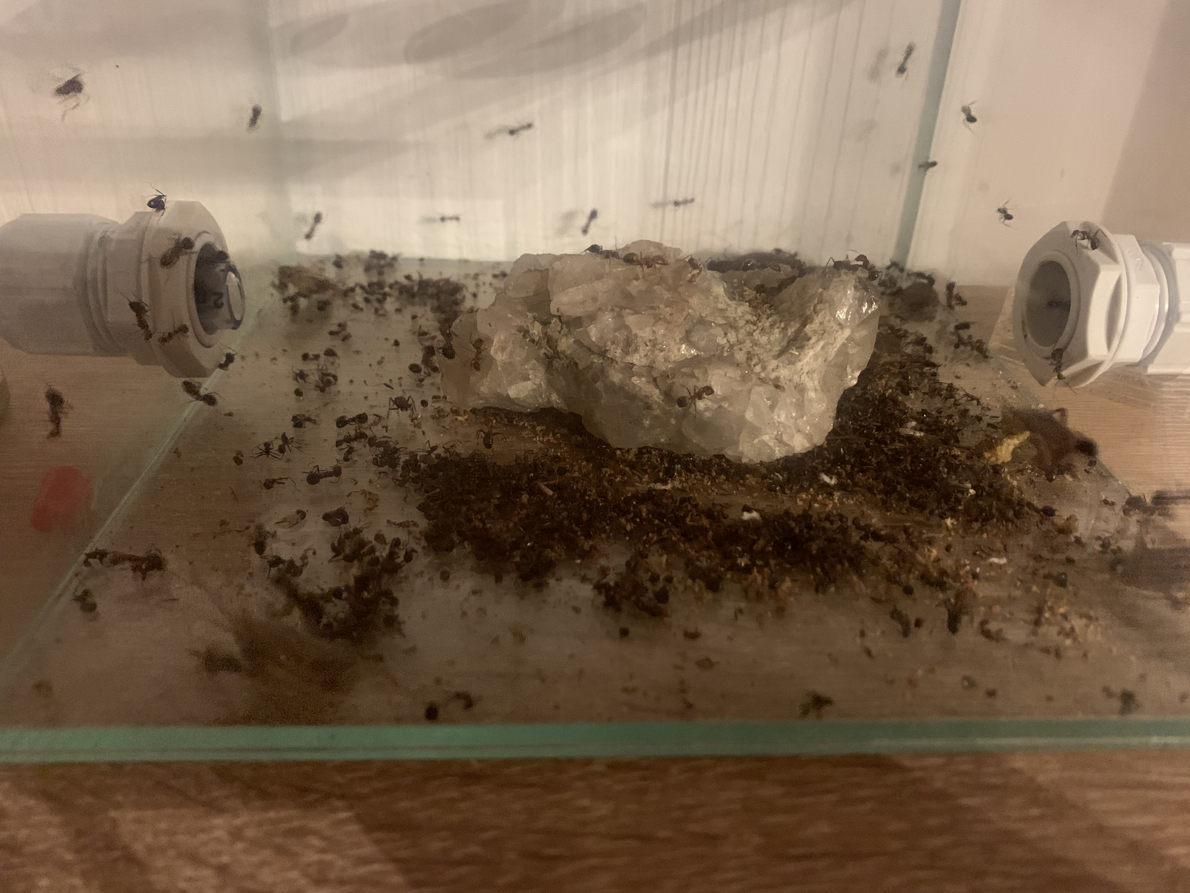 Und es ist nicht so, dass das hintere Nest nun unten top sauber ist, aber sie haben den (wahrscheinlich feuchten) Kork etwas weggemacht, ich habe aber momentan keine allzugrosse Nesteinsicht. Seit Mitte August 2022 ist ja das zweite große Nest vor dem ersten. Ein solches Nest habe ich noch als „Reserve hinter den beiden“ ob ich das wirklich für die Camponotus nicobarensis brauche weiß ich momentan nicht!