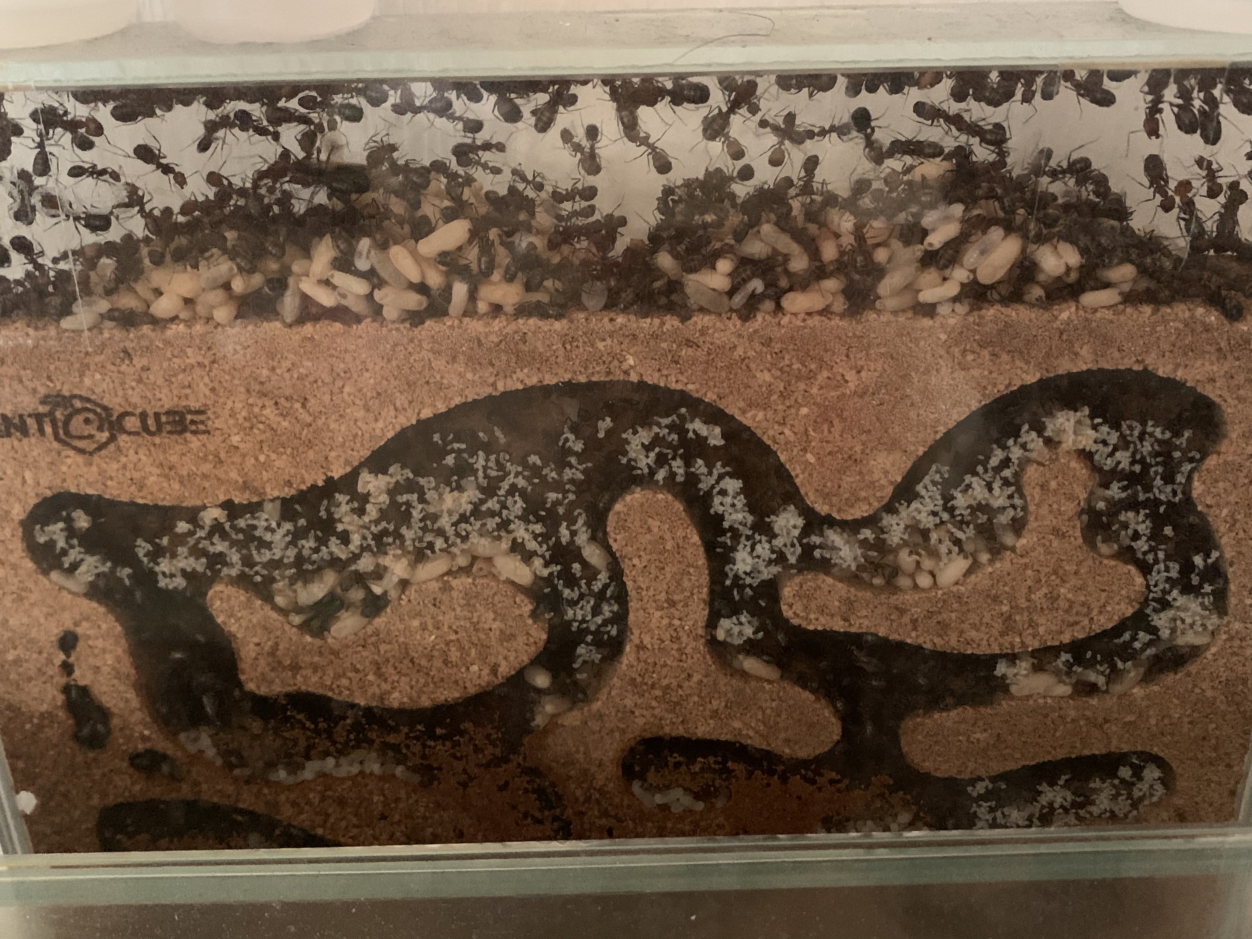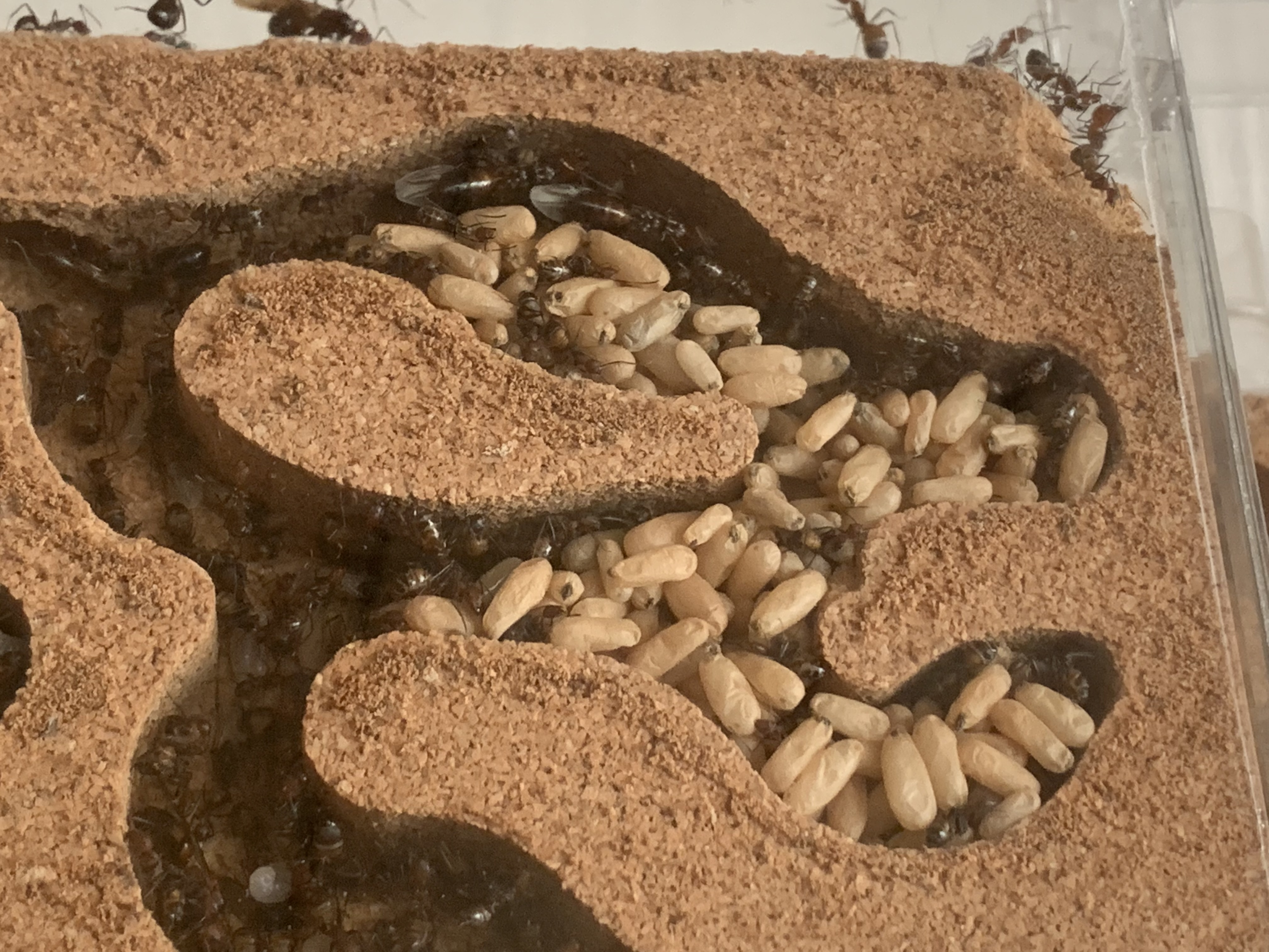 Camponotus nicobarensis einen Becher (nennt man das Becher?!?) voll mit Bienen- bzw Wachsmaden) inklusive Holzspäne in die Arena gelegt. So haben sie jetzt genügend Proteine, Kohlehydrate und Wasser zur Verfügung.