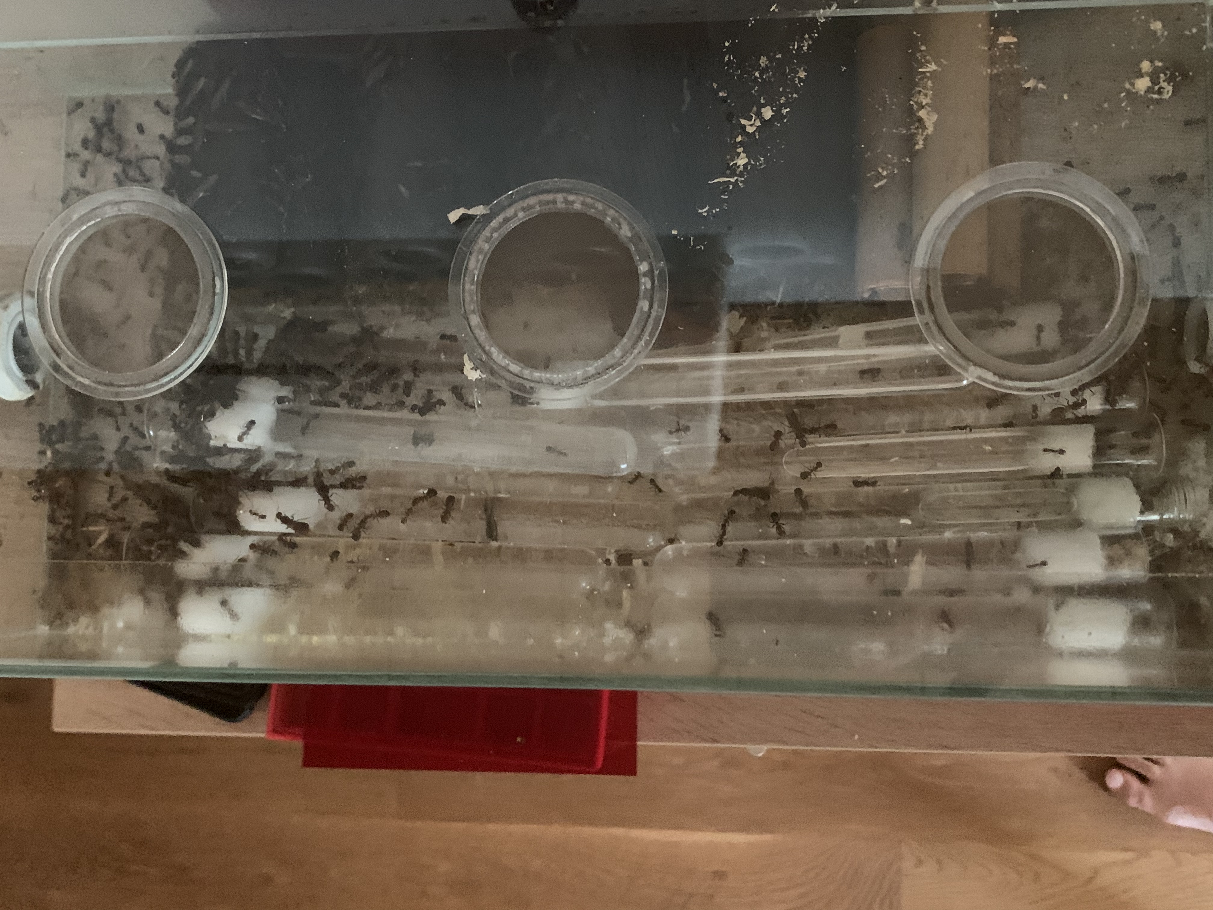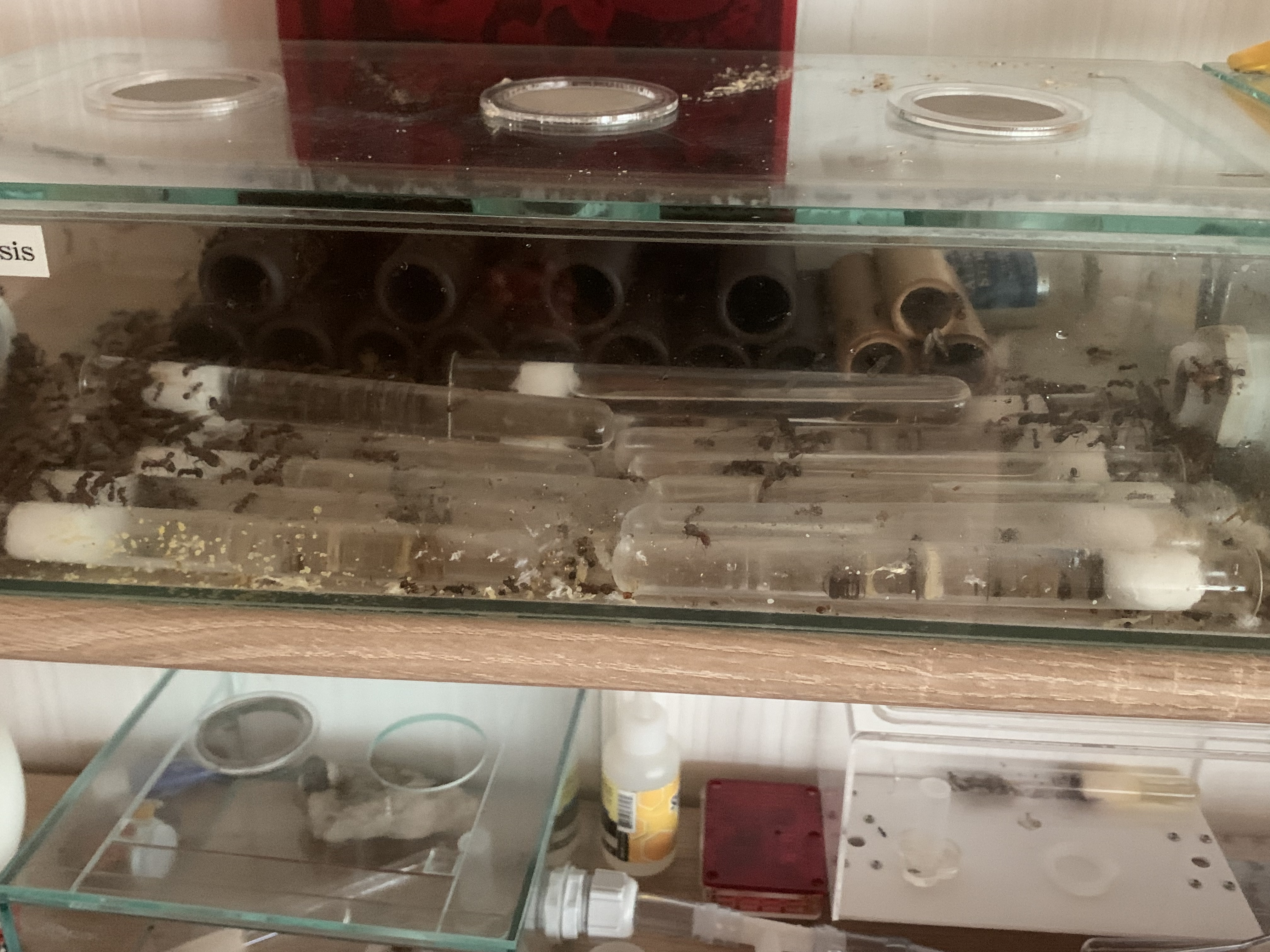 Also ich habe bereits am Donnerstag ca. 8 Reagenzgläser mit Wasser und ca. 4 Reagenzgläser mit Invertzucker-Wasser-Gemisch gefüllt und den Ameisen diese in die Arena gelegt! Es wird nach dem Urlaub wieder eine Heidenarbeit sein diese aus der Arena rauszunehmen und dabei keine Ameisen rauszunehmen (niemand hat gesagt, das Ameisenhaltung immer einfach ist).