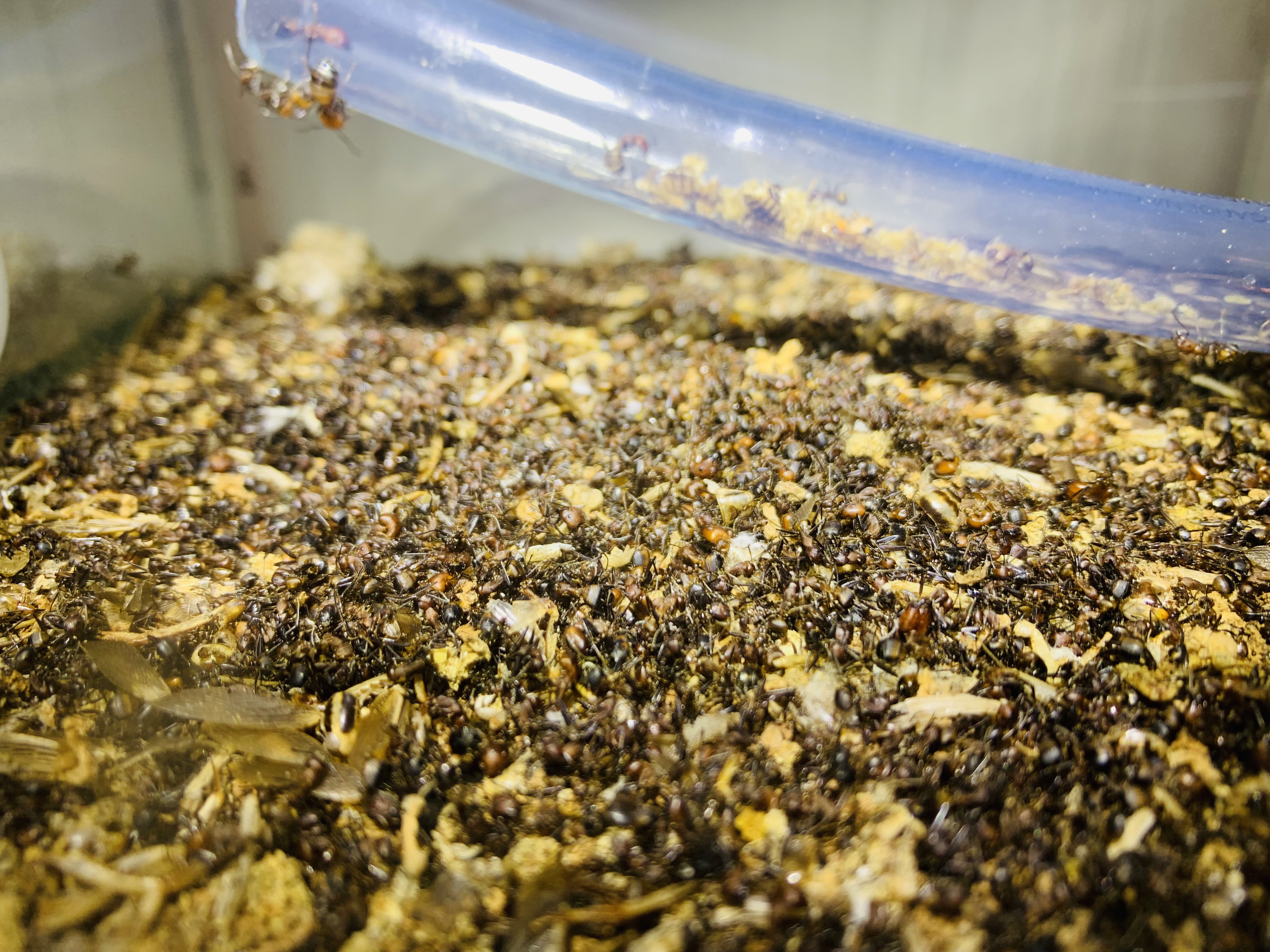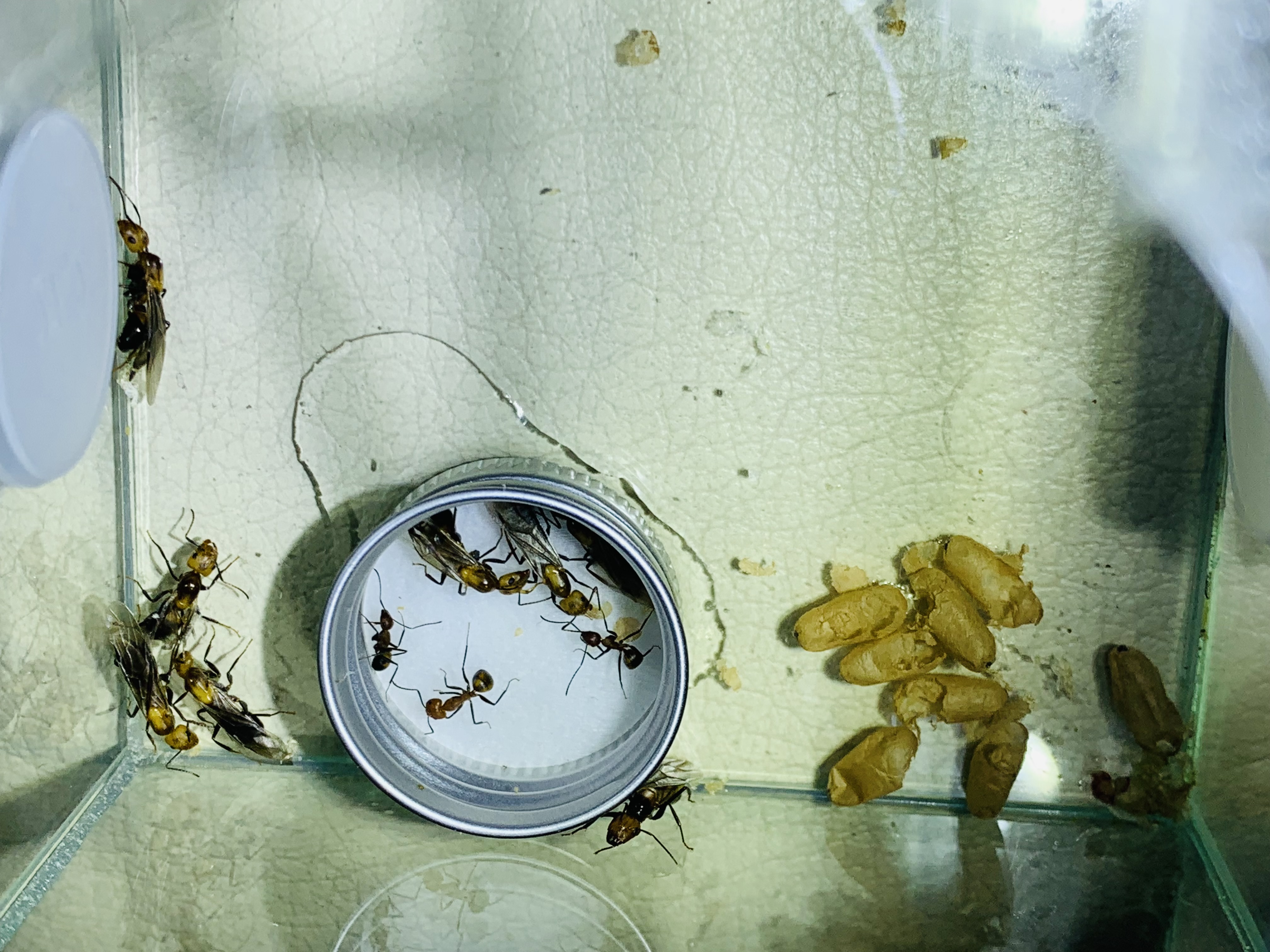 Im Sommer 2021 kam der erste Schwung an Geschlechtstieren sehr viele Jungköniginnen und Männchen wurden aufgezogen. Zuerst ist man richtig stolz, dass sie das machten, jedoch wurden diese irgendwann fast zur Plage. Trotz dem riesigen Potenzial der Jungköniginnen sind sie in der Heim-Ameisenhaltung nur Ballast. Ich habe fleißig Jungköniginnen und später auch Männchen aussortiert.