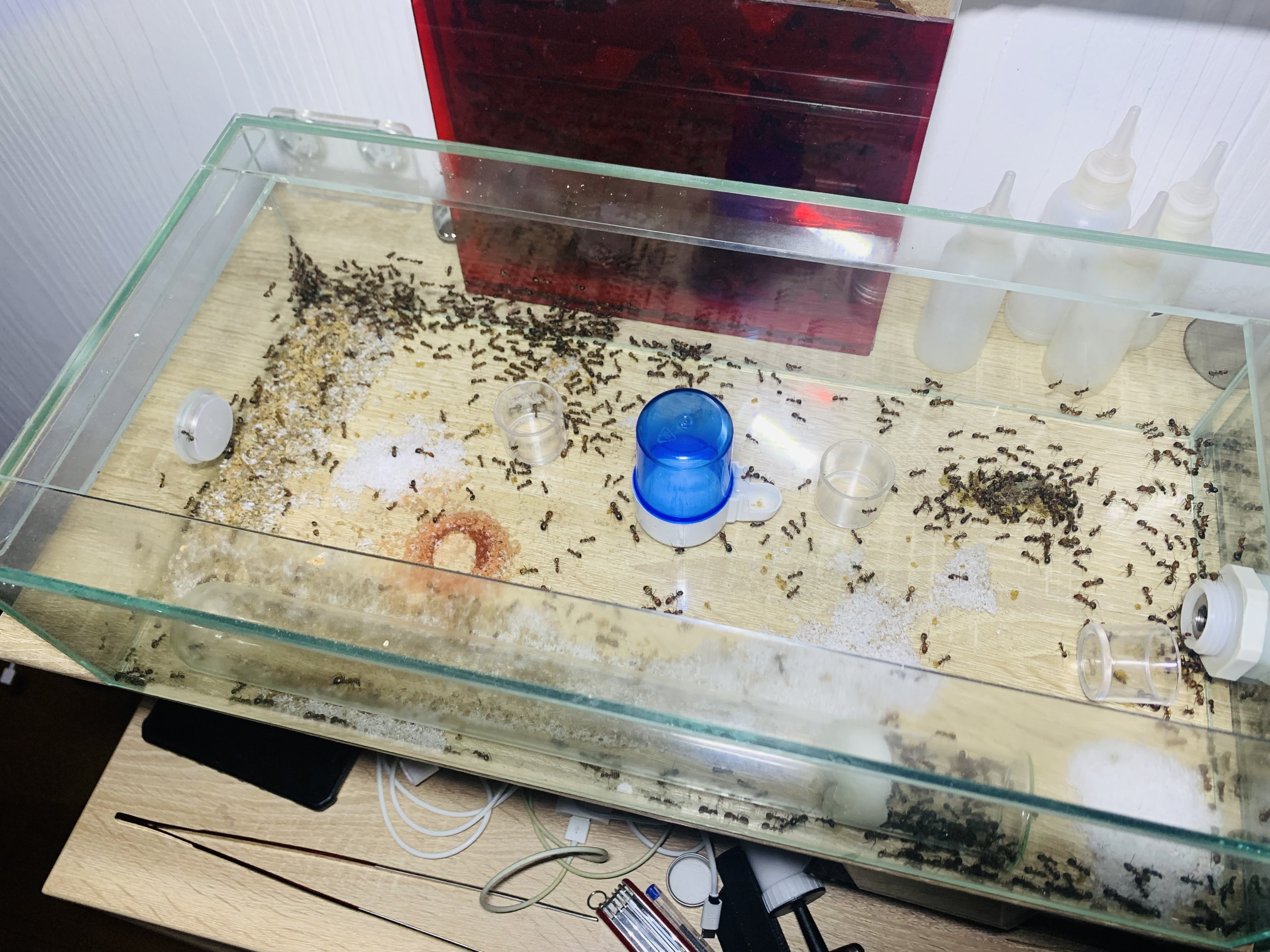 Halt, halt, in Trauer bin ich dieses Mal nicht, im Gegenteil, ich bin irgendwie froh, dass die Kolonie etwas dezimiert, denn in der anderen Arena 400x200x100 (dort wo es bis vor einiger Zeit immer Wasser gab) läuft mir die Ameisenhaltung fast aus dem Ruder!