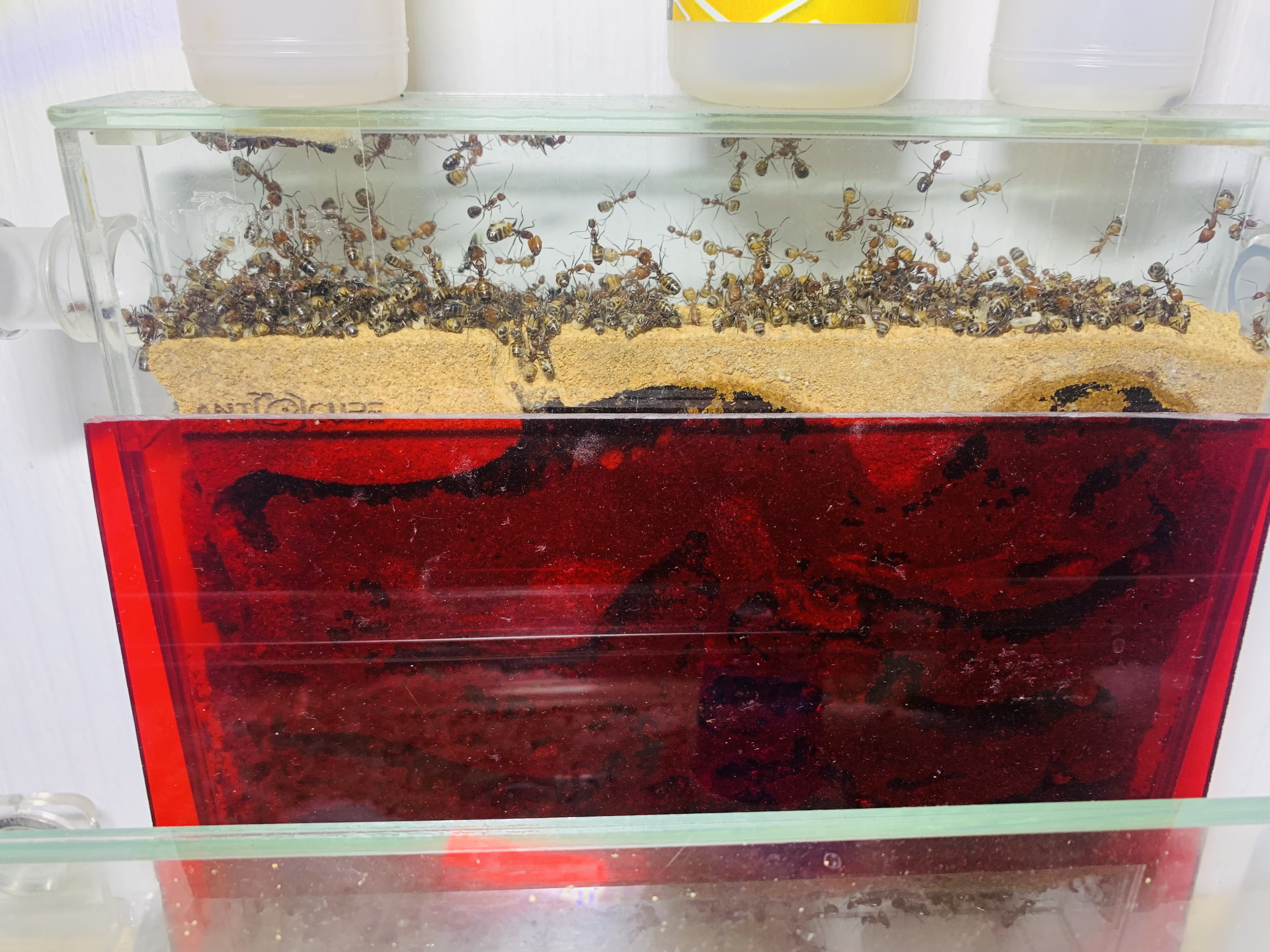 Zurück zu meinen Camponotus nicobarensis, also die Ameisen um die sich dieser Bericht eigentlich dreht! Die linke Arena (die sogenannte „WILDE“ Arena, die Fotos sind nicht so wie sie sonst immer sind, ich habe extra für die Fotos den Deckel weggemacht, es brach eine kleine Panik aus) haben sie seit Sommer total in Beschlag genommen, sie haben Ende Sommer überall in der ArenaBrut gelagert, in der Wassertränke und in den beiden Reagenzgläsern die darin noch waren und in den Shrimpsröhrchen, einfach so, dass ich nix mehr rausnehmen konnte. Ich habe dann in meiner Not einfach die rechte Arena mal sauber geputzt und seit dem gibt es dort Wasser und Invertzuckerwasser. Die Heimchen gibt es in der unteren Arena und ich füttere mittlerweile folgendermaßen: (ich habe es in diesem Ameisenhaltungs-Bericht zwar schon mal erwähnt, aber zum Geburtstagsjubiläum darf ich mich doch auch mal wiederholen)