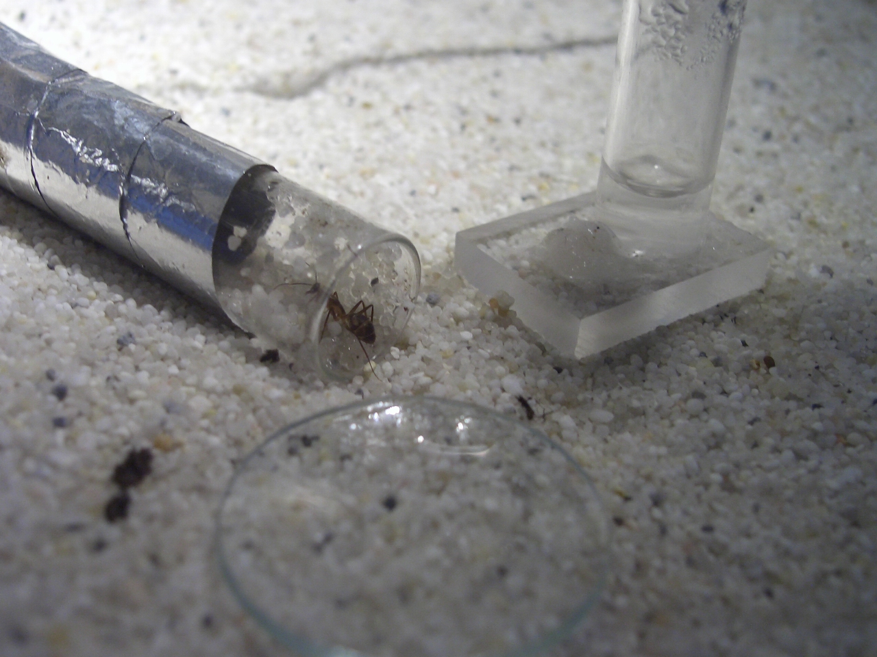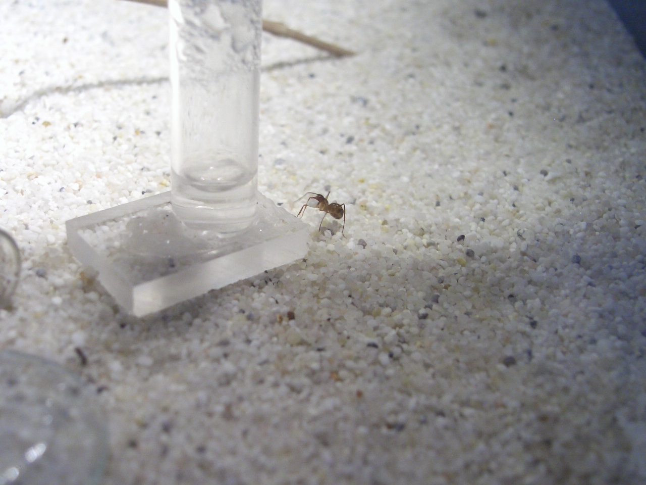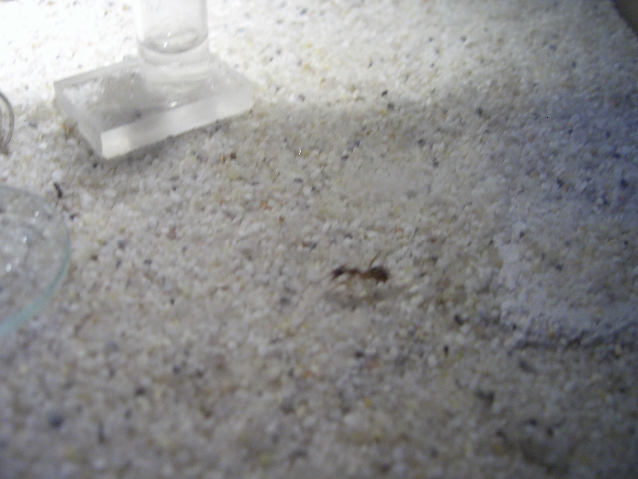 als ich heute morgen aufstand und in die Arena gucke, sah ich das erste mal eine Arbeiterin (die minor) rumkrabbeln. Sie hat Kies Körner gesammelt und in den Eingang vom RG gelegt. Kurz danach(habe wieder von vorne in das RG geguckt