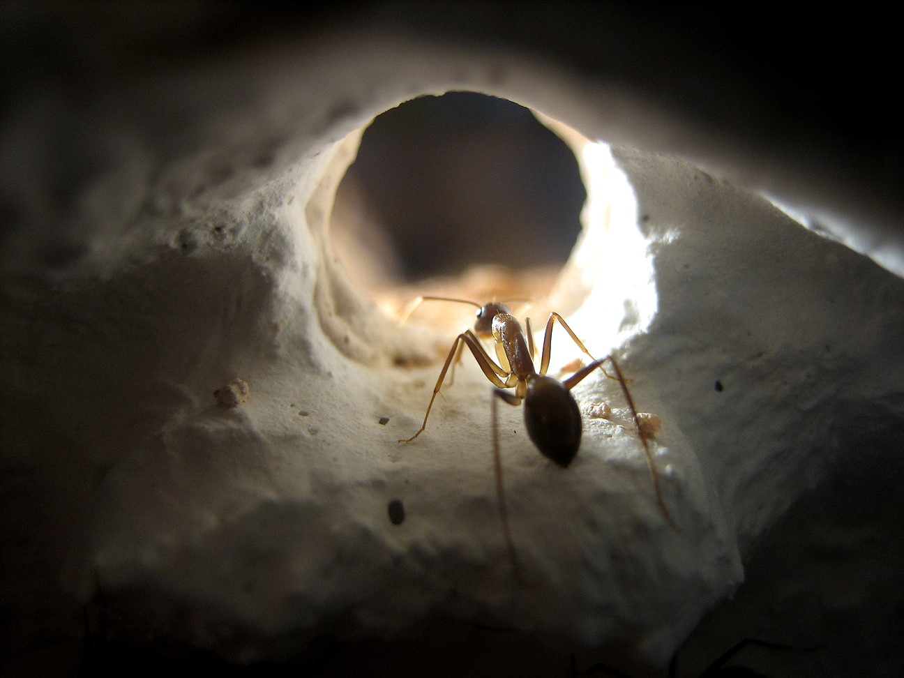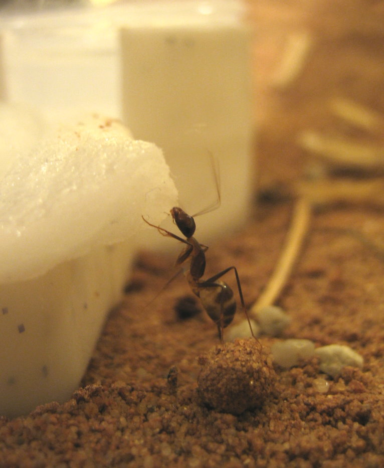 - Arttypisch & Beobachtung: Man kann von einer Art Reinlichkeit bei Camponotus fellah sprechen. Mehlwurmhälften werden, nachdem sie vollständig ausgenagt wurden (6), immer vor das Nest getragen, obwohl das Nest für eine Müllkammer groß genug wäre. Leere Kokons werden meist etwas abseits, in meinem Fall unter einer Wurzel, versteckt. Zwar fallen im Nest kleine Flecken (1-2 mm) auf, diese stammen aber zumeist von der Königin, die sich eigentlich nicht extra nach draußen bewegen dürfte um ihr Geschäft zu vollrichten. Im Gegensatz dazu lassen sich Arbeiterinnen häufig in Nestnähe beobachten, wie sie einen Tropfen aus ihrem Hinterleib abgeben und diesen dann, durch mehrmaliges Tippeln auf den Boden, verteilen. Dabei steuern sie zumeist den Müllplatz an oder von ihm weg, wo auch die Mehlwurmhälften und Geröll für den Nestverschluss gelagert werden.