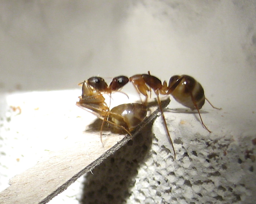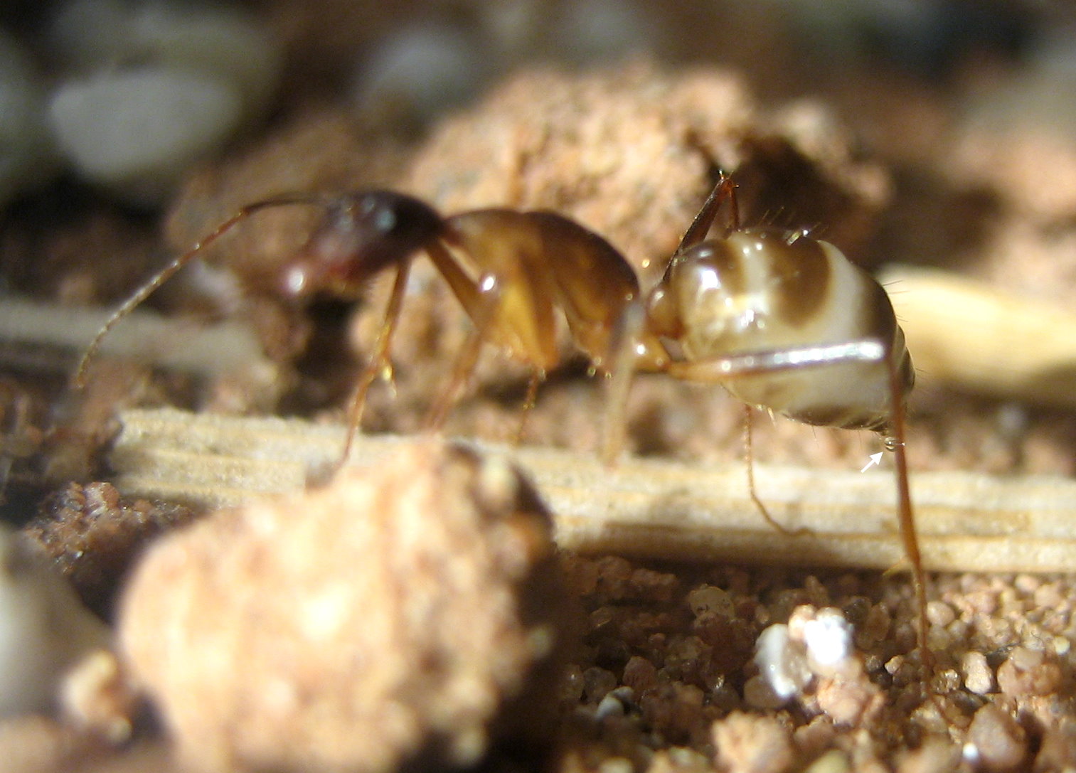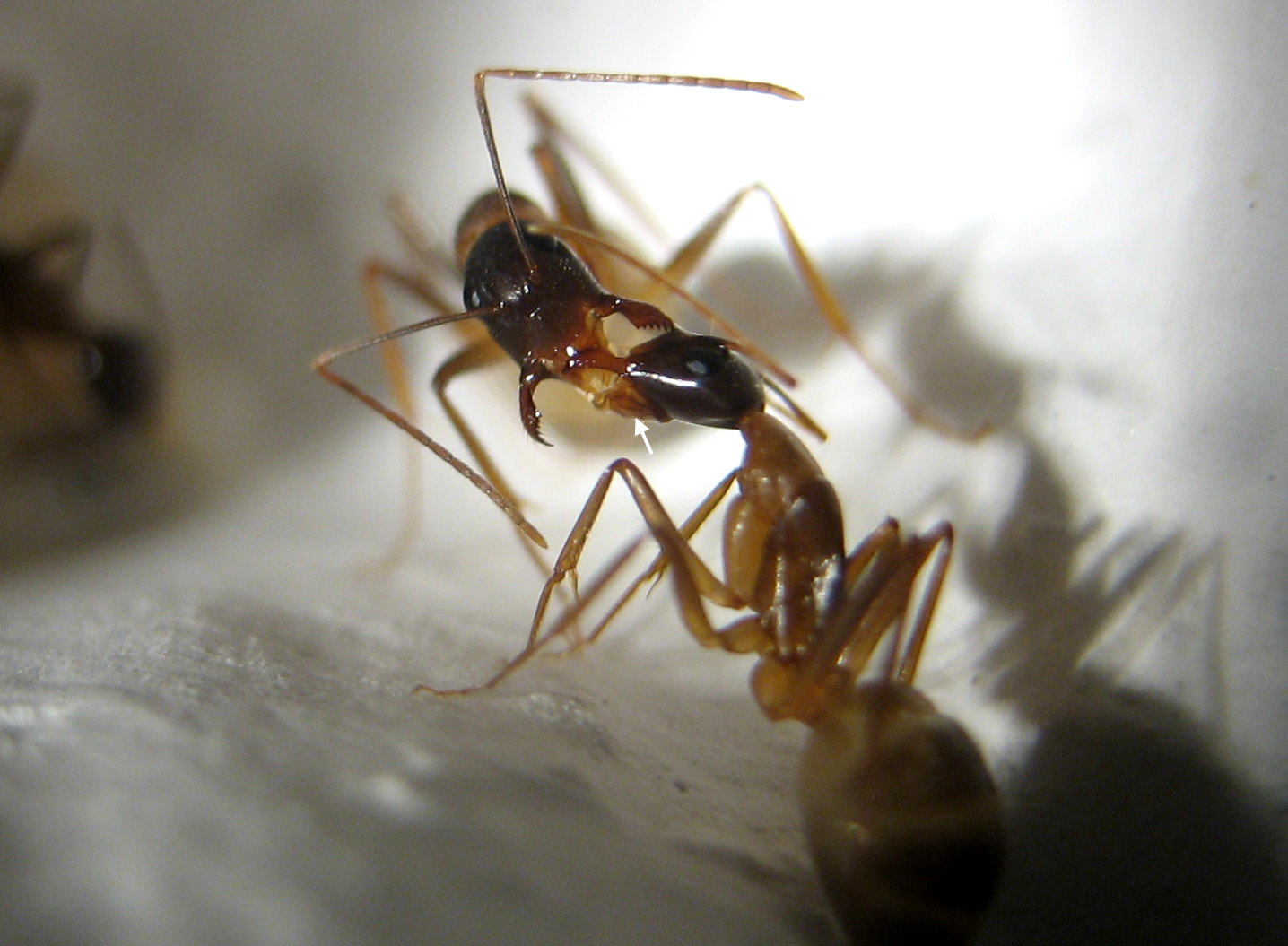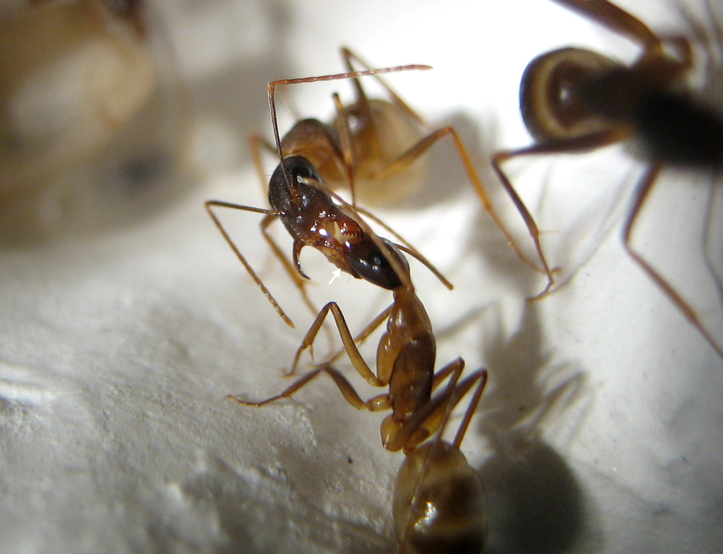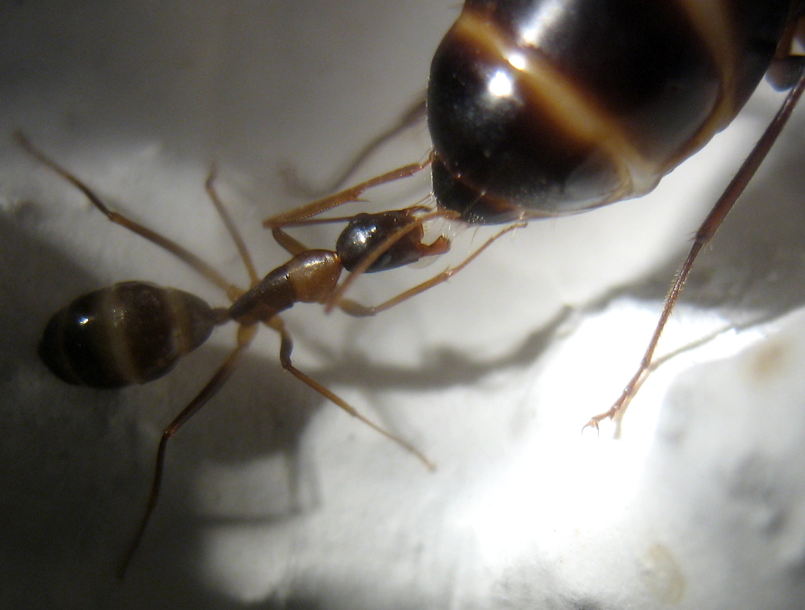 - Dieses Mal habe ich mir anstelle einer "Außendienstameise" eine Minor-Arbeiterin mit einer größeren Gaster geschnappt, nachdem sie vor dem Nest ihr Geschäft verrichtet hatte. Dies bedarf eines gewissen Geschicks und längerer Gedult, da sie, anders als die "Außendienstameisen", nur an Flucht interessiert war und erst zur Verteidigung ansetzte, nachdem ich sie in die Enge gezwungen hatte. Trotz ihrer stattlichen Größe von 10 mm sind noch größere Exemplare im Nest unterwegs. Ein unscharfes Bild dazu im Einführungsbericht unter "Größe [~mm]".