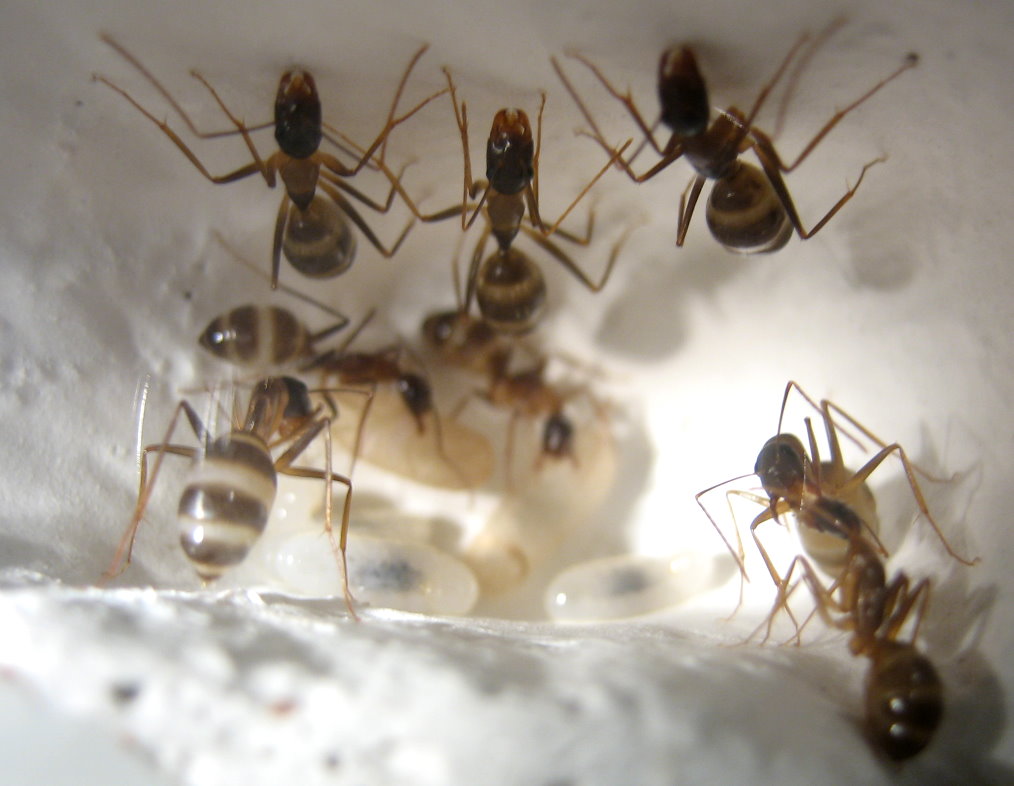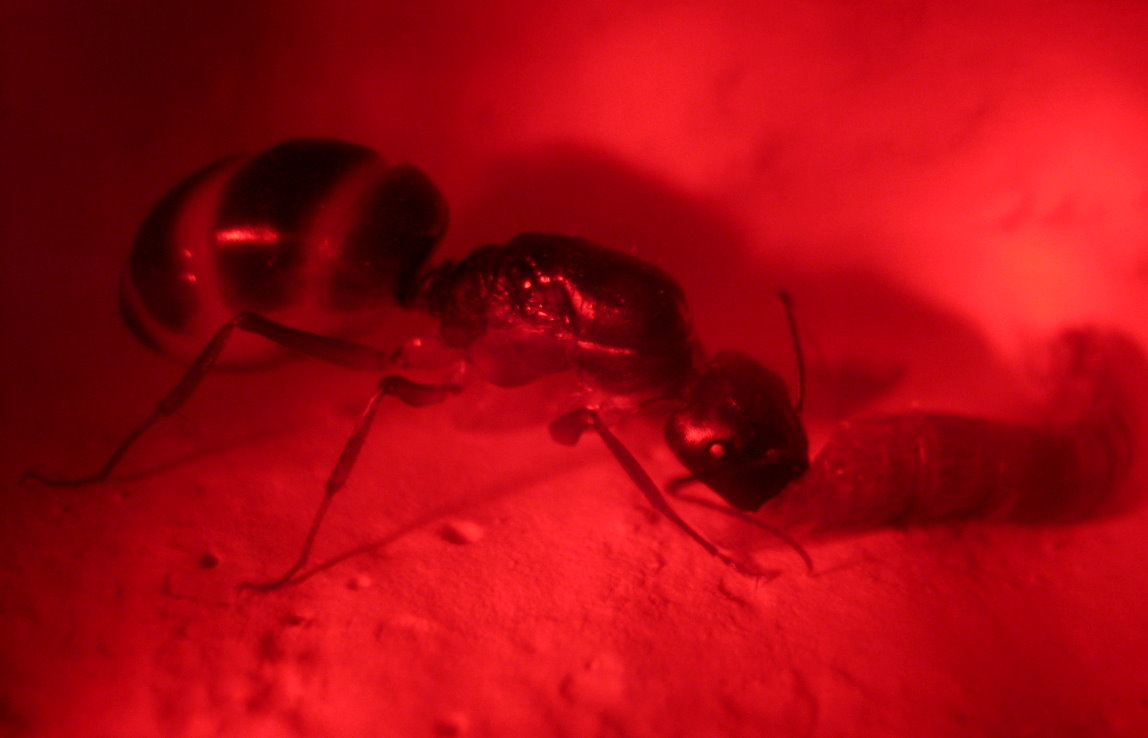 - Arttypisch: Ich durfte das erste Sonnenbad bei Camponotus (in diesem Fall C. fellah) beobachten (8). Die Temperatur belief sich punktuell auf 26 °C, bei 22 °C Zimmertemperatur. Nach einiger Zeit wurde der Eierhaufen aber wieder ins Nest gebracht, die Puppen blieben. Die Arbeiterinnen verhielten sich ruhig und ließen sich durch meine Gafferei und Knipserei nicht verunsichern. Selbst nachdem eine Arbeiterin kurzzeitig verrückt spielte, blieben die Puppen vor Ort. Keine zehn Minuten nach Ausschalten der Lampe war alles wieder im Nest verstaut. Obwohl sich an der Lampenposition nichts geändert hat, war das Sonnenbad bisher eine einmalige Beobachtung.