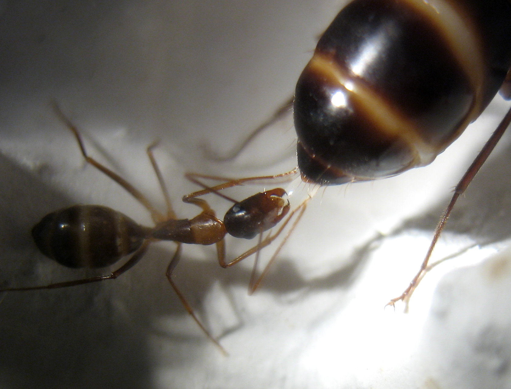- Beobachtung: Nachdem zwei Mehlwurm-Hälften vor dem Nest angeboten wurden, löst eine Arbeiterin einen winzigen Happen aus dem Futtertier und bringt ihn auf direktem Wege zu einer Larve, auf welcher das Futter auch sofort serviert wird. Schlussfolgerung: Futter muss nicht immer erst über Nestgenossinnen weitergereicht werden.
