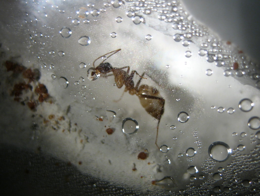 - Erfahrung: Die Eier werden zusammen mit den Larven und Puppen in der trockenen Kammer gelagert. Die Lampe wird nun so ausgerichtet, dass die feuchte Hälfte mehr Licht abbekommt und sich dadurch stärker aufheizt, woraufhin die Arbeiterinnen die Brut umlagern. Ich werde versuchen, das dritte Gelege deutlich feuchter zu halten als die zwei davor, da ich bis jetzt davon ausgehen muss, dass eine zu trockene Haltung zum Untergang der beiden ersten Gelege geführt hat. Das Kondenswasser, welches sich an der Scheibe niederschlägt, wird von den Arbeiterinnen teils aufgenommen (4).
