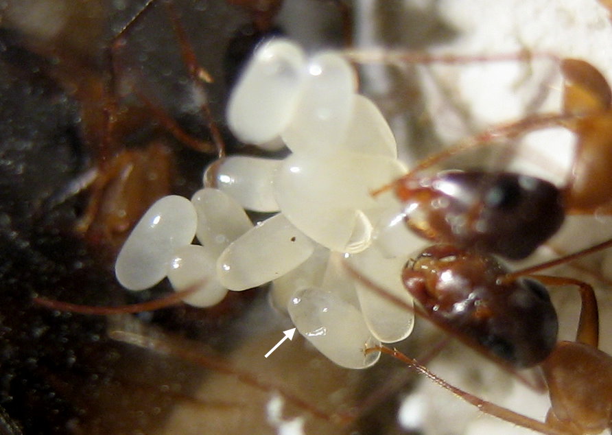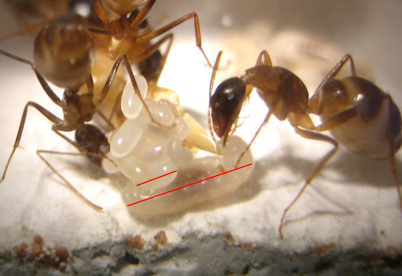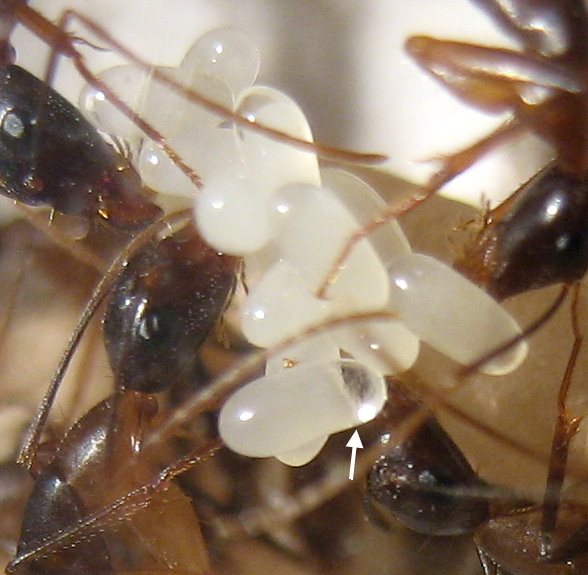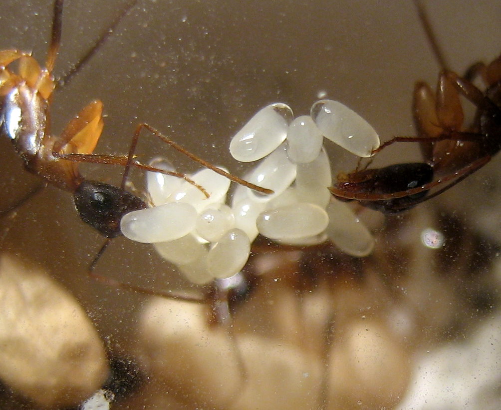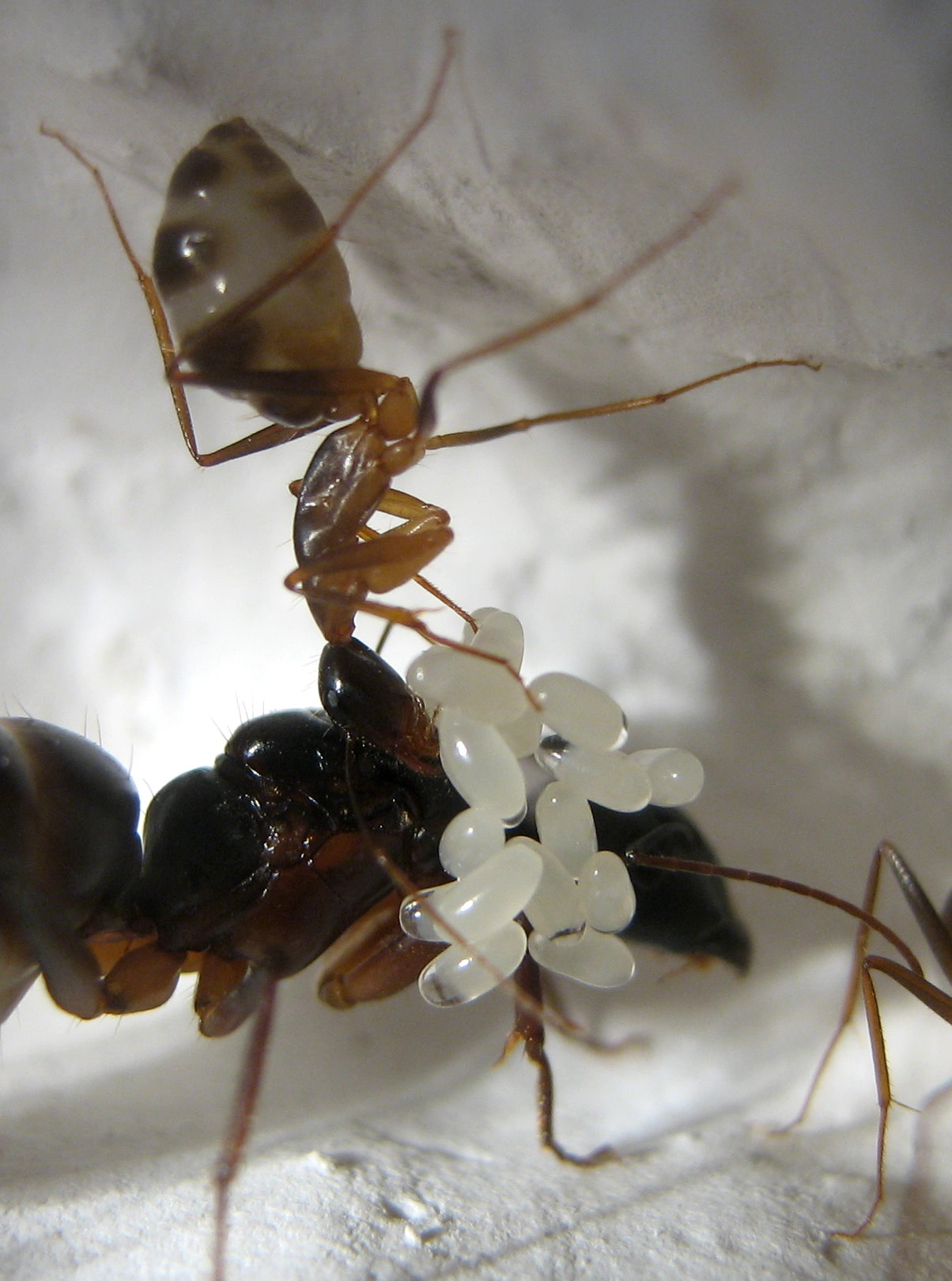- Die Eier kommen nun in Schüben. Alle zwei Tage legt die Gyne bis zu fünf Eier, zwischendurch mal ein bis zwei. Das kürzeste Intervall lag bisher bei 2,5 Stunden. Ein Ende ist (hoffentlich) noch nicht in Sicht, da das vorherige Gelege eigentlich überboten werden sollte. Bei dem "Bergen" der Eier bedienen sich die Arbeiterinnen einer interessanten Technik, indem sie das Ei mit ihren Mandibeln festhalten und sich mit den Vordergliedmaßen von der Gaster der Gyne abstoßen (1), (2), (3).