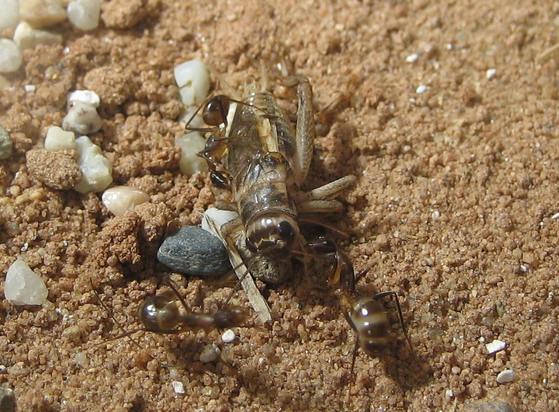 - Erfahrung: Zur Abwechslung (und zum ersten) mal überbrühte Heimchen ausprobiert (7). Ergebnis war helle Aufregung vor dem Nest mit permanent fünf Arbeiterinnen (von 14) am Futtertier. Am nächsten Tag wurde das Heimchen immer noch außerhalb des Nestes bearbeitet. Die Sprungbeine werden leider ignoriert. Deshalb finde ich Mehlwürmer nach wie vor am geeignetsten, da diese komplett ausgehöhlt werden.