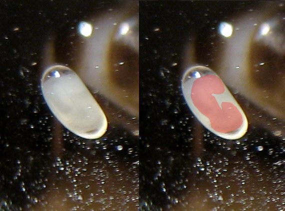 - Ich warte, dass die ersten Arbeiterinnen schlüpfen und sich die Eier weiterhin so gut entwickeln, wie's bisher den Anschein macht (1). Sie tragen alle noch ihre charakteristische "Blase", welche ich als Zeichen eines ausgeglichenen Drucks interpretiere (2). Wird es im Nest zu trocken, trocknen die Eier aus und die Wasserblase verschwindet - die Eier schrumpeln und schrumpfen in sich zusammen (3). Nachdem ich im Nest eine gewisse Feuchtigkeit halte, bleiben auch die Eier in Form - von ein paar Blessuren abgesehen (4).