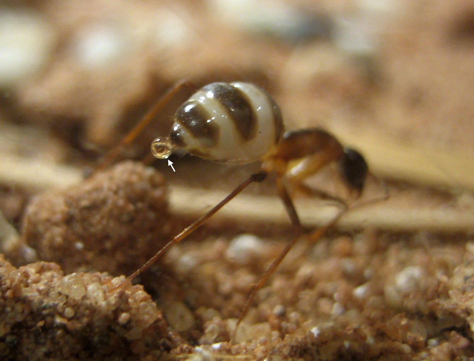 berichtet. Leider kann ich nicht sagen, ob es sich dabei um ein Ausscheidungsprodukt handelt (wie bei Wirbeltieren der Urin) oder nur um eine überschüssige Zuckerlösung. Die Arbeiterinnen streifen den Tropfen immer an der gleichen Stelle vor dem Nest ab.[/font]