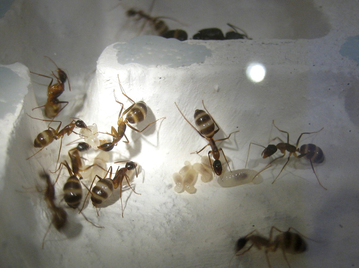 - Zwei Arbeiterinnen sind erst nach 35 und 37 Tagen geschlüpft. Fast um eine Woche verzögert, da die Beleuchtung aufgrund zweiwöchiger Uni-Aktivitäten zurückgefahren werden musste.