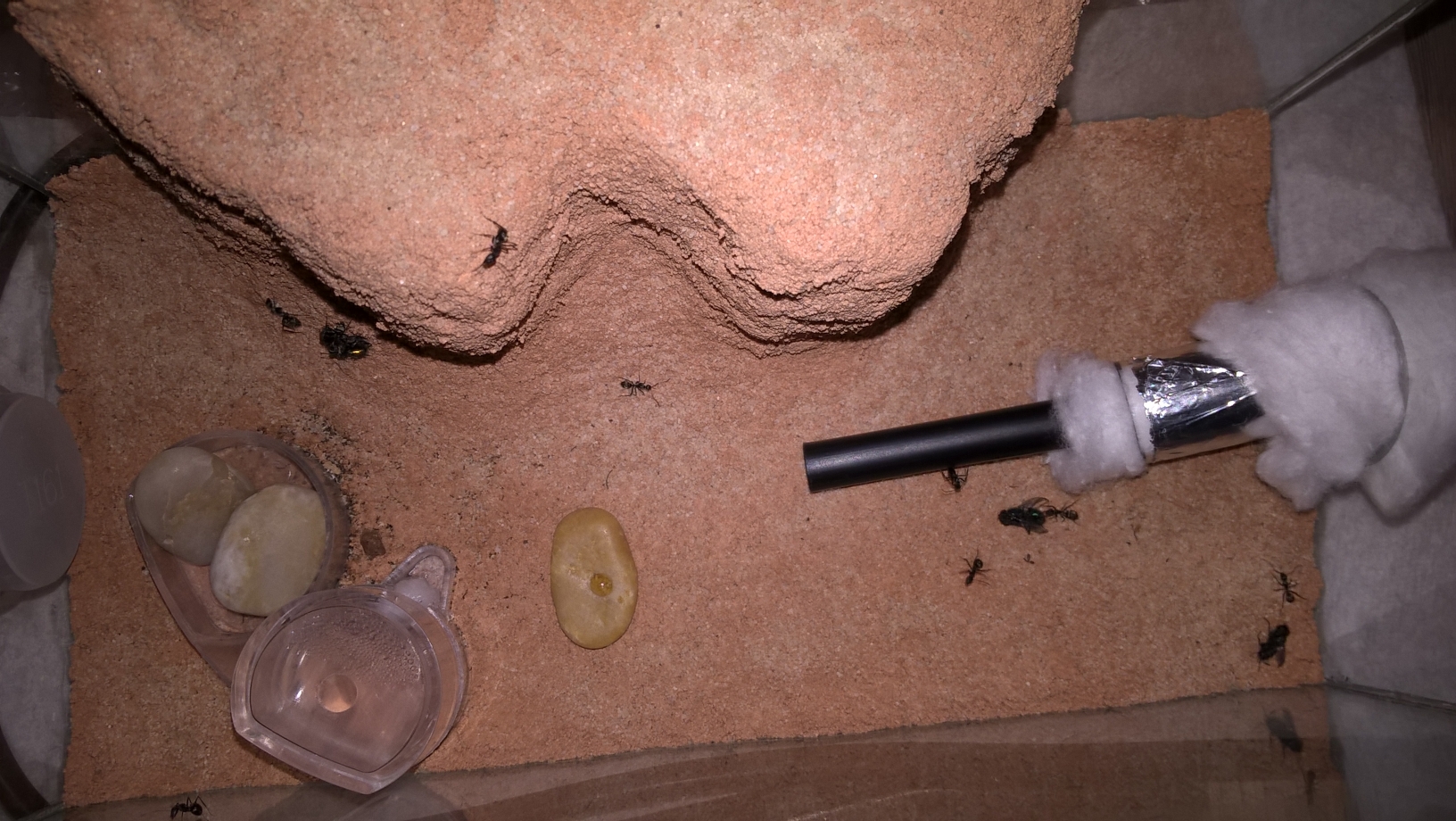 Es wird immer schwieriger fĂŒr mich, Einblick in das Nest zu bekommen, da eigentlich immer Arbeiterinnen in der Arena aktiv sind und sich die Entfernung des RGs dadurch schwieriger gestaltet. Daher freue ich mich natĂŒrlich, dass sie mir ihre Brut nun so prĂ€sentieren. ;) Bald jedoch werde ich Ihnen das neue externe Gipsnest anbieten und habe somit wieder besseren Zugang und Einsicht in das Nestleben. Ich schĂ€tze spĂ€testens im Januar wird es soweit sein. Dann haben die Kleinen auch erstmal 1m Schlauch zur Arena zurĂŒckzulegen, ich glaube das ihnen das gefallen wird. Sie sind immer noch sehr aktiv und auch schon gut dabei dem Parafin den Kampf anzusagen. Recht putzig dabei zuzuschaun, wie sie immer wieder hoch laufen und dann aber durch das Parafin runterrutschen. Teilweise dĂŒsen meine Kleinen mit highspeed durch die winzige Arena, besonders dann, wenn das Heizkabel schon einige Stunden angeschaltet ist.