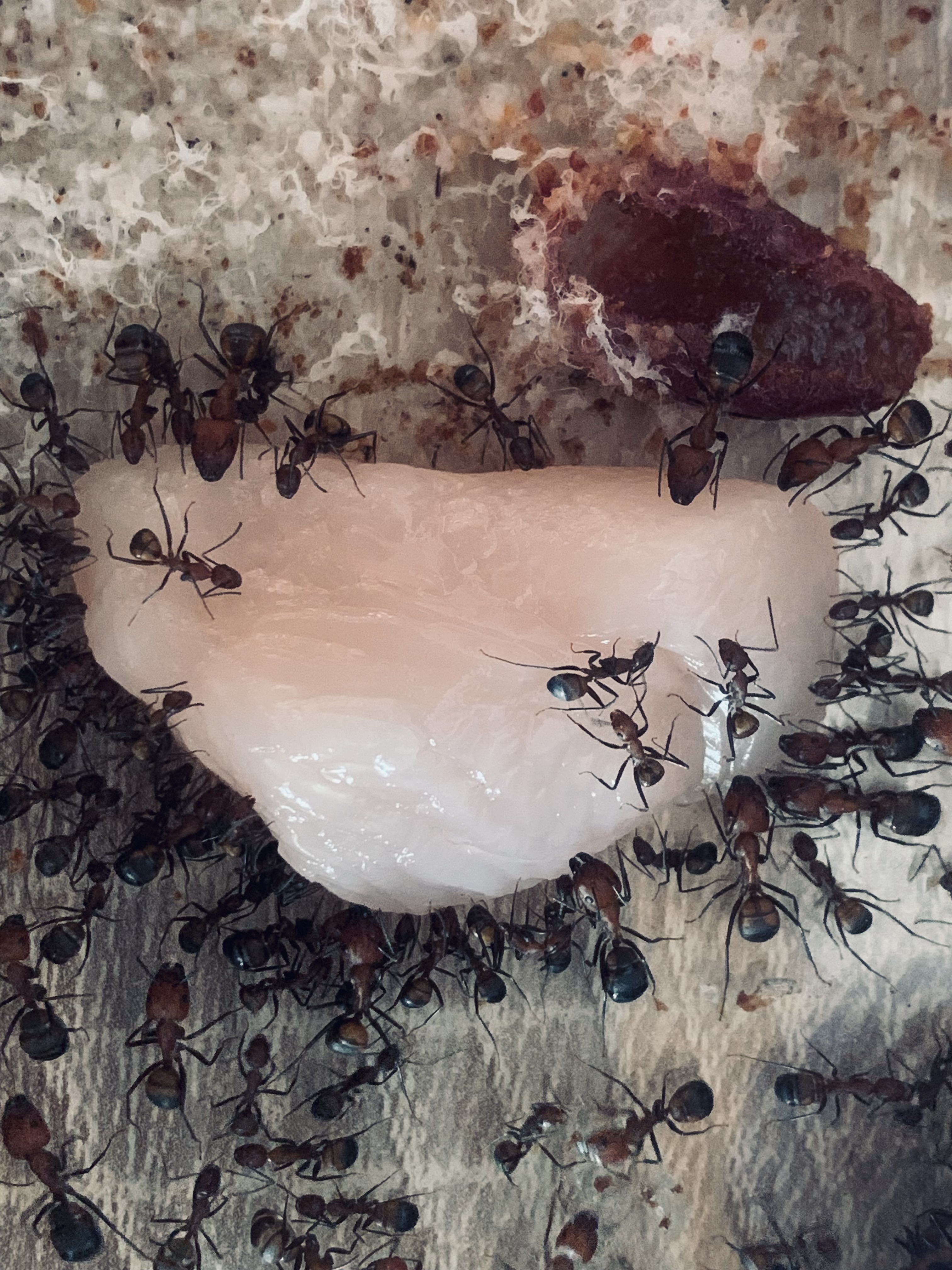 Ich habe meinen Camponotus nicobarensis heute wieder mal seit langer langer Zeit ein Stück Hühnerfleisch angeboten: