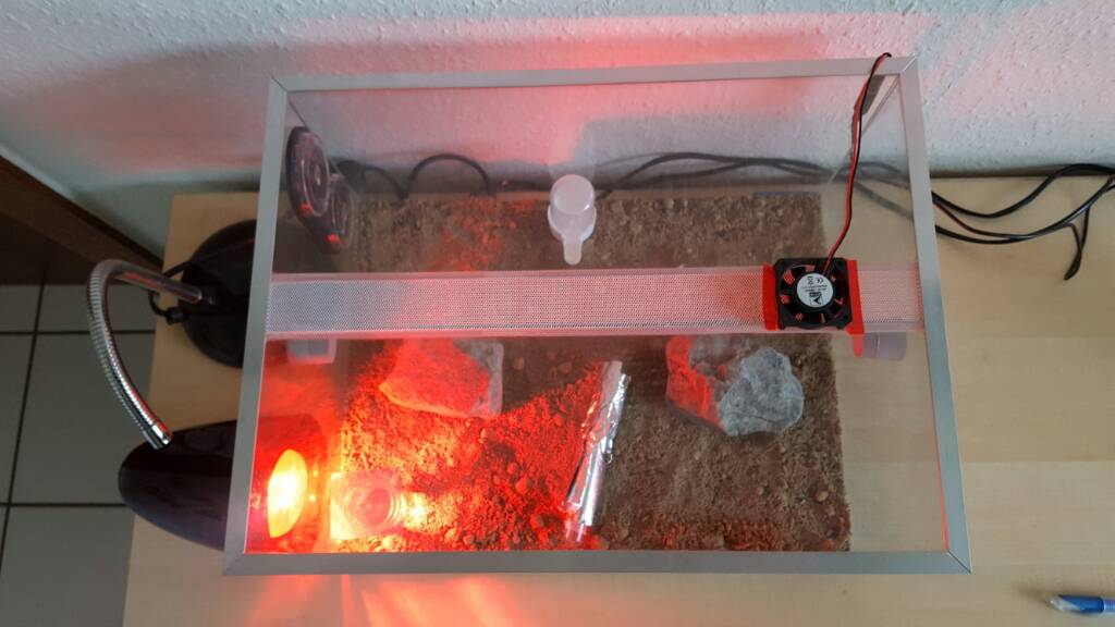 Die Arena hatte ich schon rudimentĂ€r vorbereitet. Ich hab eine rote Sand-Lehm-Mischung ordentlich getrocknet und darĂŒber eine dĂŒnne und lockere Schicht Regenwaldgrund verteilt. Unter dem Becken klebt auf einer Seite eine 7W Heizmatte: