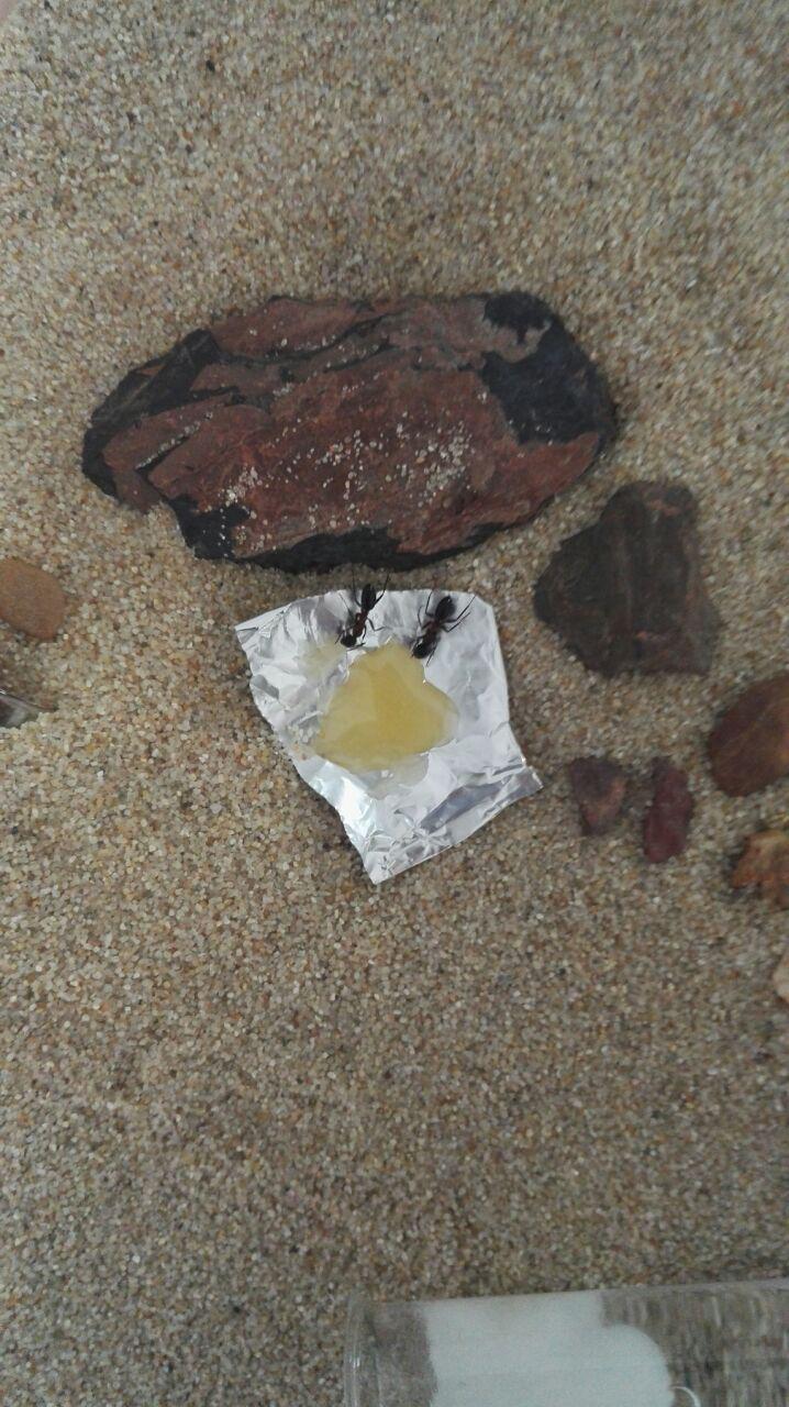 Hier sieht man Ameisen wie sie das erste mal Honig bekommen