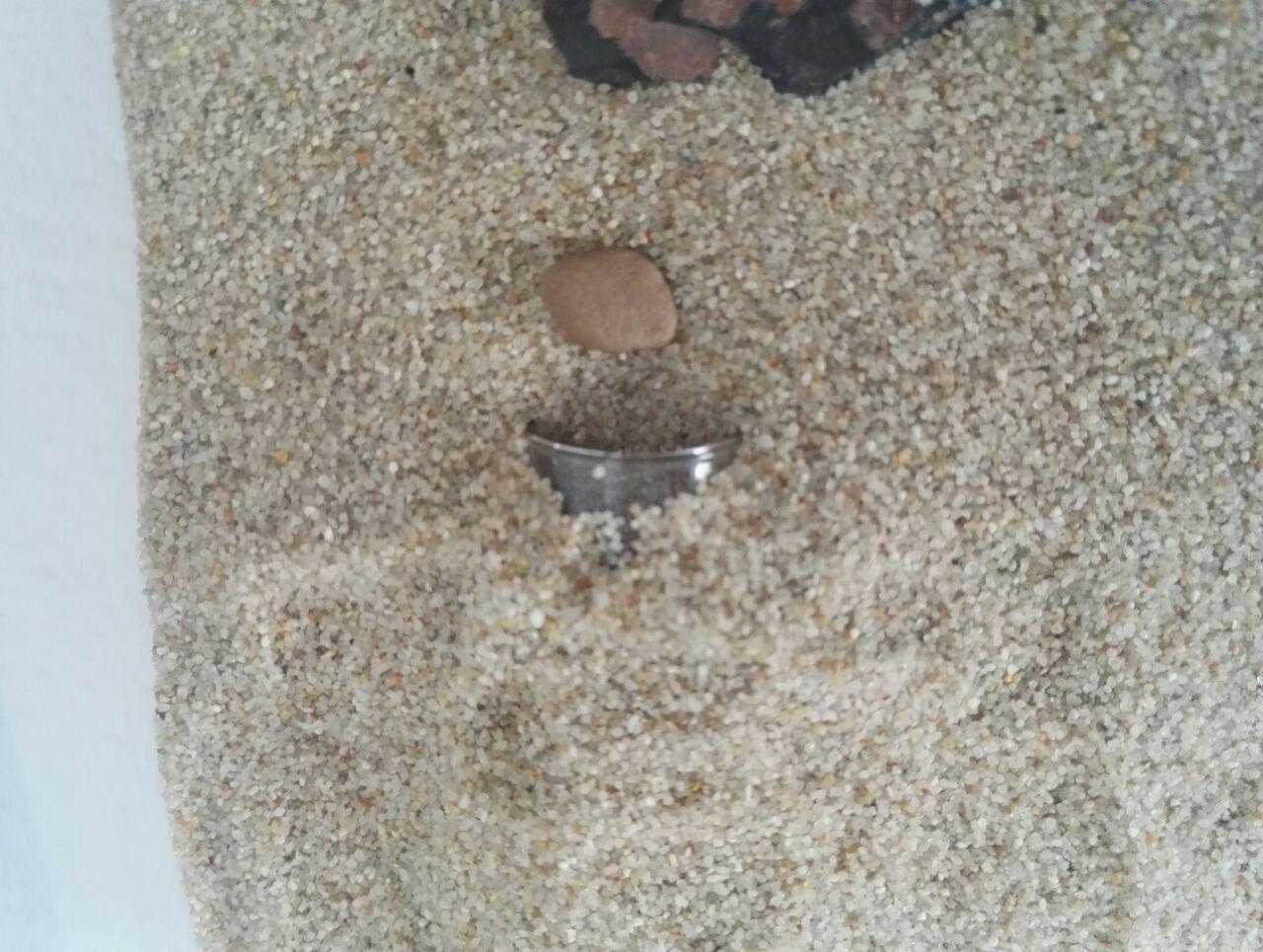 Die Außenwelt besteht aus Terrariumsand und Steinen welche ich gesammelt und gewaschen hatte. Dort scheinen sie sich wohl zu fĂŒhlen. Auf dem großen Stein lege ich ihnen immer das Futter hin welche sie dann meistens ohne wo anders hinzerren.