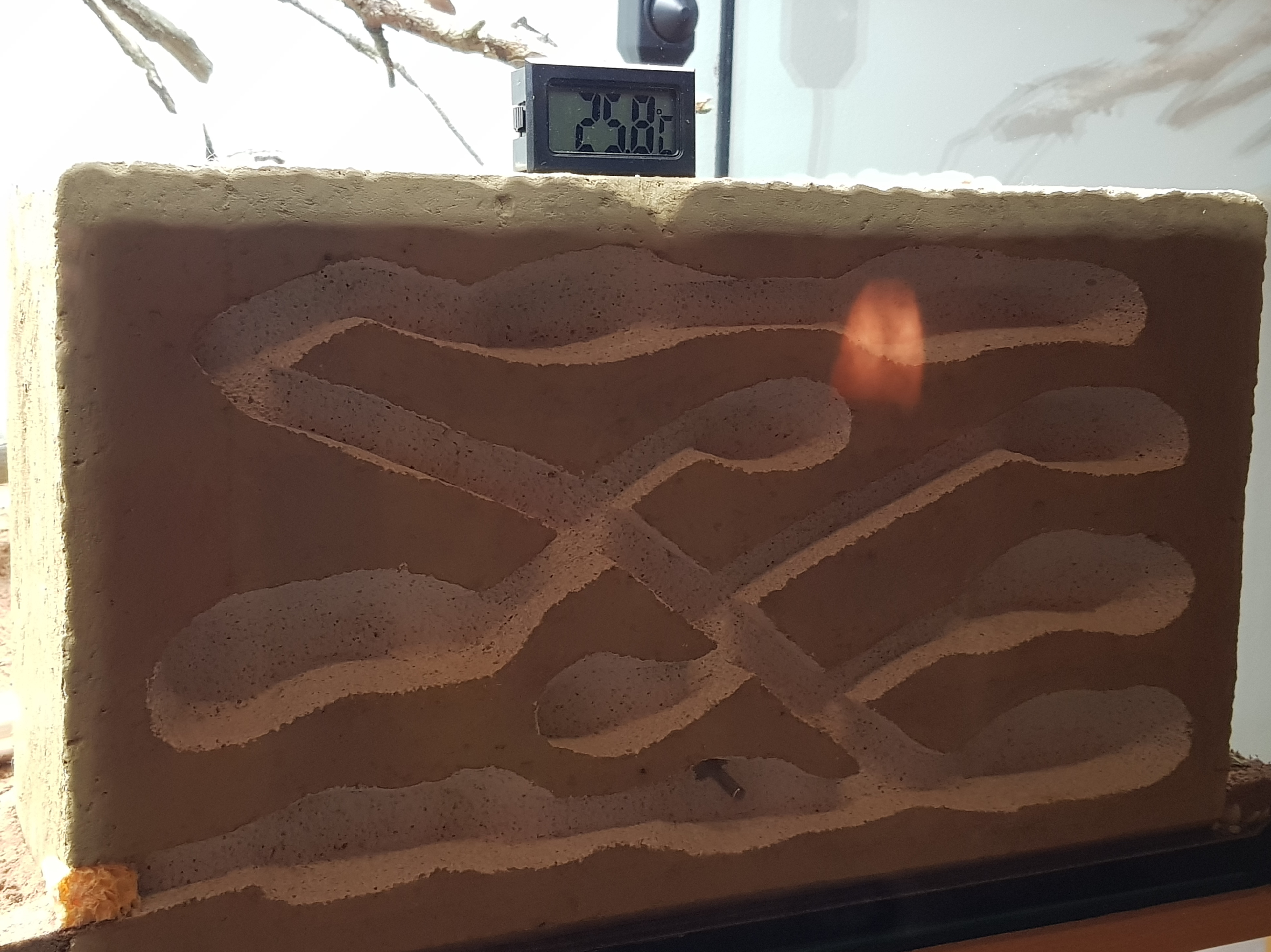 Beim Nest habe ich mich für ein einfaches Ytong-Nest entschieden, welches ich mit Lehm bestrichen habe. Unter dem Nest befindet sich eine regelbare 7W Heizmatte und ein Thermometer mit Sensor ermöglicht es mir, die richtige Temperatur einzustellen. Fürs Erste ist es geschlossen.