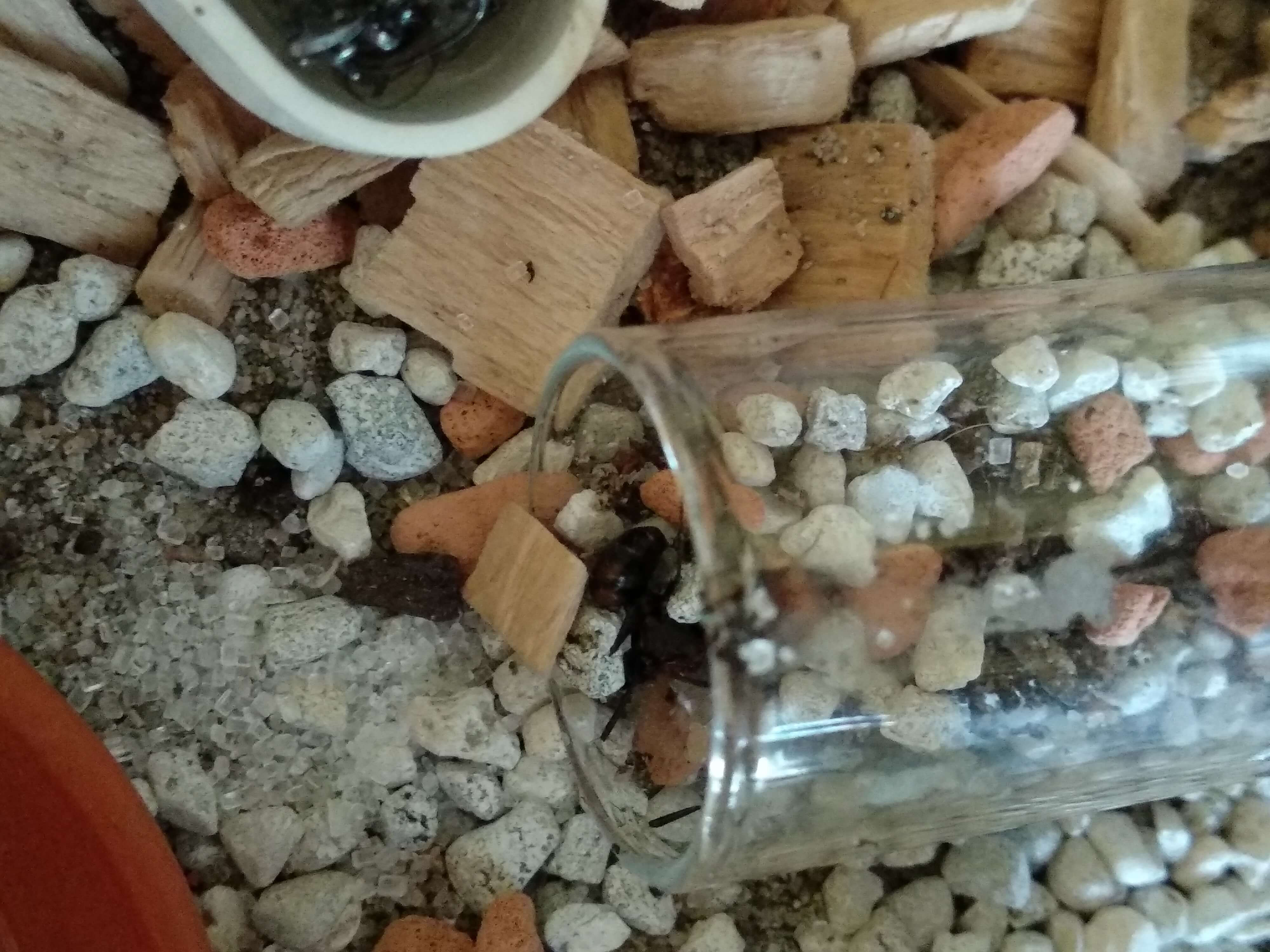 Das Futter wird immernoch ignoriert und die C. nicobarensis Königin wurde halbwegs eingegraben in Steinchen, welche anscheinend neu über Nacht in das RG transportiert wurden.