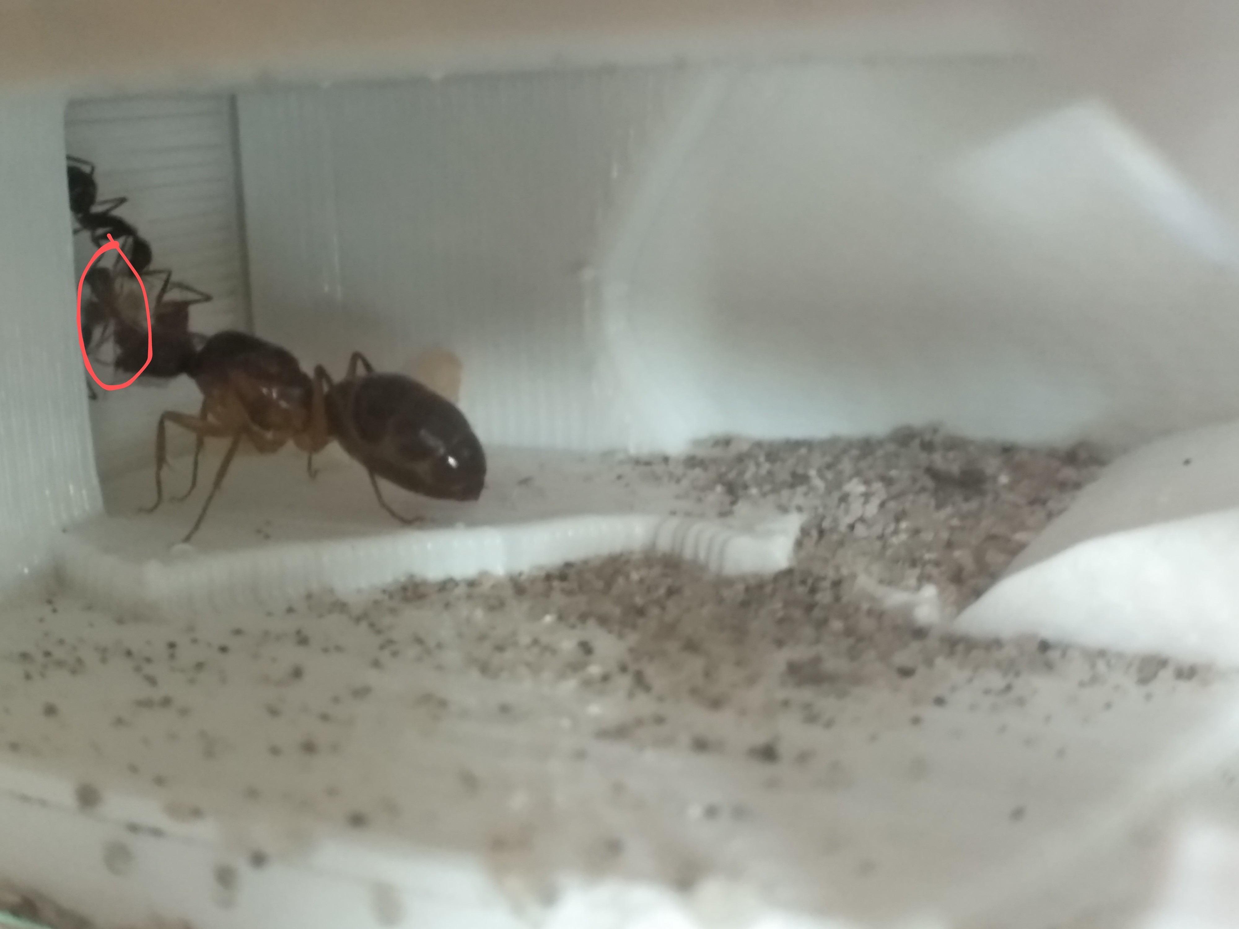Heute morgens habe ich sie nämlich wieder im Nest gefunden. Ich habe die Klappe des Nests nur kurz geöffnet um sicherzustellen, dass die Königin auch wirklich dort ist und nicht irgendwo anders in der Arena nistet, deshalb konnte ich nicht sehen, ob sich was mit dem Nachwuchs getan hat. Die Klappe werde ich die nächsten paar Tage drauf lassen damit die Ameisen sich gut genug an das Nest gewöhnen, vor allem weil ich das RG endlich entfernen möchte. Dort sehe ich schon kleine Wasserflächen, welche die Ameisen oder Larven evtl. ertänken könnten. Außerdem bin ich mir zwar nicht zu 100% sicher aber es sieht für mich aus, als würde sich dort Schimmel bilden.