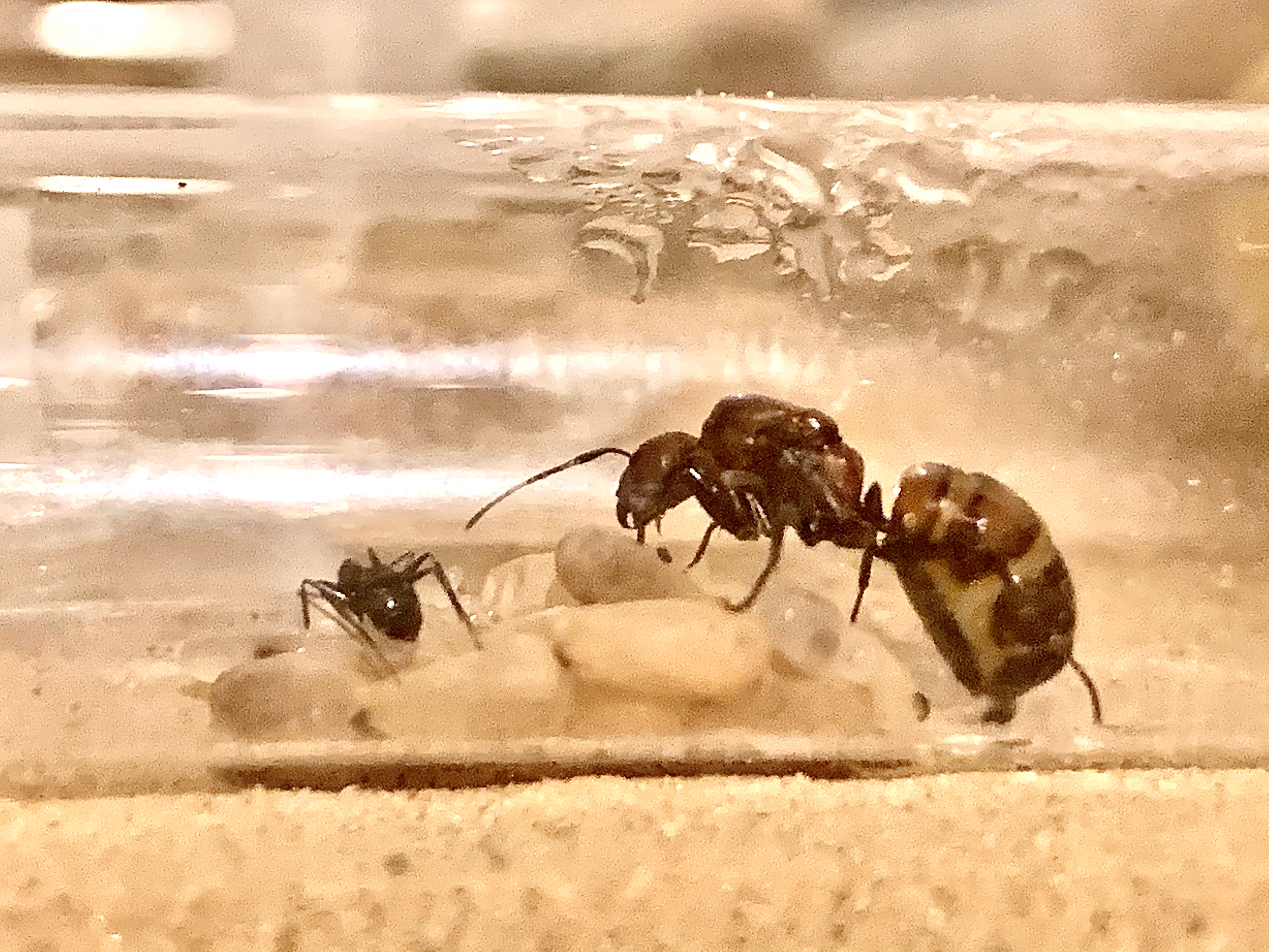 Ich hielt diese Ameisen im Dunkeln, aber nach einem Monat mussten sie in die Winterruhe, meine Frau war gar nicht begeistert als ich diese Ameisen zum Überwintern in den Kühlschrank legte. Nach einigem hin und her hatte ich doch noch gewonnen und diese Ameisen durften im Kühlschrank überwintern.