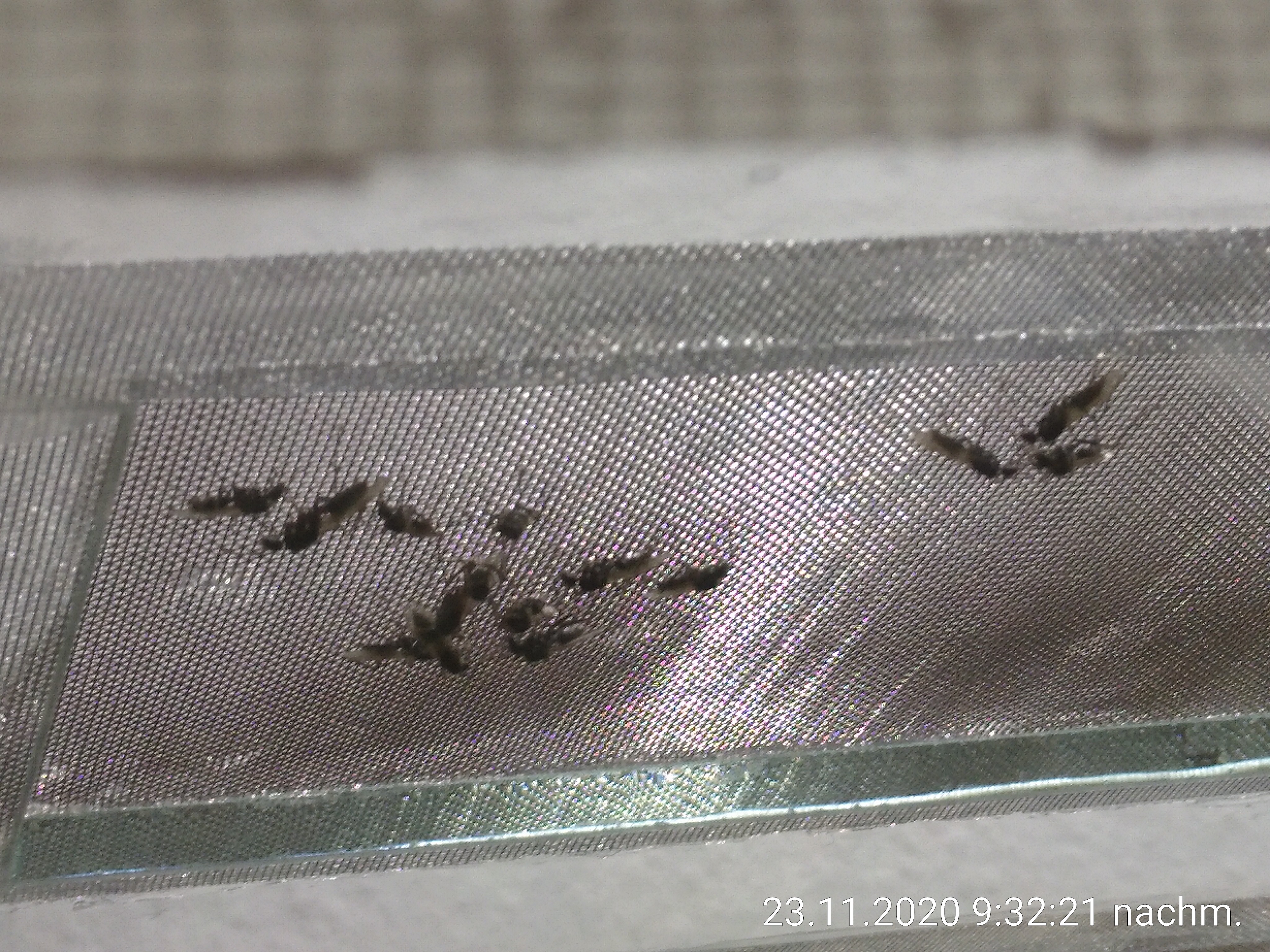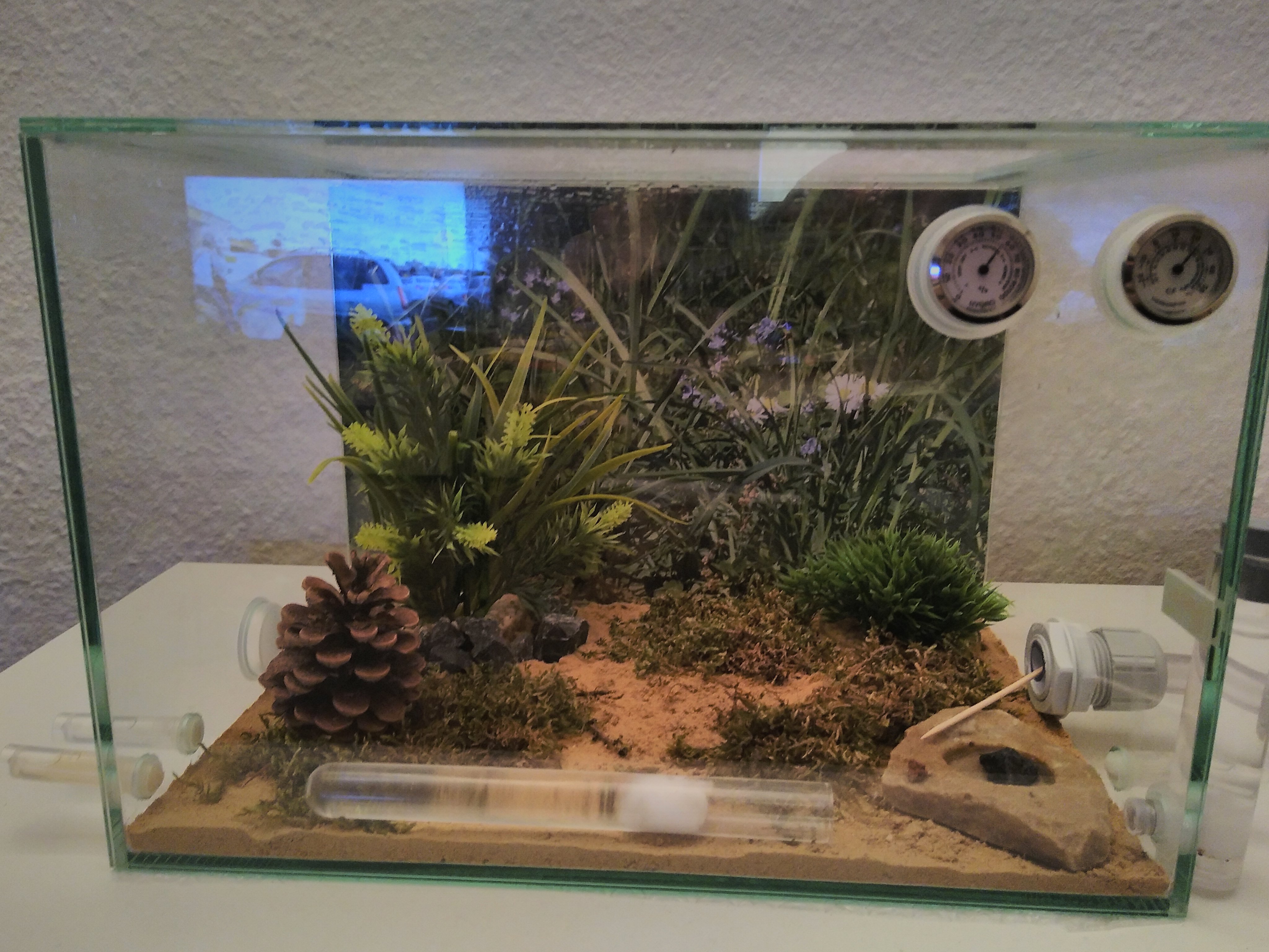 In der ersten Zeit, als sie noch weniger als 100 waren, habe ich ihnen öfters Spinnen gegeben. Fanden sie super. War immer eine passende Portion. Selbst ein kleines Heimchen war da immer noch viel zu viel. Fliegen kommen auch besonders gut an. Da stehen sie voll drauf. Die dürfen auch gern noch ein bisschen zappeln. Einen dicken Brummer haben sie diese Woche erst aktiv gefangen. Der hat sich mindestens eine halbe Stunde im alten Becken aufgehalten. Irgendwann habe ich dann den Deckel drauf gemacht, um zu sehen, was passiert. Den entscheidenden Moment habe ich aber verpasst und Fotos habe ich leider auch nicht gemacht. Er hat noch mindestens 2 Stunden durchgehalten, wurde natürlich immer wieder aufgescheucht und ist dann wahrscheinlich irgendwo in eine Ritze ins Nest gefallen, z.B. an der Scheibe abgestürzt. Ich habe ihn nie wieder gesehen...