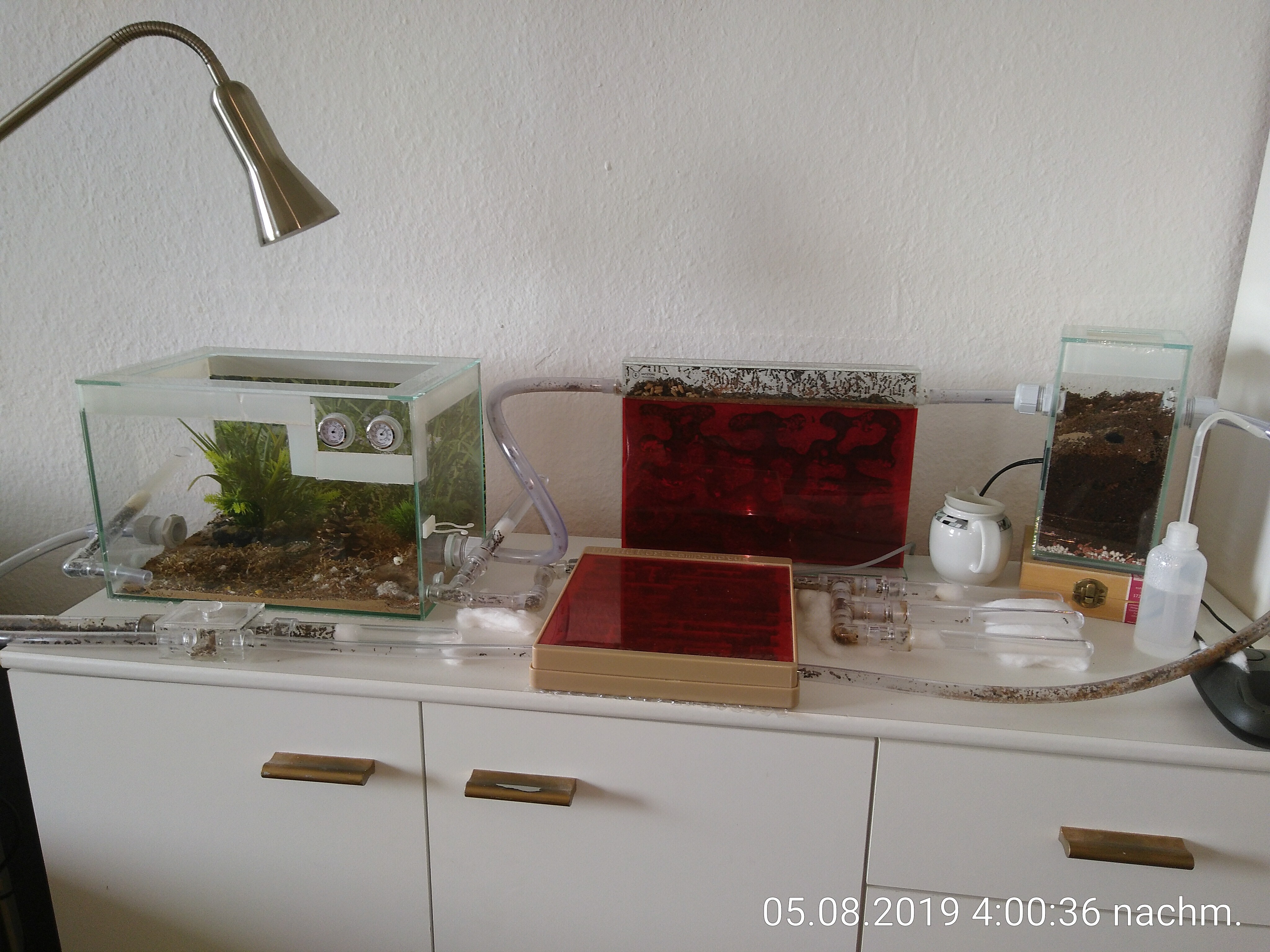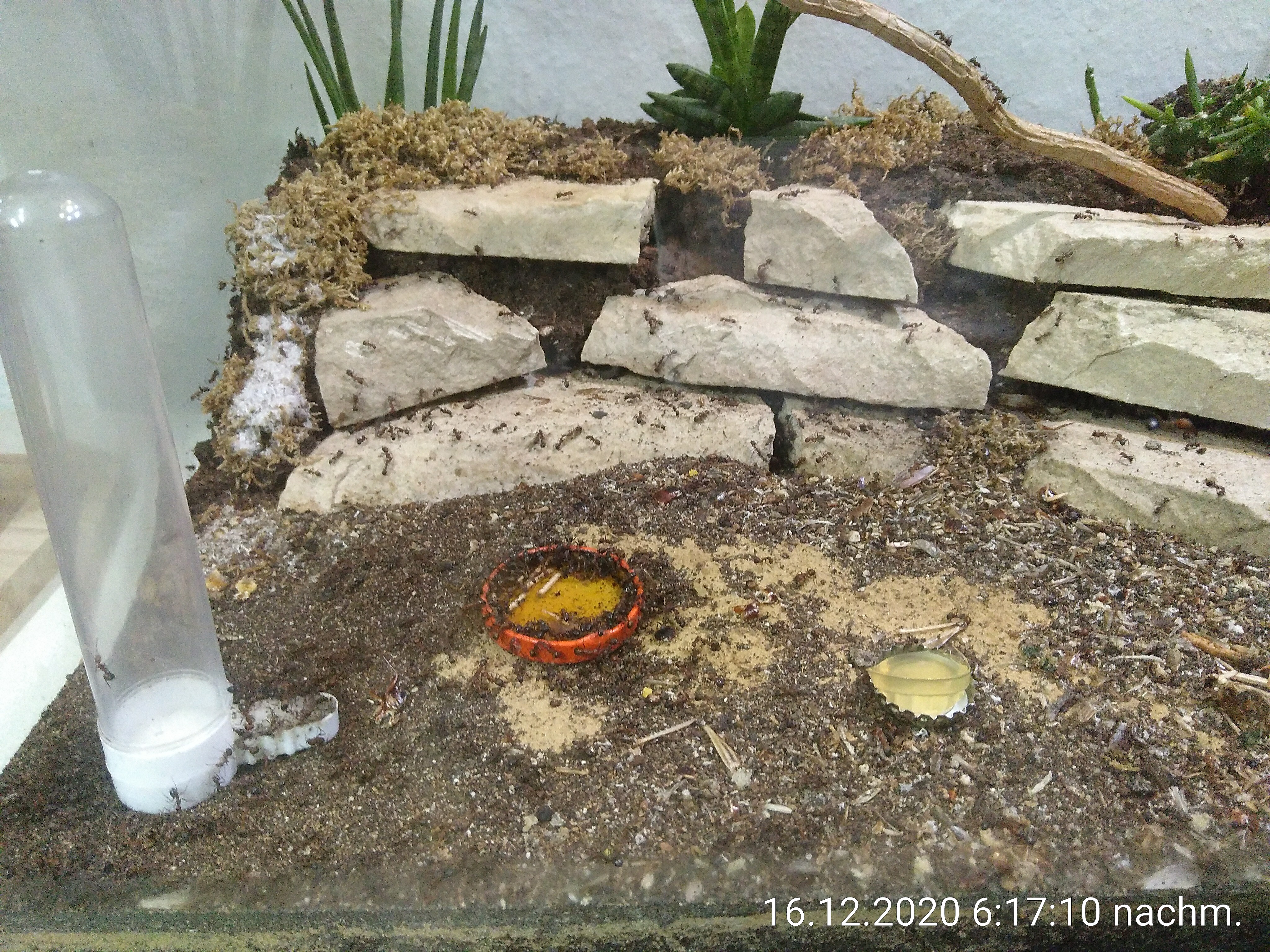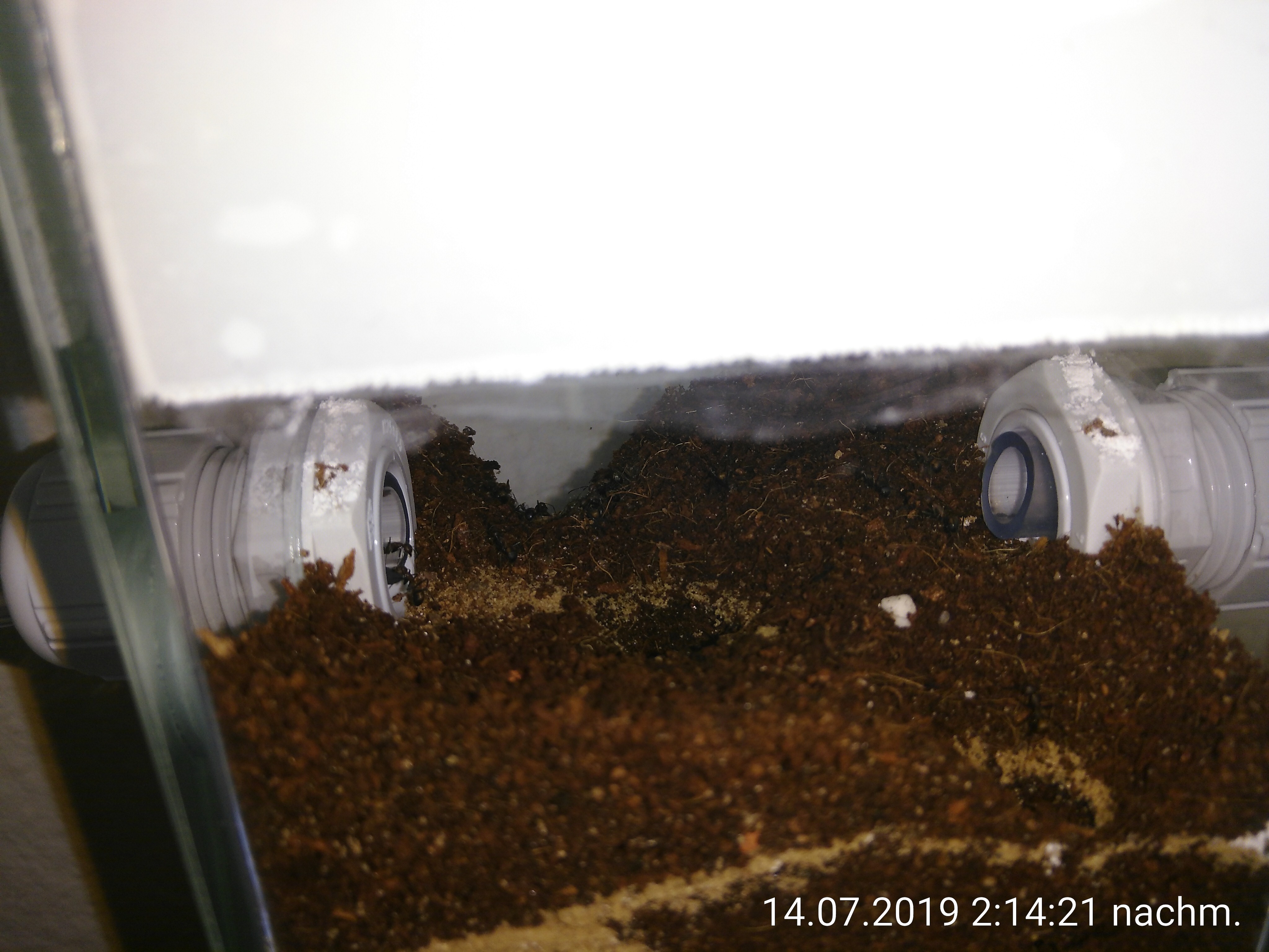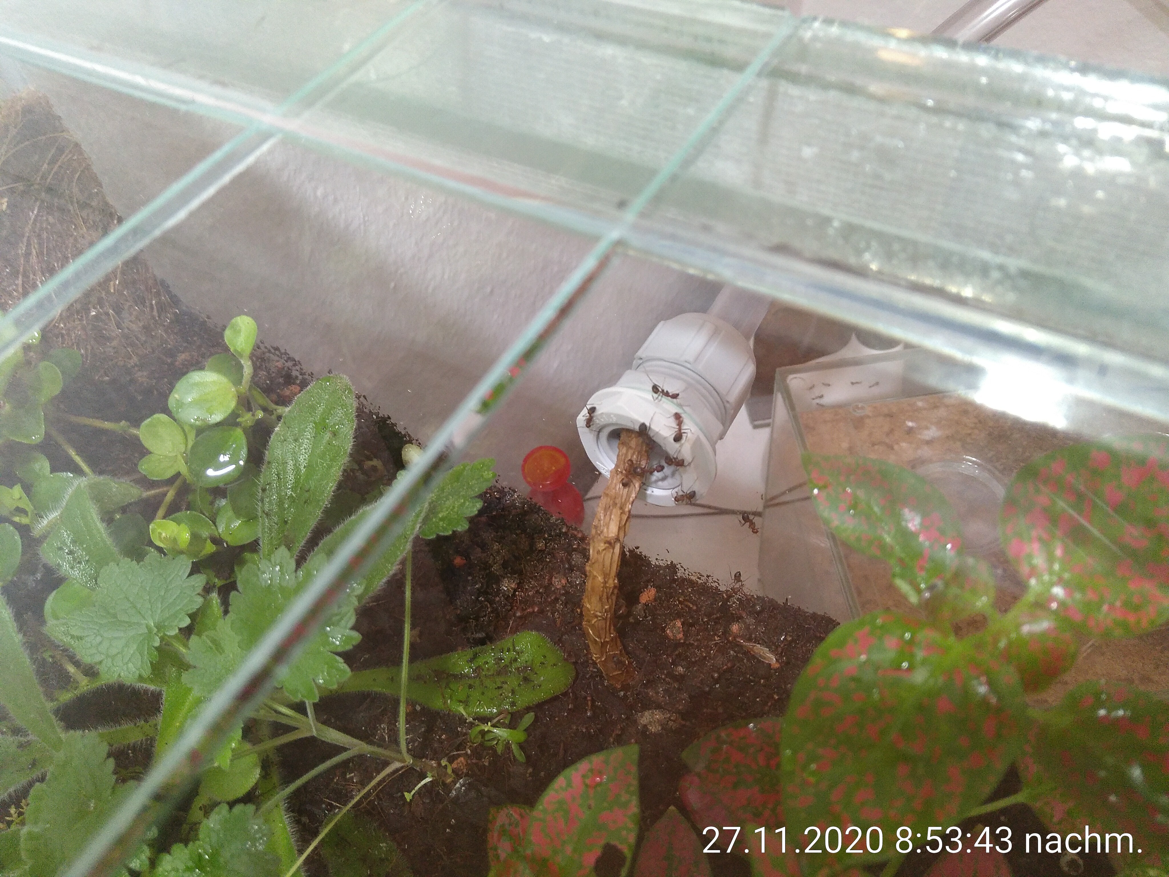 Erstmal zum Wasser. Das haben sie natürlich immer unbegrenzt zur Verfügung. Und nach den ersten Monaten immer mindestens aus 2 unterschiedlichen Quellen. Zur Zeit gibt es Wasser an 4 Stellen. Am Anfang haben sie natürlich nicht viel gebraucht, da musste ich auch mal ein Gläschen tauschen bevor es leer war. Das ist aber schon lange nicht mehr passiert. Im Moment ist die weiße Tränke vorne in der alten Arena ihr Favorit. Das muss ich ein bis zweimal in der Woche nachfüllen. Wenn der Wasserbedarf besonders hoch ist, befeuchten sie mal wieder ausgiebig das Nest. Das Gießen der Pflanzen übernehmen sie leider noch nicht. Das wäre aber mal ein anspruchsvolles Projekt. Hat jemand Erfahrungen in dieser Richtung? Landwirtschaft ist für Ameisen ja nichts Unbekanntes...