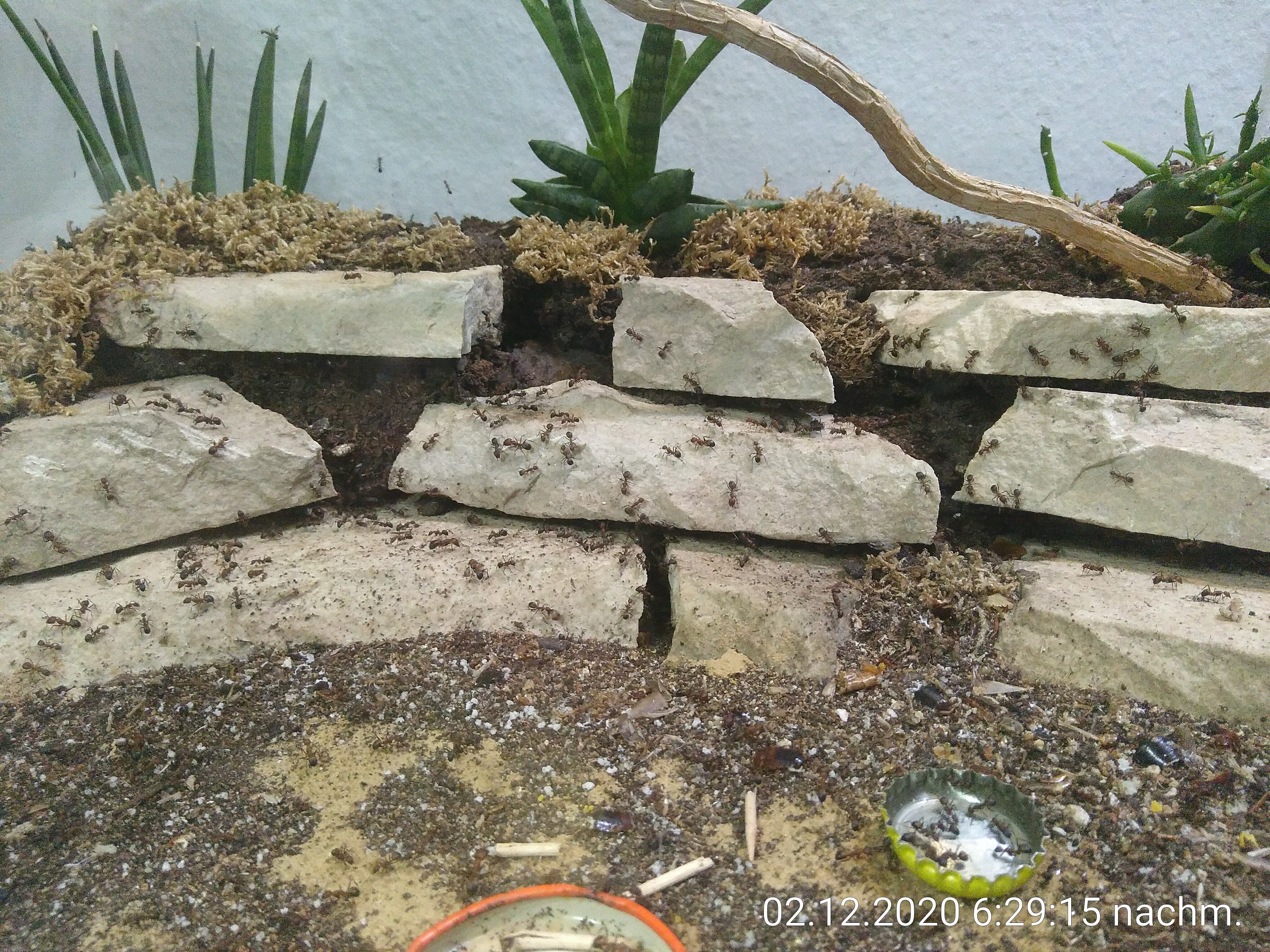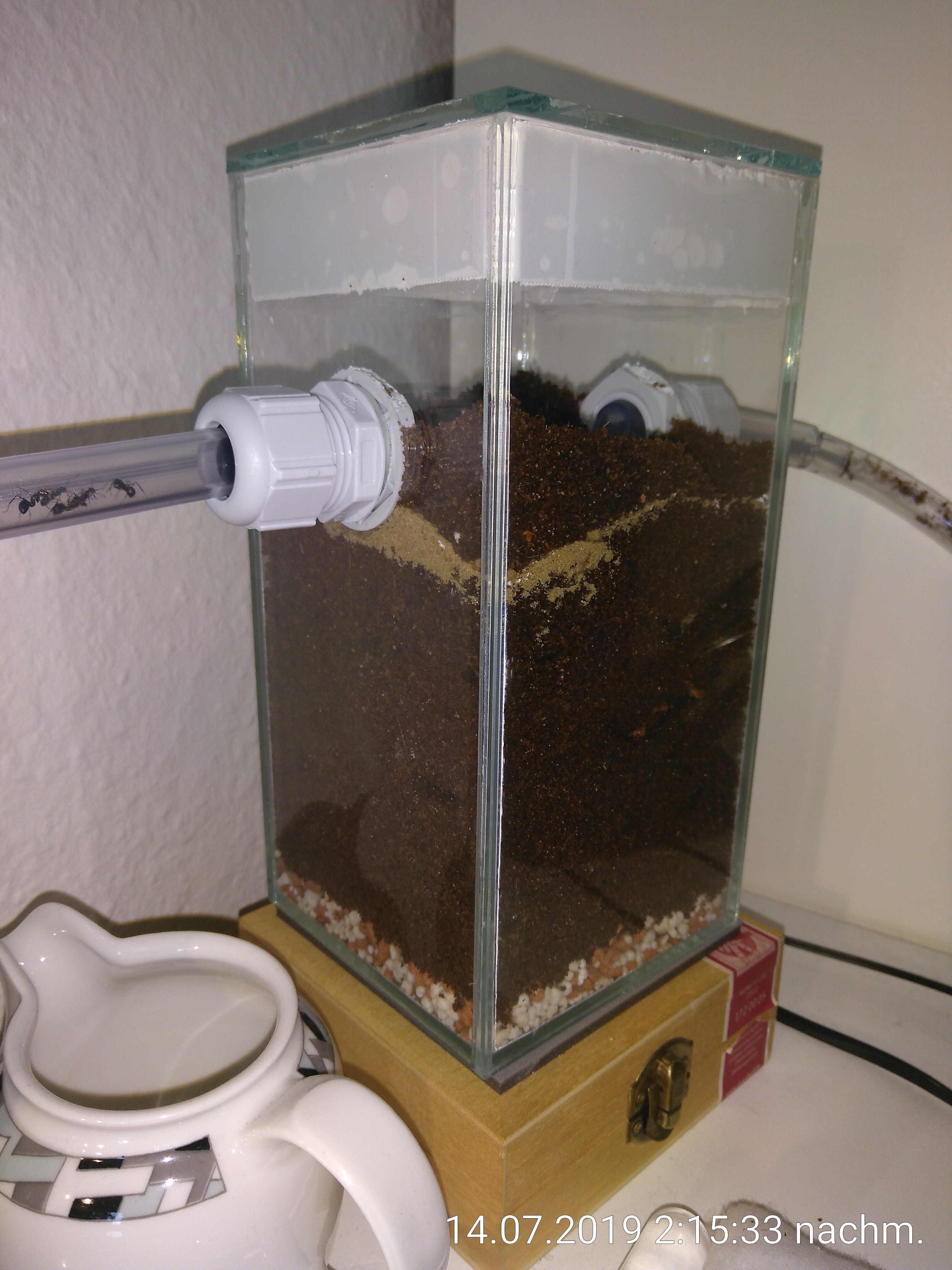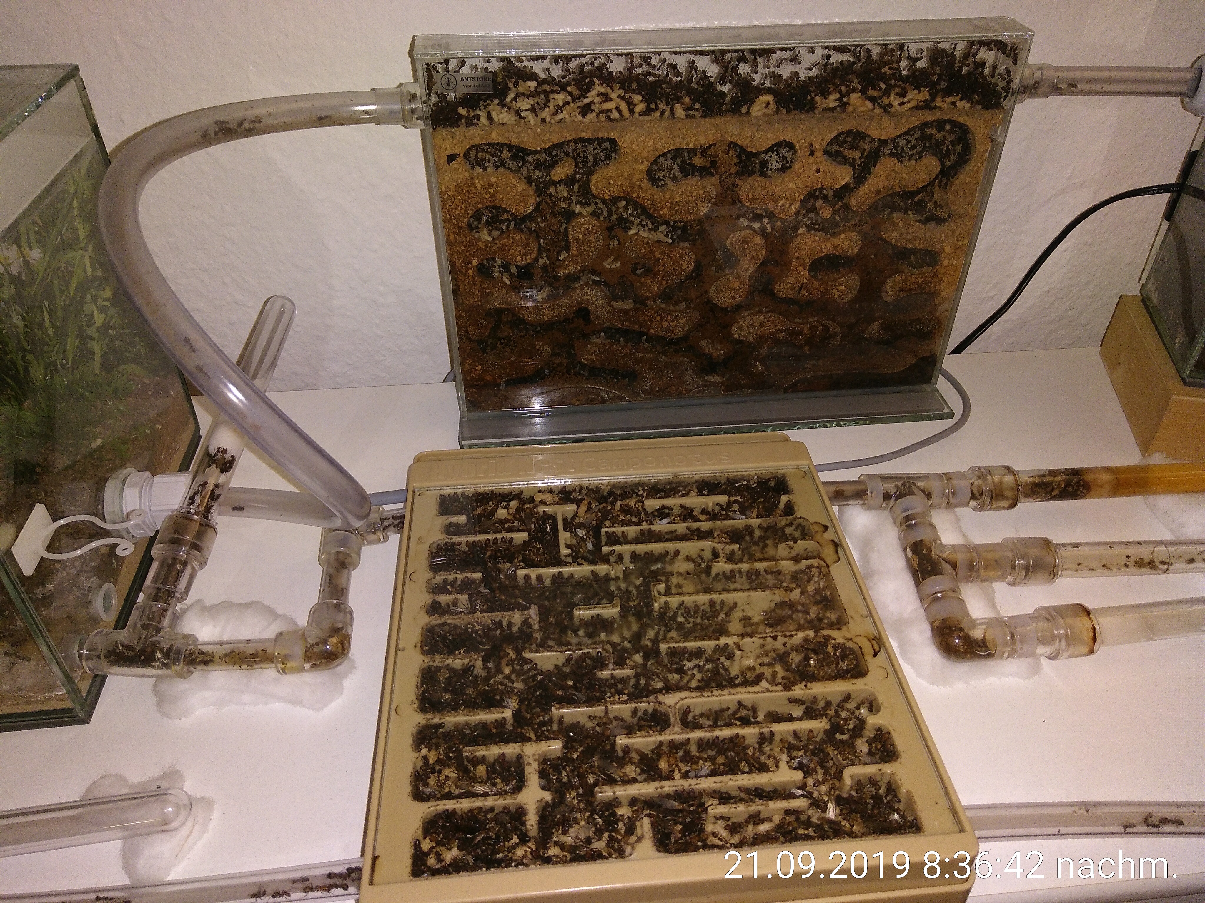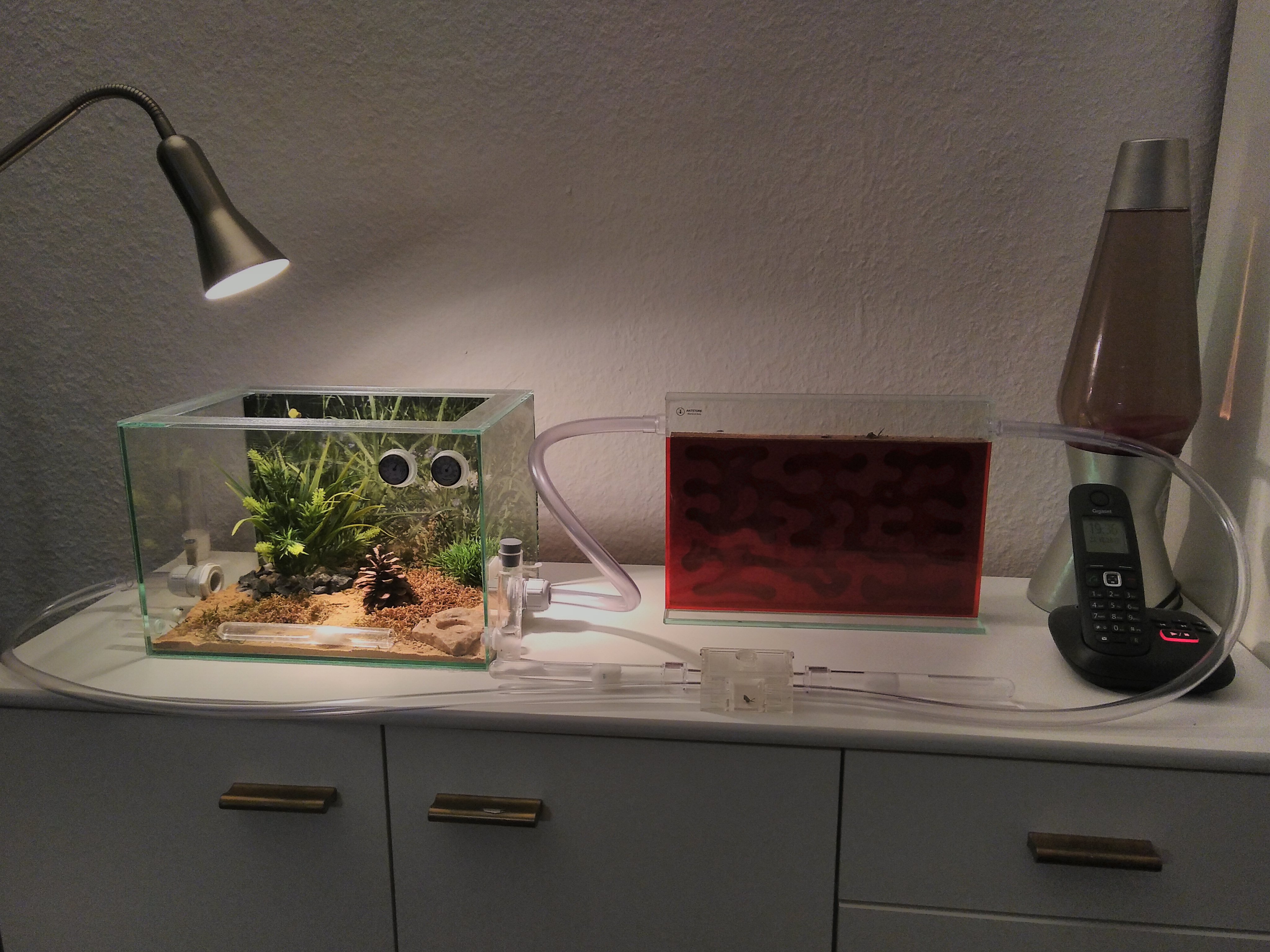 Erstmal zum Wasser. Das haben sie natürlich immer unbegrenzt zur Verfügung. Und nach den ersten Monaten immer mindestens aus 2 unterschiedlichen Quellen. Zur Zeit gibt es Wasser an 4 Stellen. Am Anfang haben sie natürlich nicht viel gebraucht, da musste ich auch mal ein Gläschen tauschen bevor es leer war. Das ist aber schon lange nicht mehr passiert. Im Moment ist die weiße Tränke vorne in der alten Arena ihr Favorit. Das muss ich ein bis zweimal in der Woche nachfüllen. Wenn der Wasserbedarf besonders hoch ist, befeuchten sie mal wieder ausgiebig das Nest. Das Gießen der Pflanzen übernehmen sie leider noch nicht. Das wäre aber mal ein anspruchsvolles Projekt. Hat jemand Erfahrungen in dieser Richtung? Landwirtschaft ist für Ameisen ja nichts Unbekanntes...