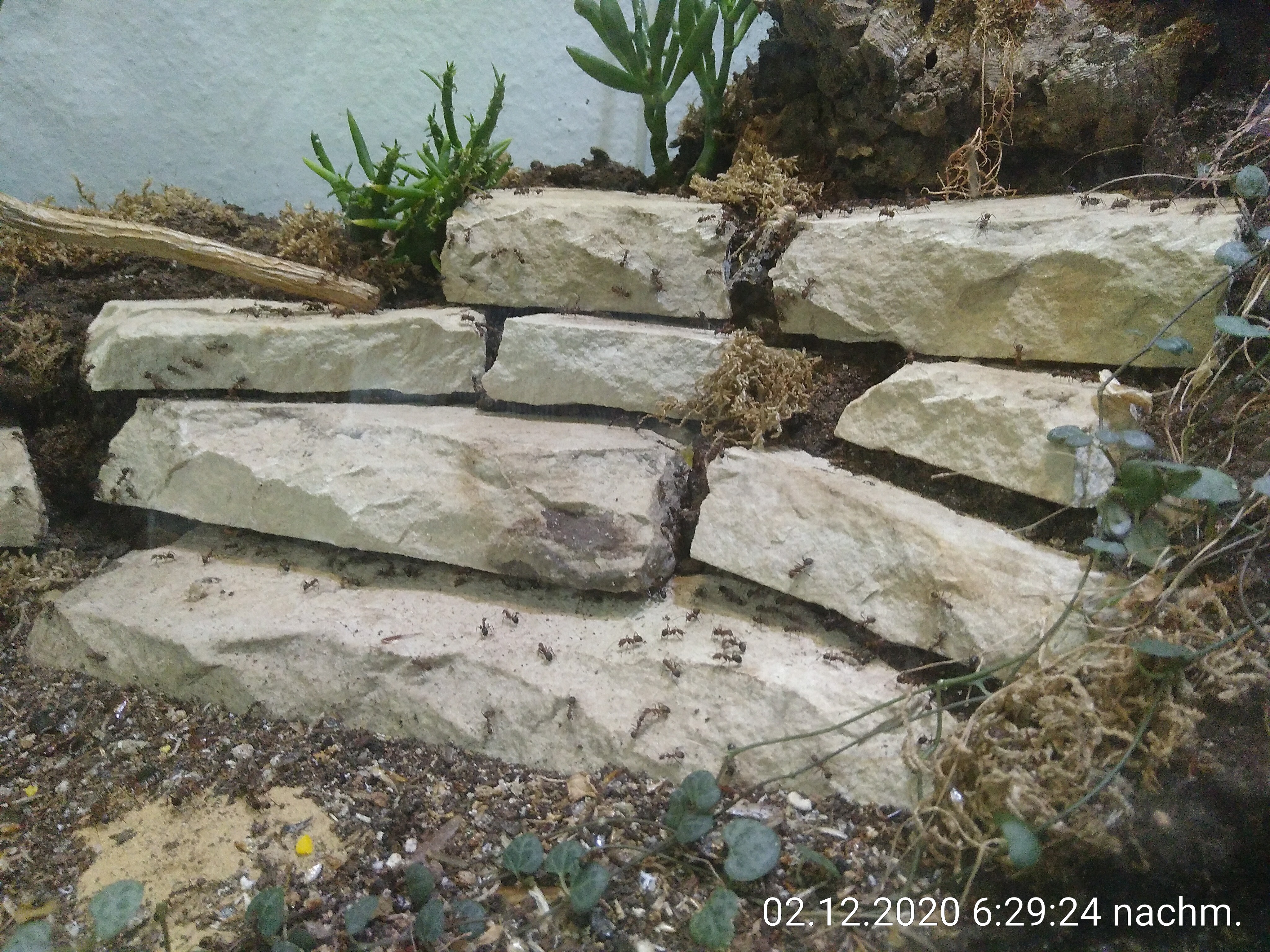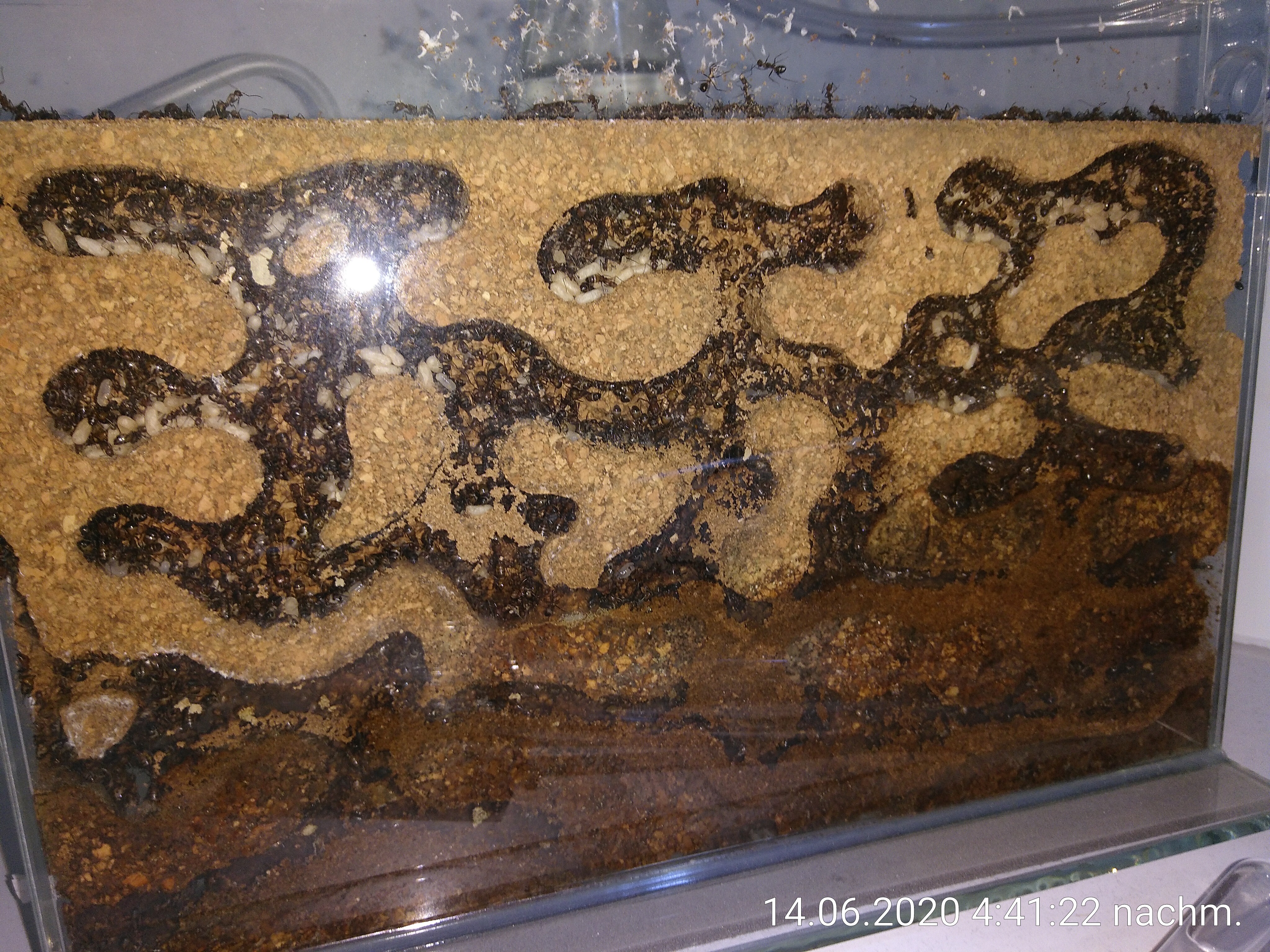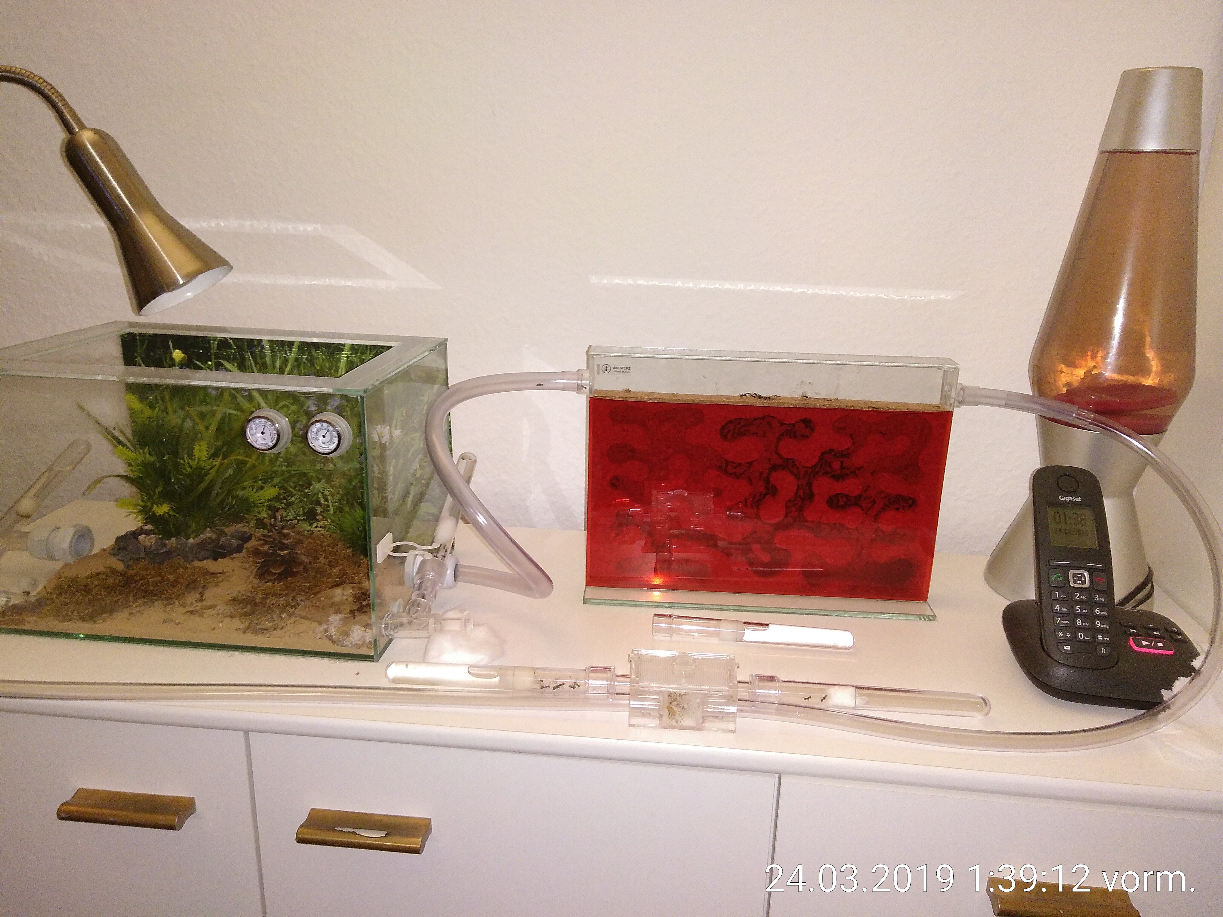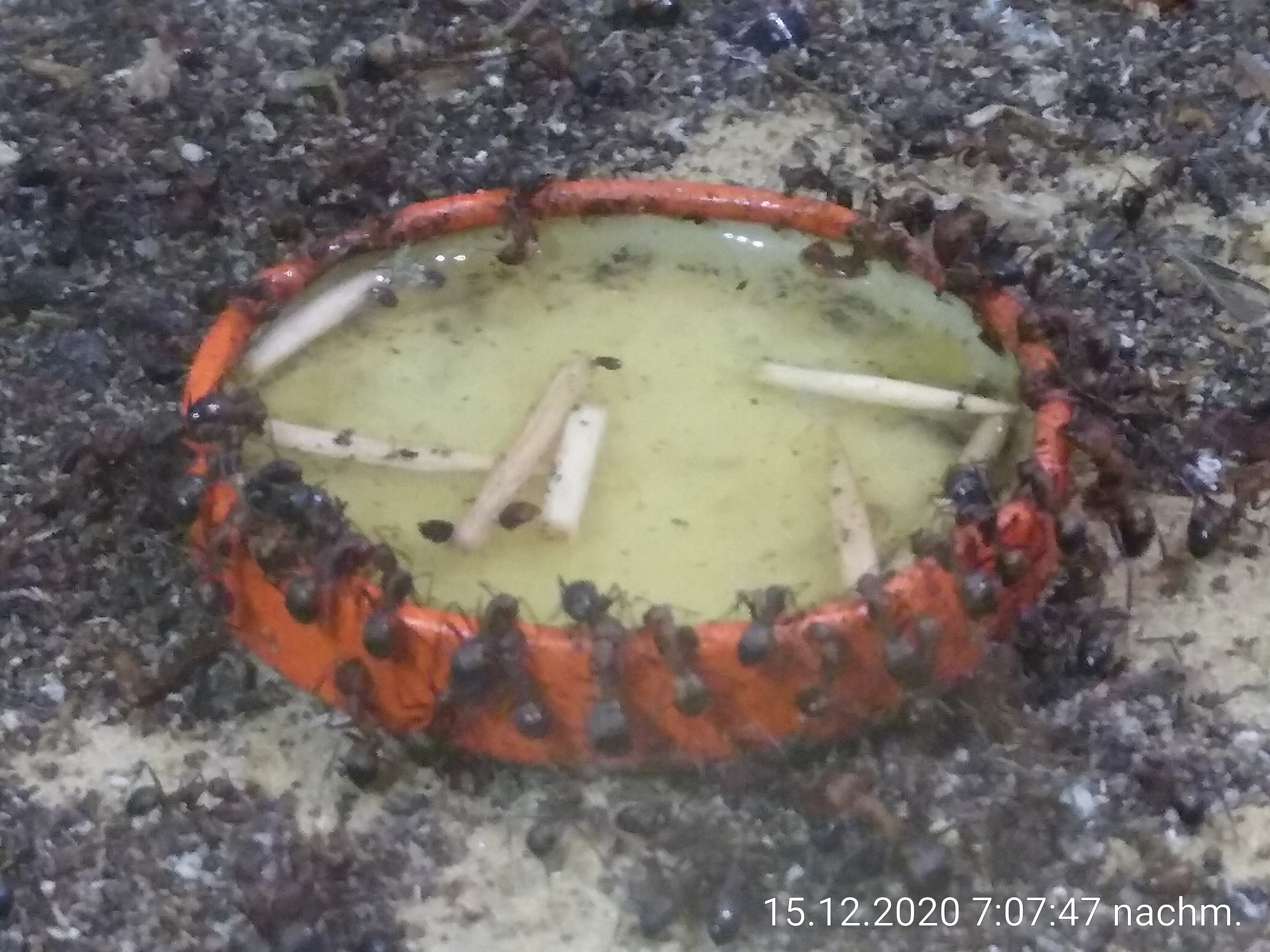 Erstmal zum Wasser. Das haben sie natürlich immer unbegrenzt zur Verfügung. Und nach den ersten Monaten immer mindestens aus 2 unterschiedlichen Quellen. Zur Zeit gibt es Wasser an 4 Stellen. Am Anfang haben sie natürlich nicht viel gebraucht, da musste ich auch mal ein Gläschen tauschen bevor es leer war. Das ist aber schon lange nicht mehr passiert. Im Moment ist die weiße Tränke vorne in der alten Arena ihr Favorit. Das muss ich ein bis zweimal in der Woche nachfüllen. Wenn der Wasserbedarf besonders hoch ist, befeuchten sie mal wieder ausgiebig das Nest. Das Gießen der Pflanzen übernehmen sie leider noch nicht. Das wäre aber mal ein anspruchsvolles Projekt. Hat jemand Erfahrungen in dieser Richtung? Landwirtschaft ist für Ameisen ja nichts Unbekanntes...